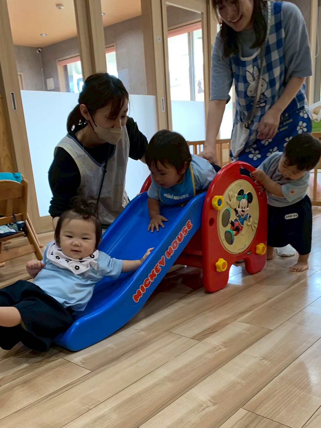 それから運動会の親子遊戯やハイハイレースの練習をし、その後は大好きな滑り台やトンネル、マット遊びをして身体をいっぱい動かして遊びました😃
