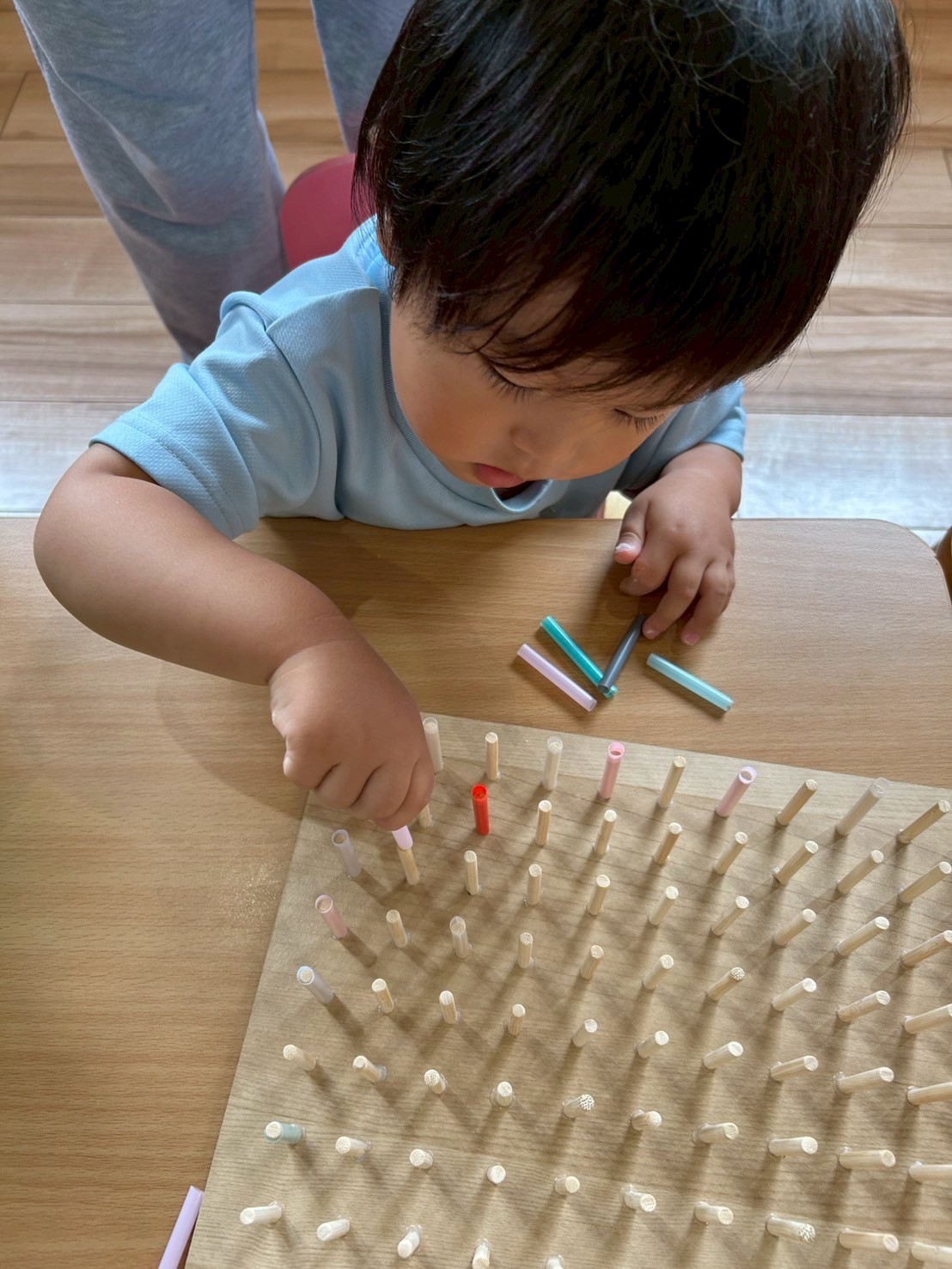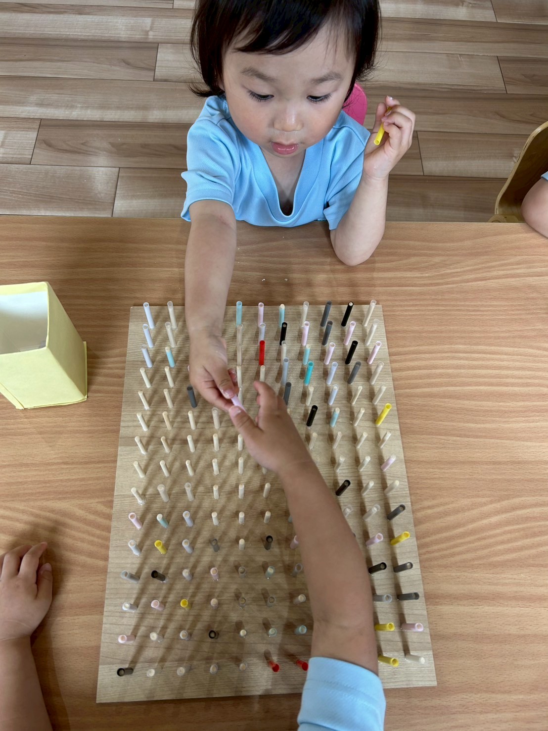 粘土遊びのあとは積み木や手先遊びをしました。手先遊びのストローはめはみんな無我夢中でしていましたよ😆