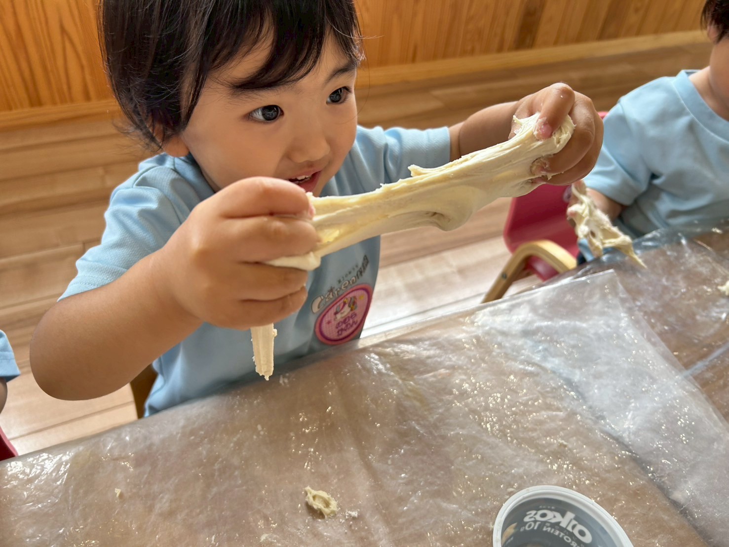誕生会の後は小麦粉粘土で遊びました。初めて触る感触に恐る恐る触りながら、おもちのように伸ばしたり、手についてる小麦粉粘土を頑張って取ったり、初めての小麦粉粘土遊びに悪戦苦闘しながら遊んでいたやまとくんでした😅