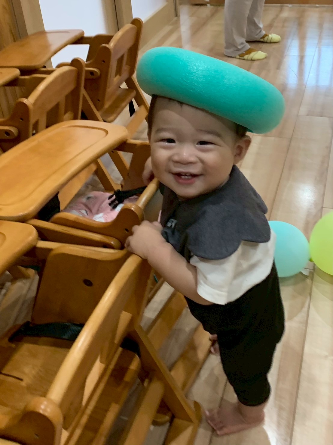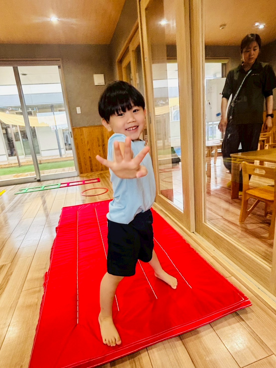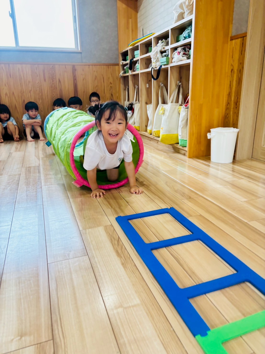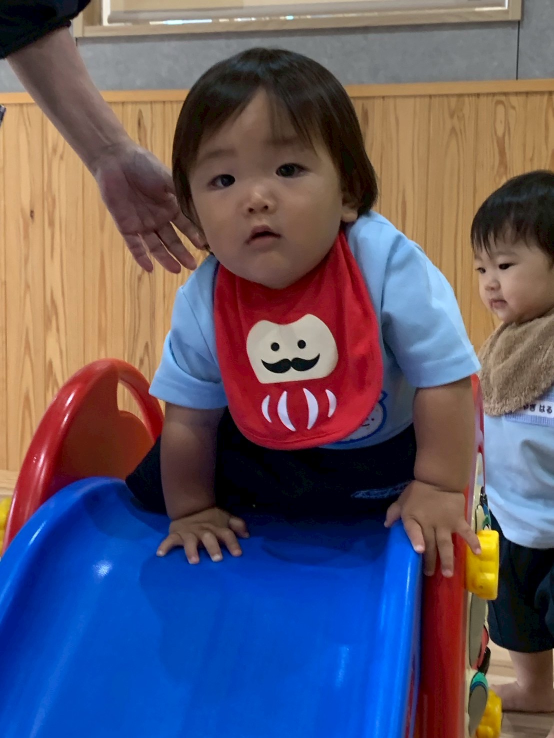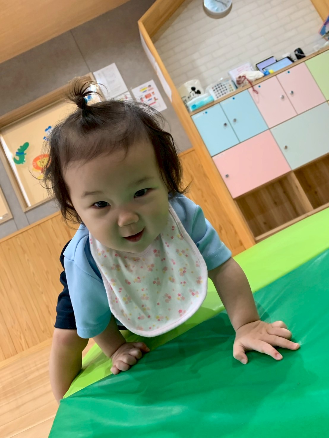 滑り台を順番に滑ったり、先生とマットの山を転がって、先生のお腹に乗って笑顔で楽しんでいました😆💕