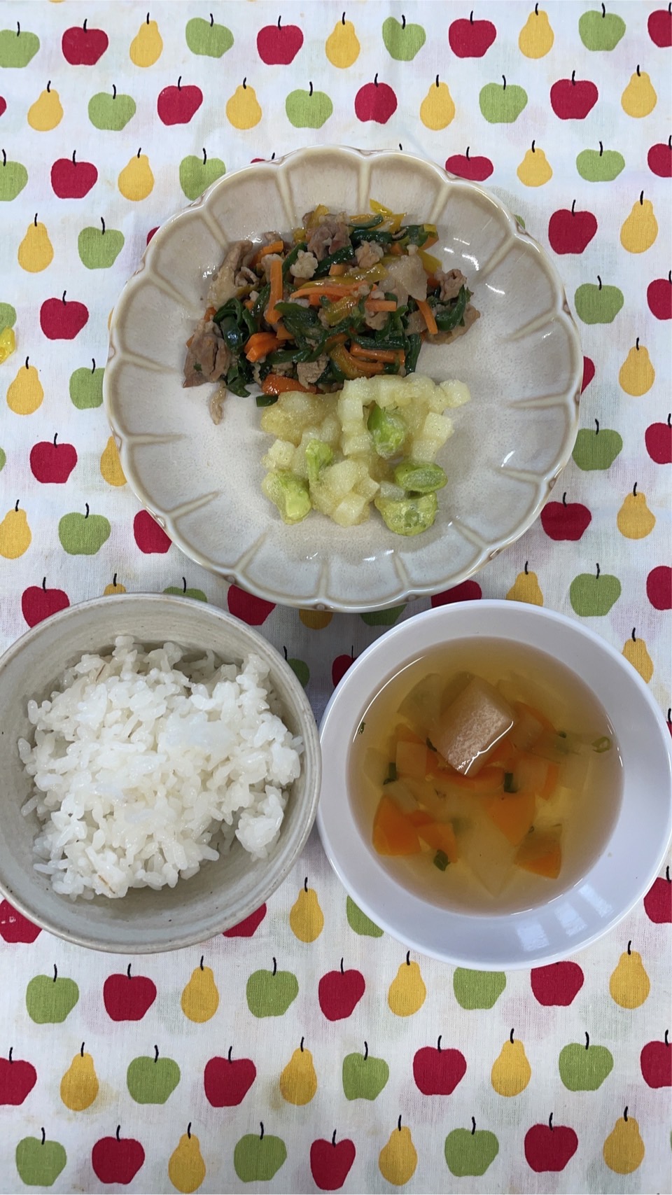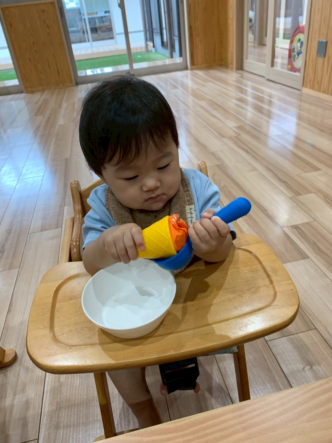 今日は新聞紙を丸めて色紙で包み、アイスのカップに乗せてアイスクリーム屋さんごっこをしました🍦大きなスプーンでアイスに見立てたボール?をすくい、カップやコーンにポコっと乗せて、アムアムと食べる真似をしたりして遊びましたよ❣️この動作がスプーンを持って食べる動作への練習になると良いなと思います✨