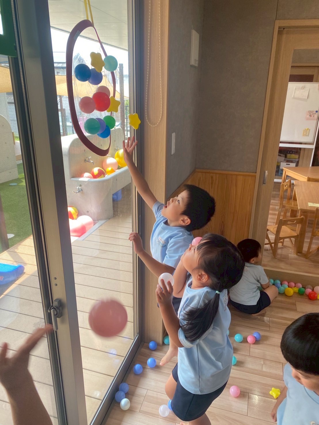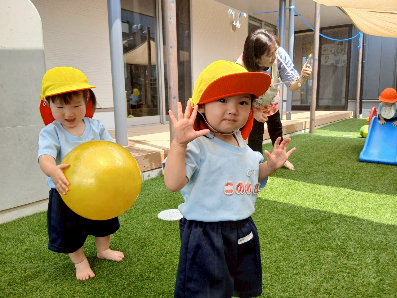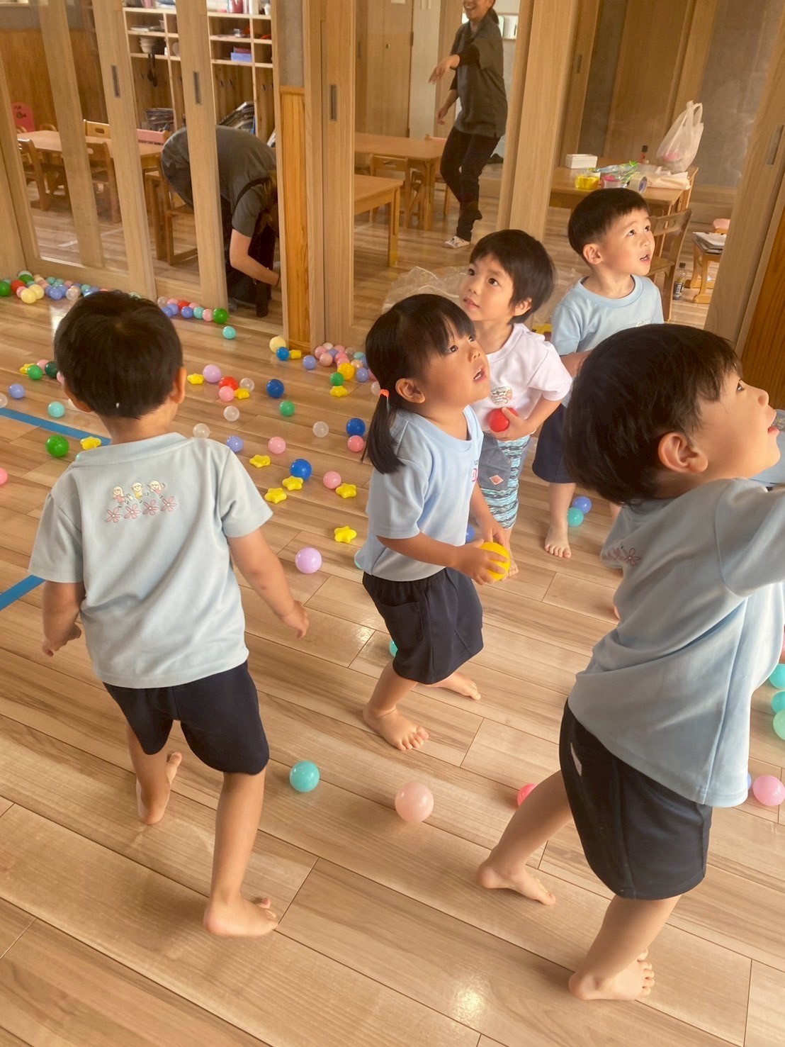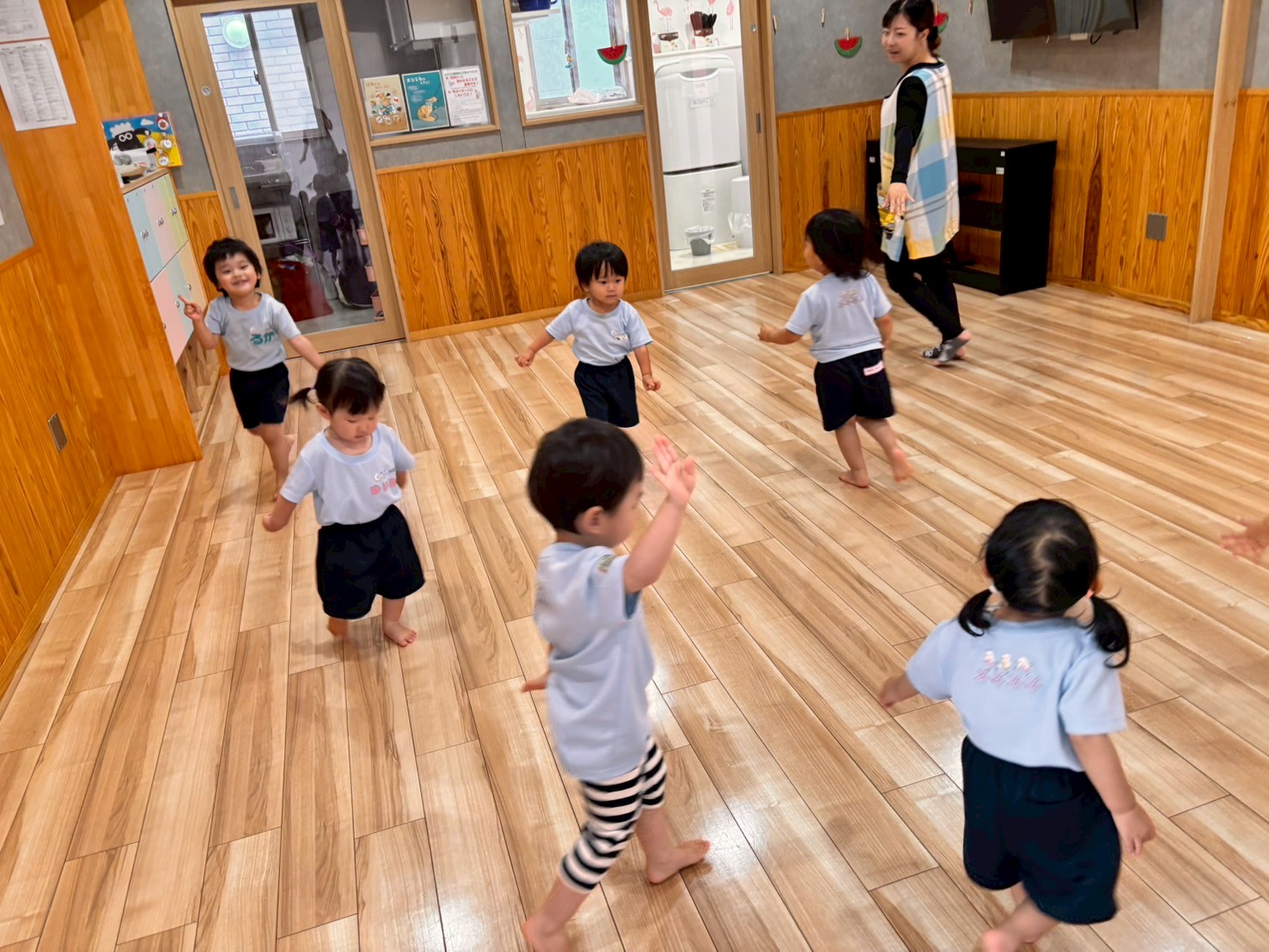 それからさくらんぼリズム🎵をしてリズムに乗って身体を動かしました❣️次の動作を覚えているお友だちもいましたよ😊難しかった動きも少しずつできるようになってきました✨それから園庭に出て、滑り台やボール、シャボン玉で遊びました💕先生がホースで水撒きをしてその水を浴びて楽しんでいましたよ🌈