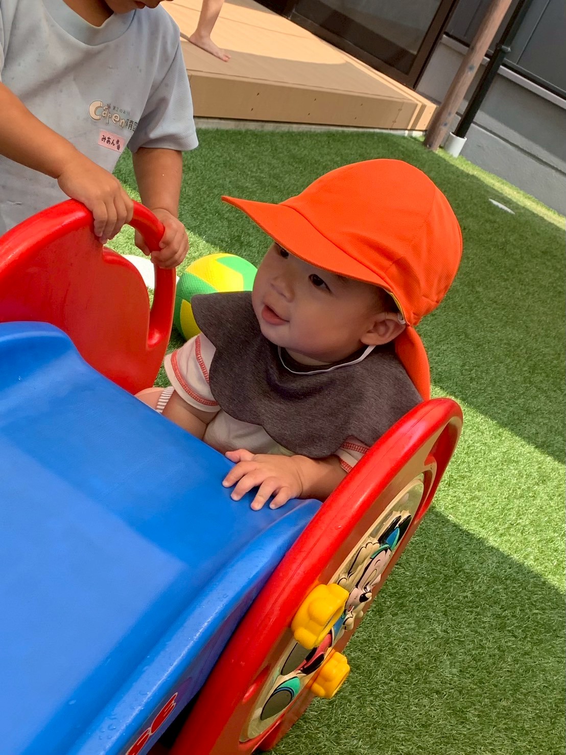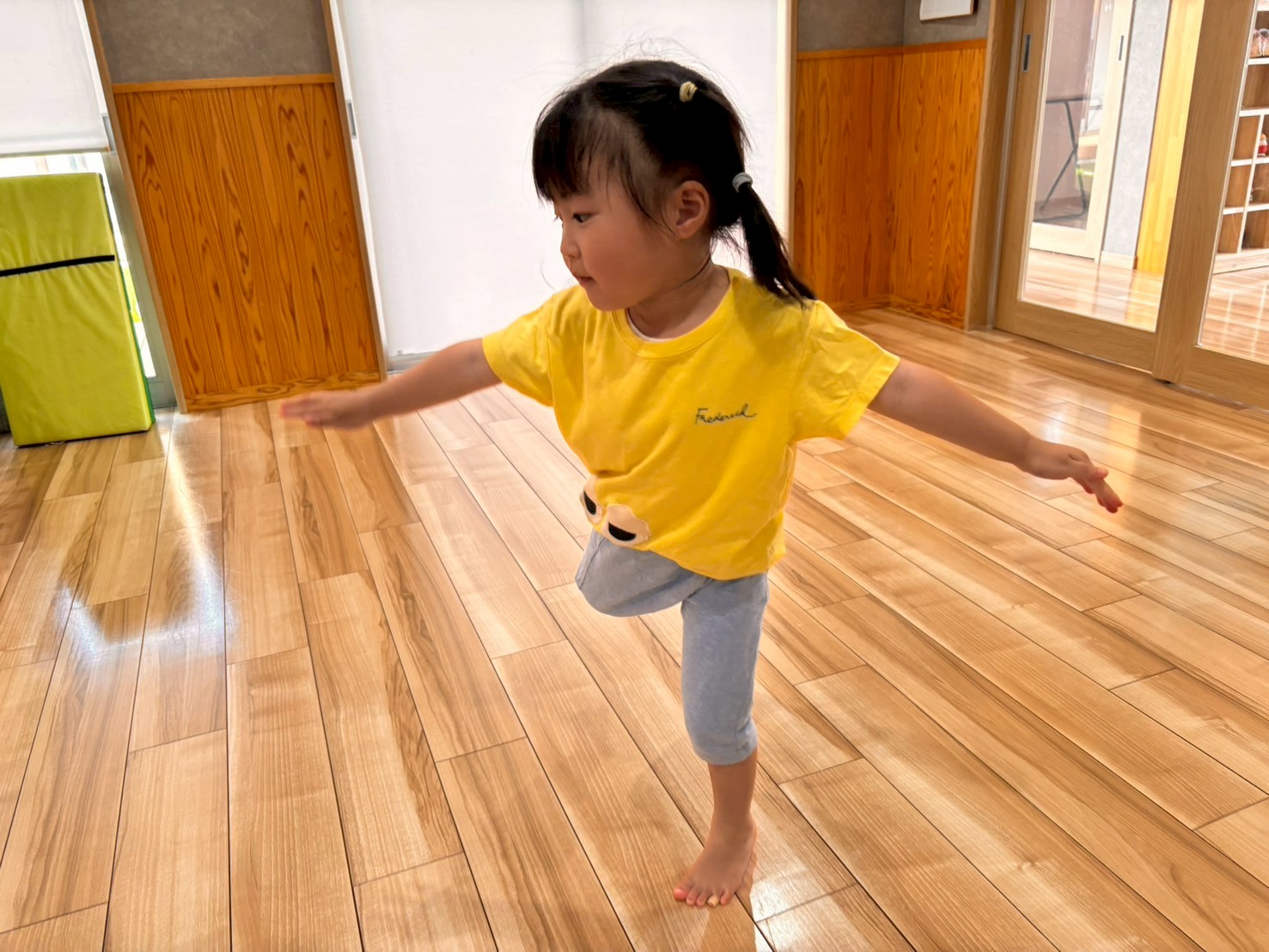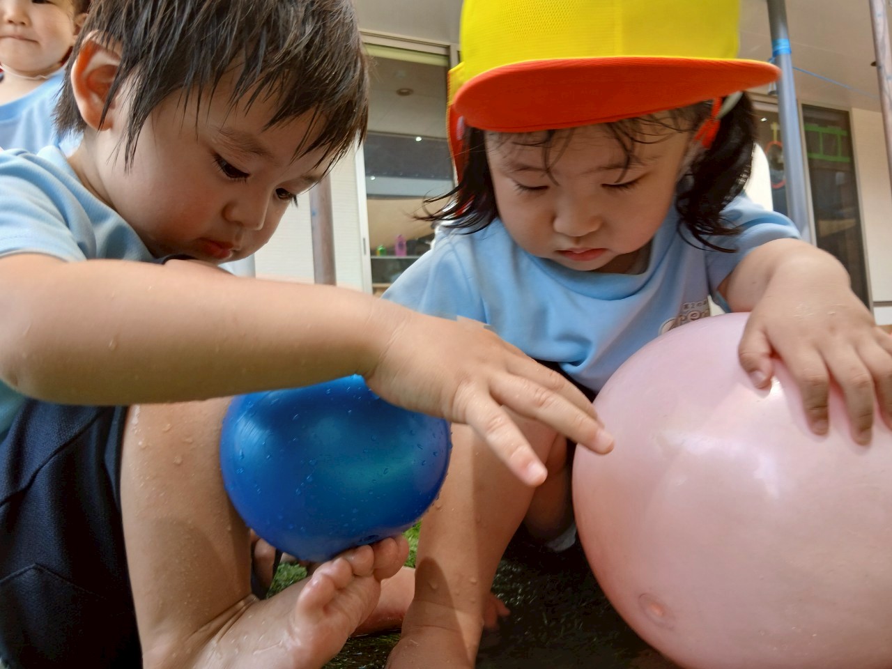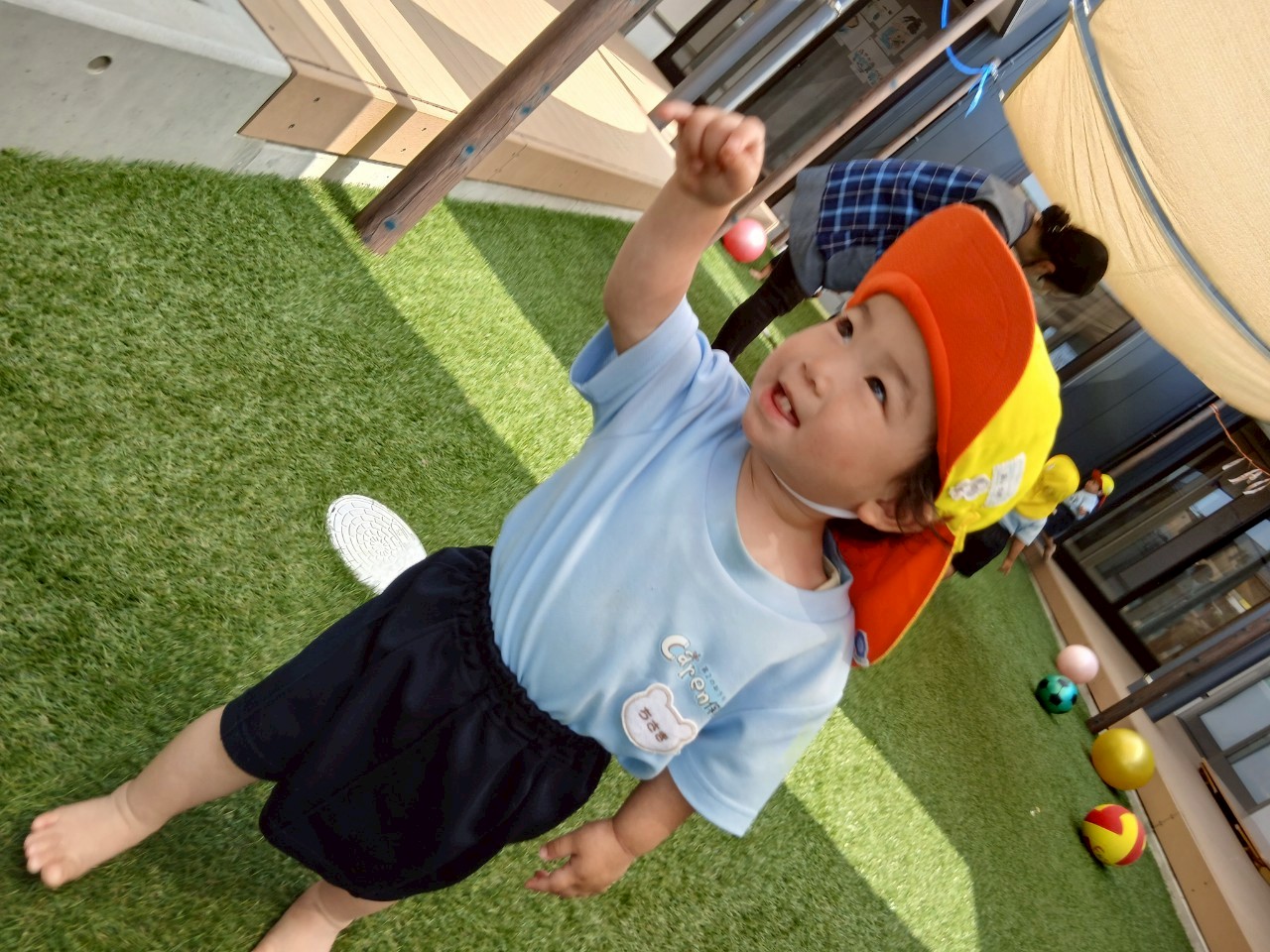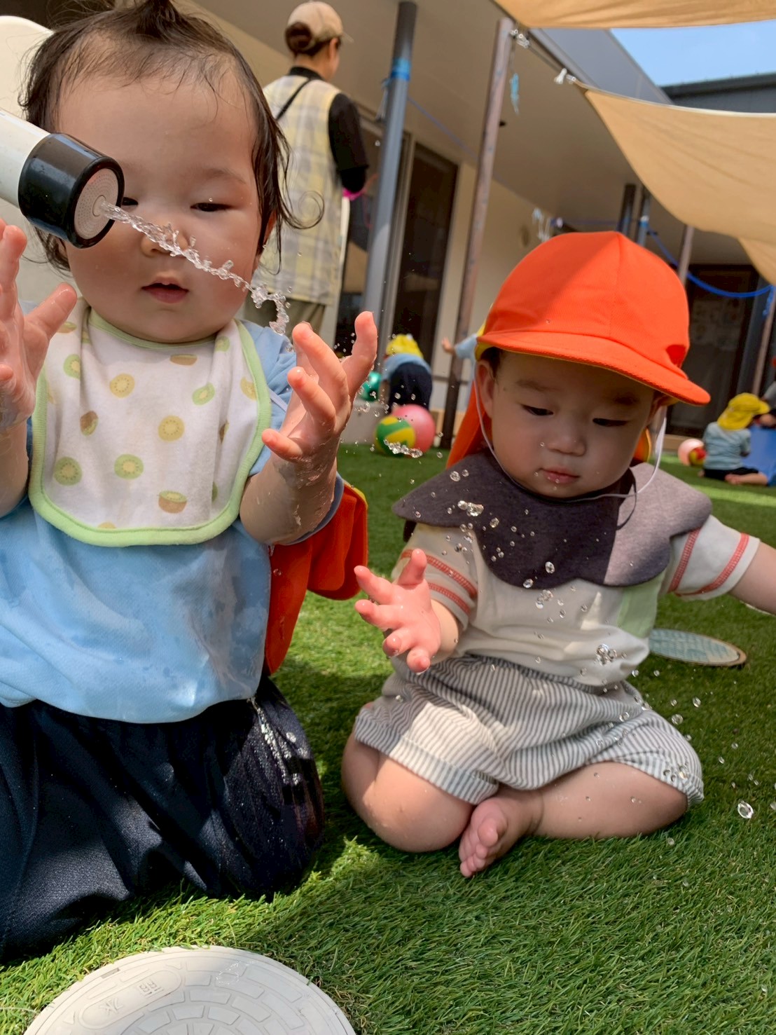 それからさくらんぼリズム🎵をしてリズムに乗って身体を動かしました❣️次の動作を覚えているお友だちもいましたよ😊難しかった動きも少しずつできるようになってきました✨それから園庭に出て、滑り台やボール、シャボン玉で遊びました💕先生がホースで水撒きをしてその水を浴びて楽しんでいましたよ🌈