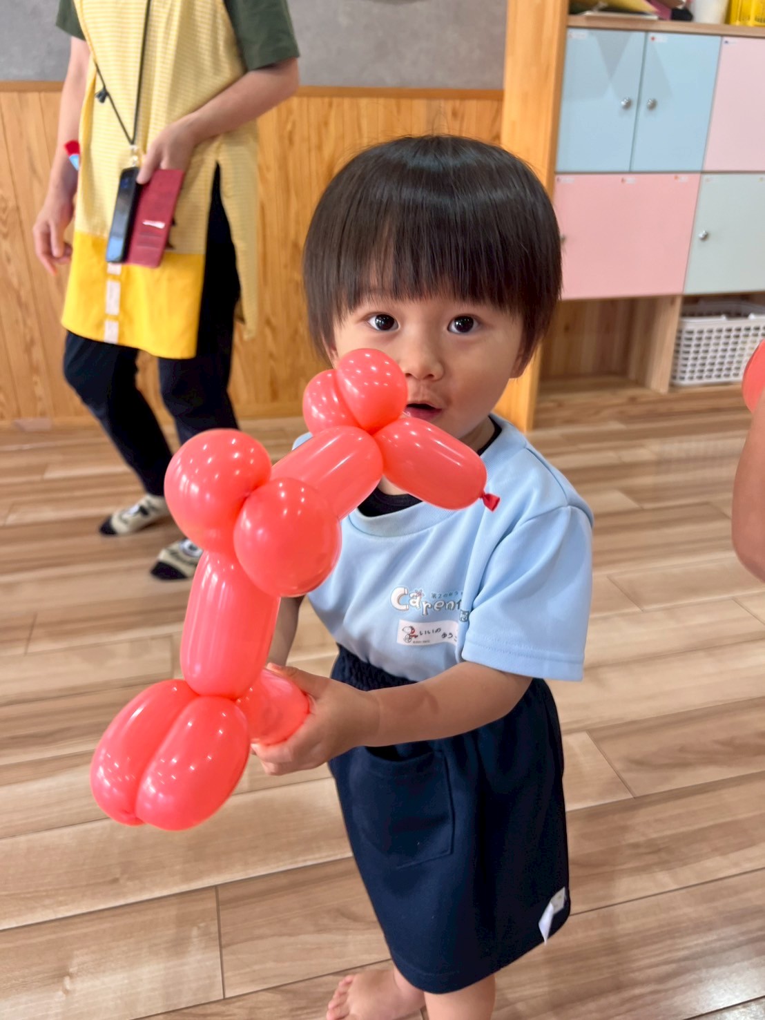 風船遊びでは、長い風船を使って自由に遊びを考えながら楽しむ姿がありました!先生から作ってもらった犬を散歩する姿も見られましたよ🐕