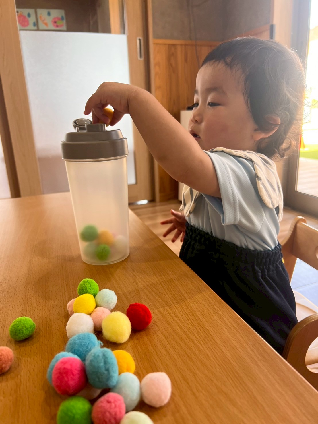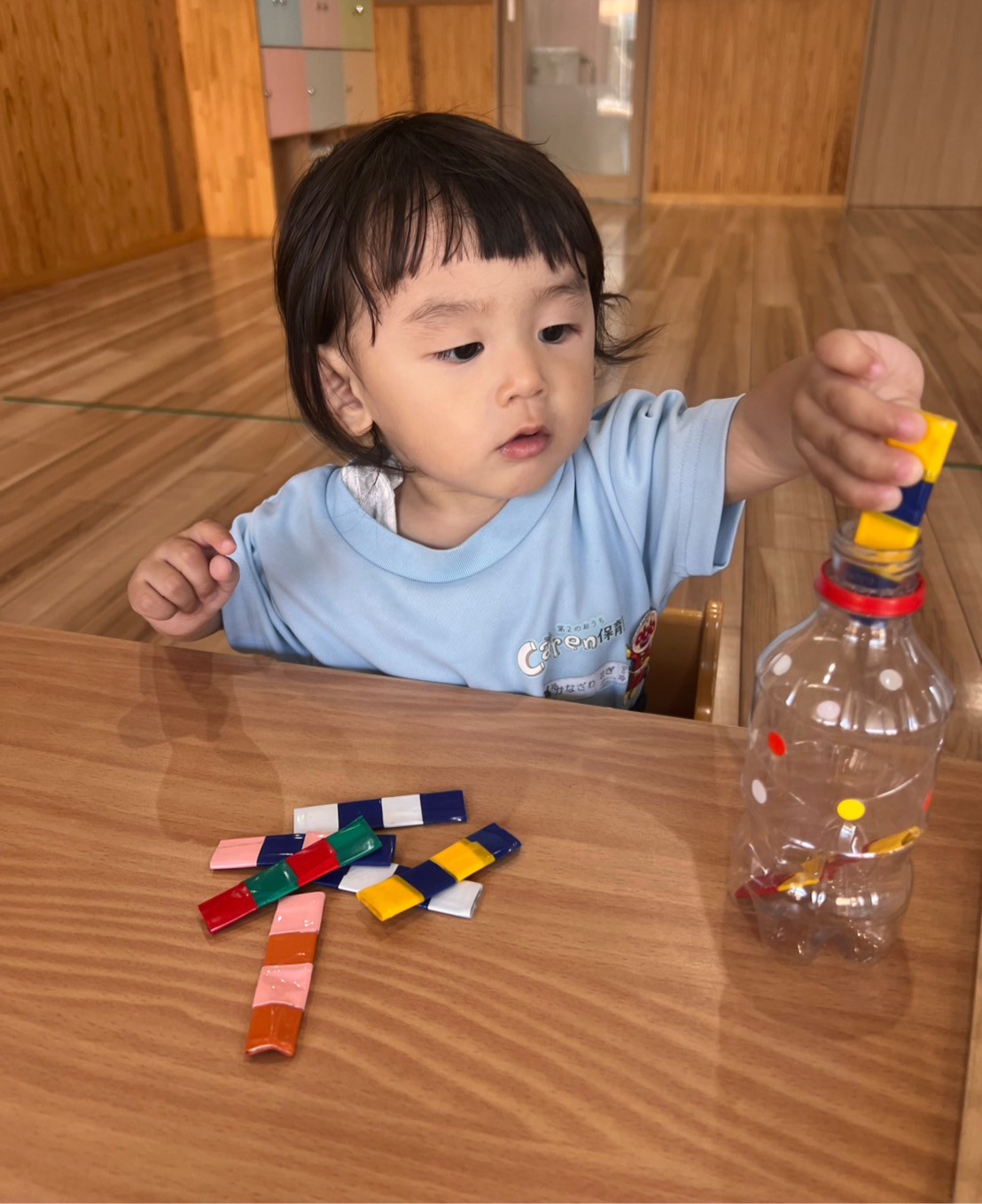 今日は室内で机上遊びをしました♪ストローさしやポットン落としでは、じっくり集中して取り組む姿が見られ、1つ終わった後に「もっとやりたい!」と身振りで教えてくれる子もいました😊