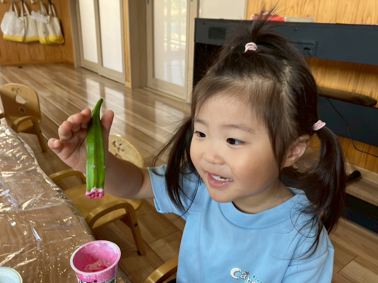 「ピンクがいい!」「青がいい!」と好きな色の絵の具を選んで楽しむ子ども達でした🥰