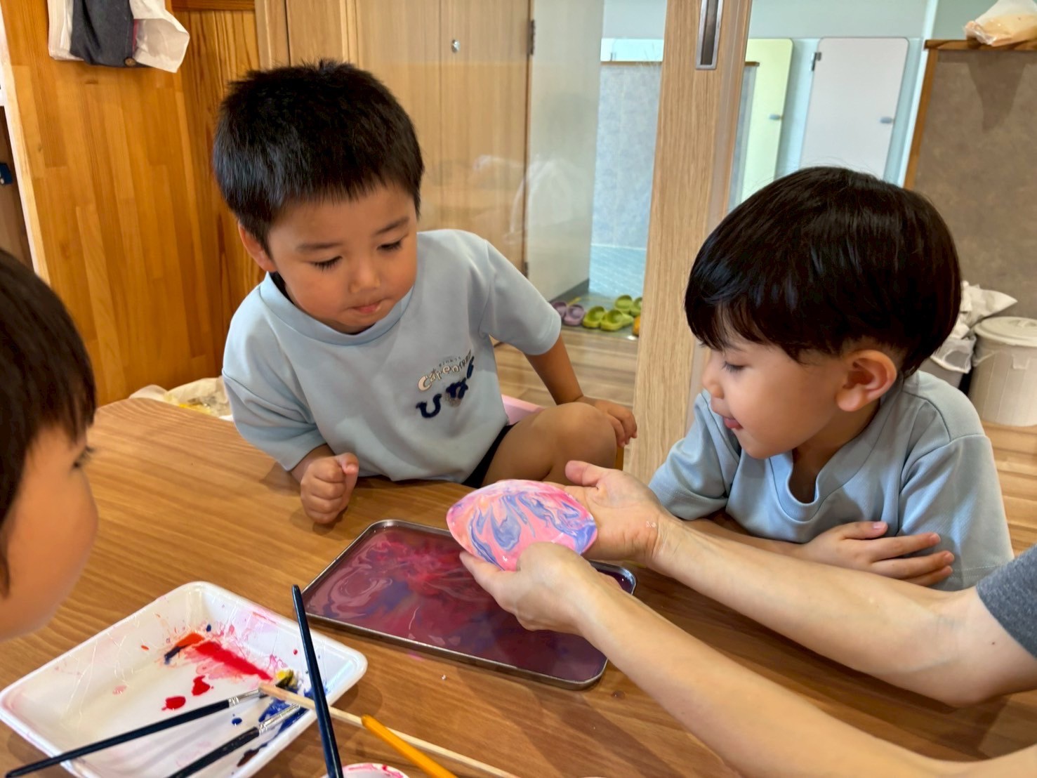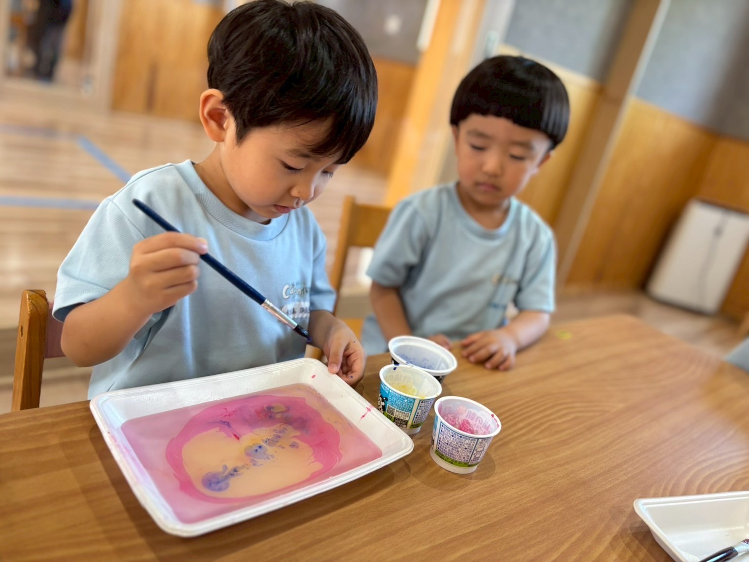 絵の具が重なり自分で割り箸で混ぜていくと綺麗な模様になり嬉しそうなこども達でした🥳