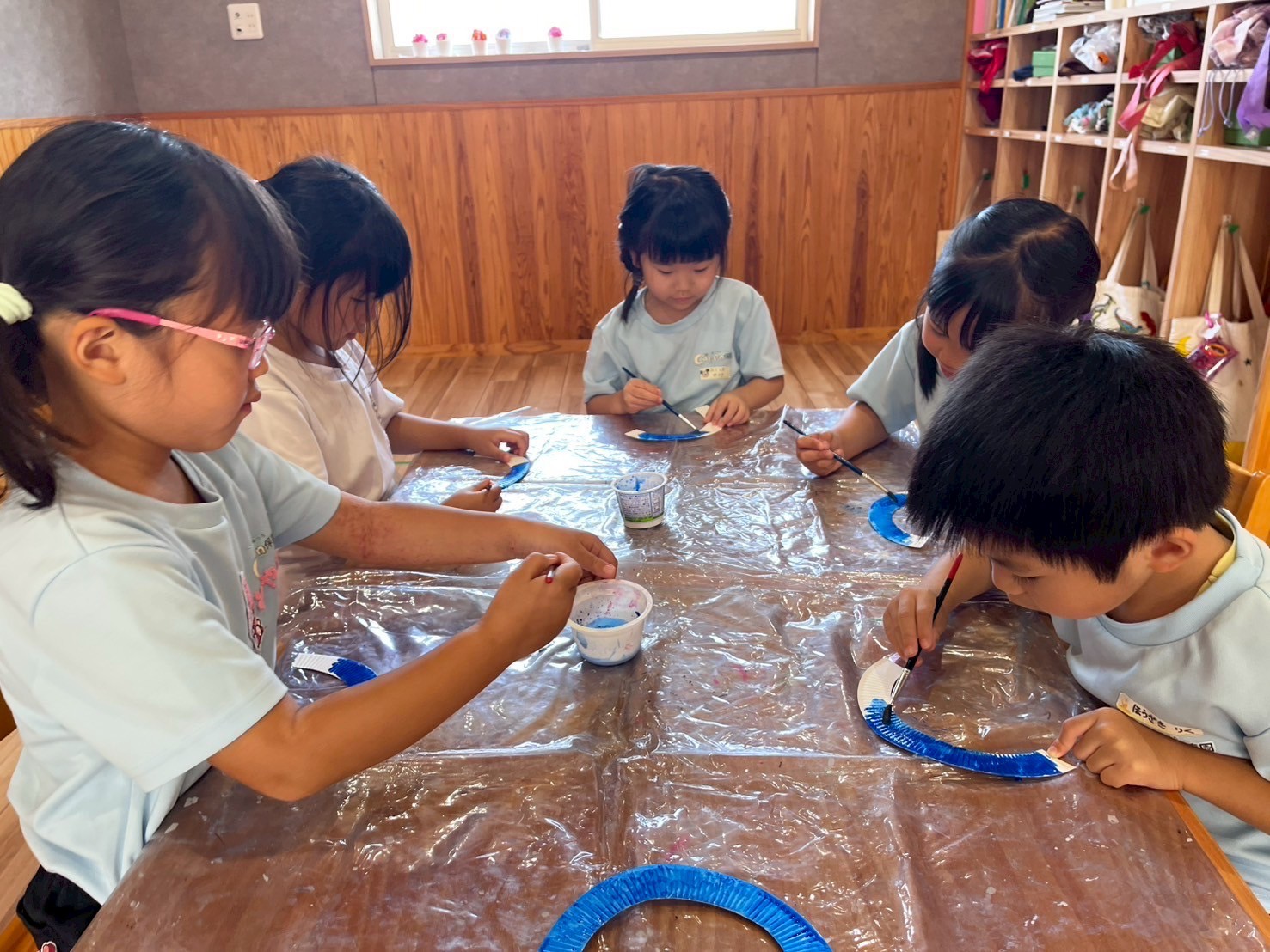 まずは七夕飾りの天の川に見立てて、紙皿を青の絵の具で塗りました🎨