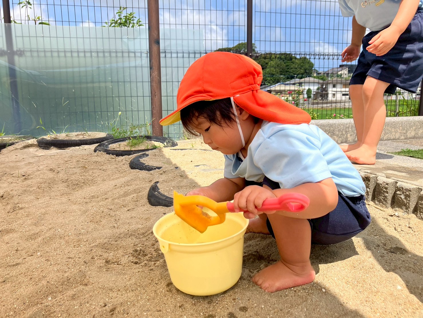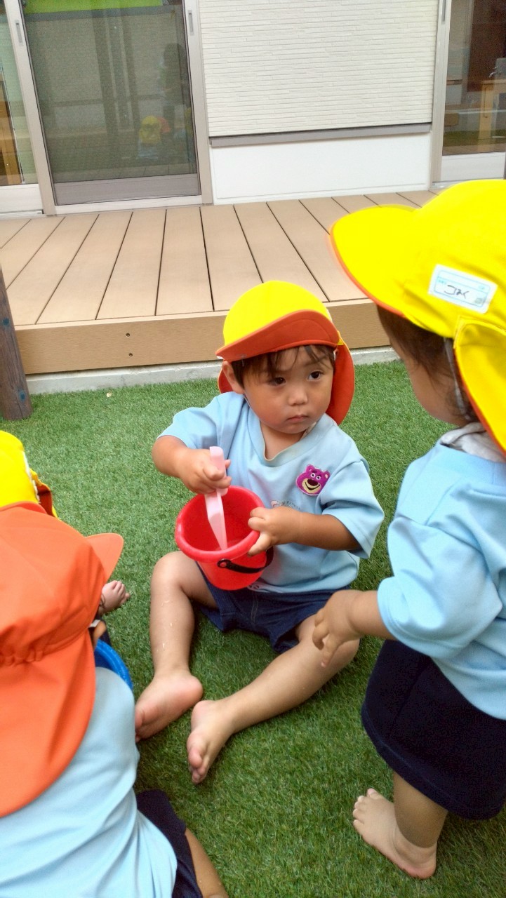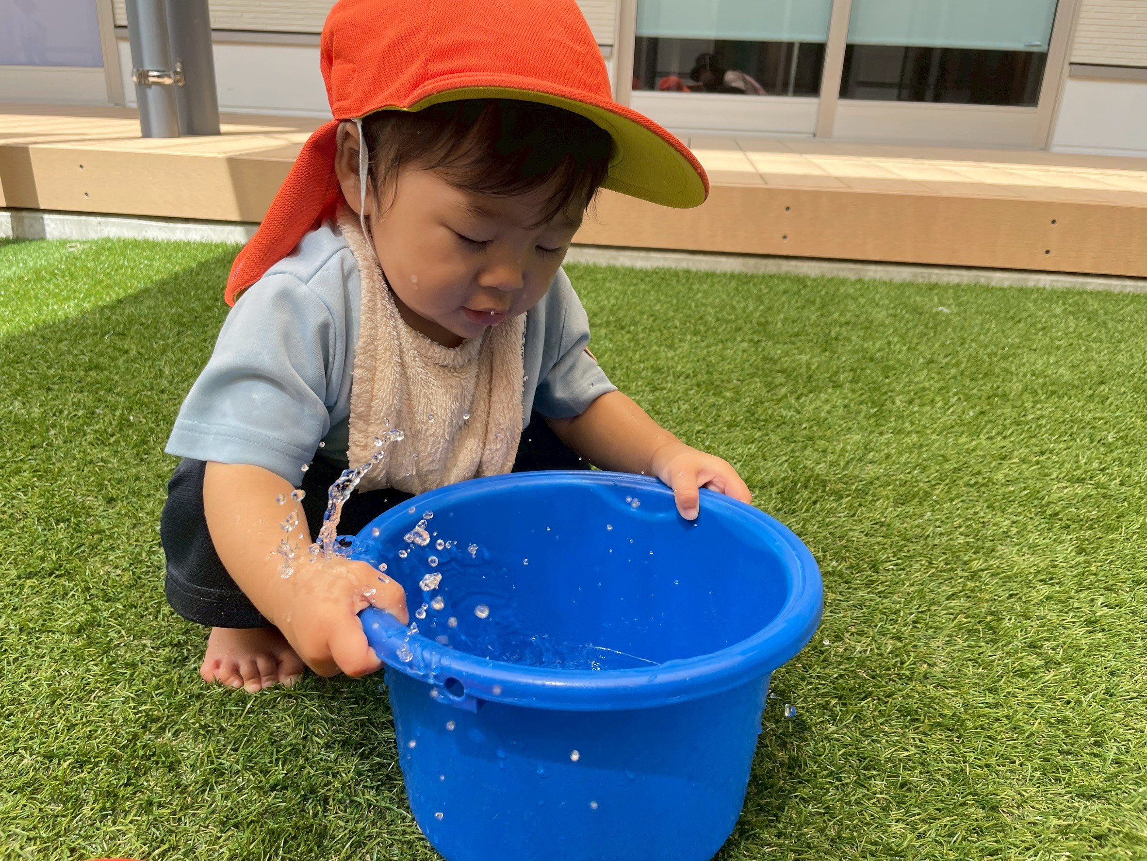 始めは手を入れてかき混ぜたり、スコップを使ったりして楽しんでいましたが、最後にはバケツの水を自分に向かってひっくり返して豪快に遊んでいましたよ✨