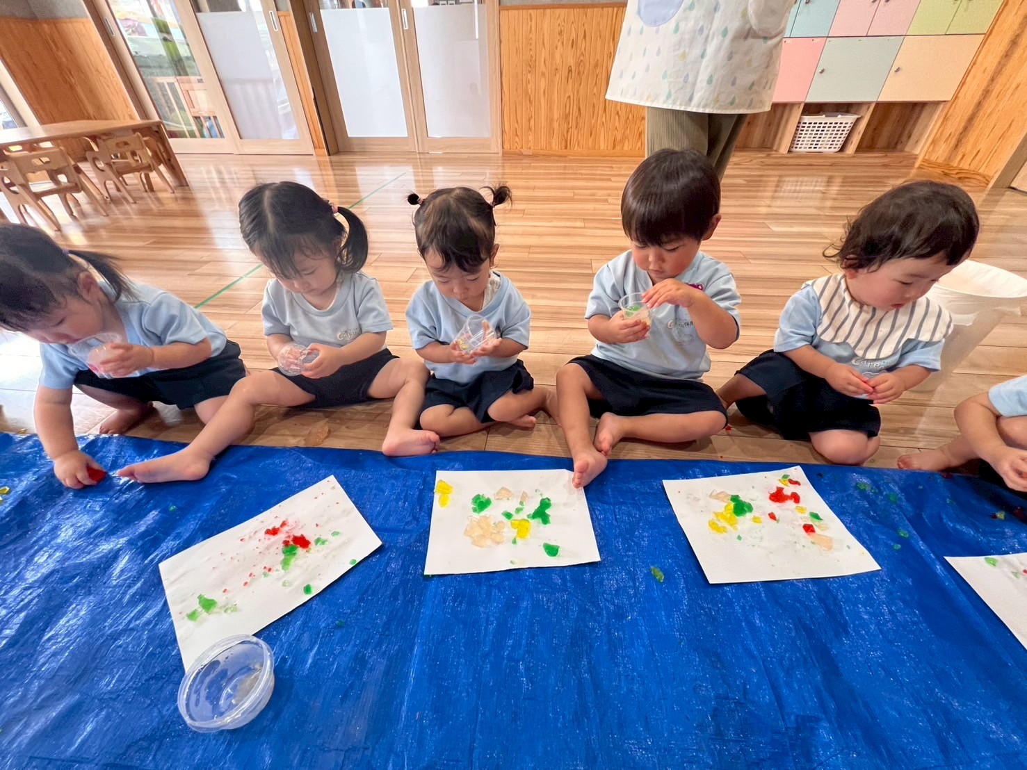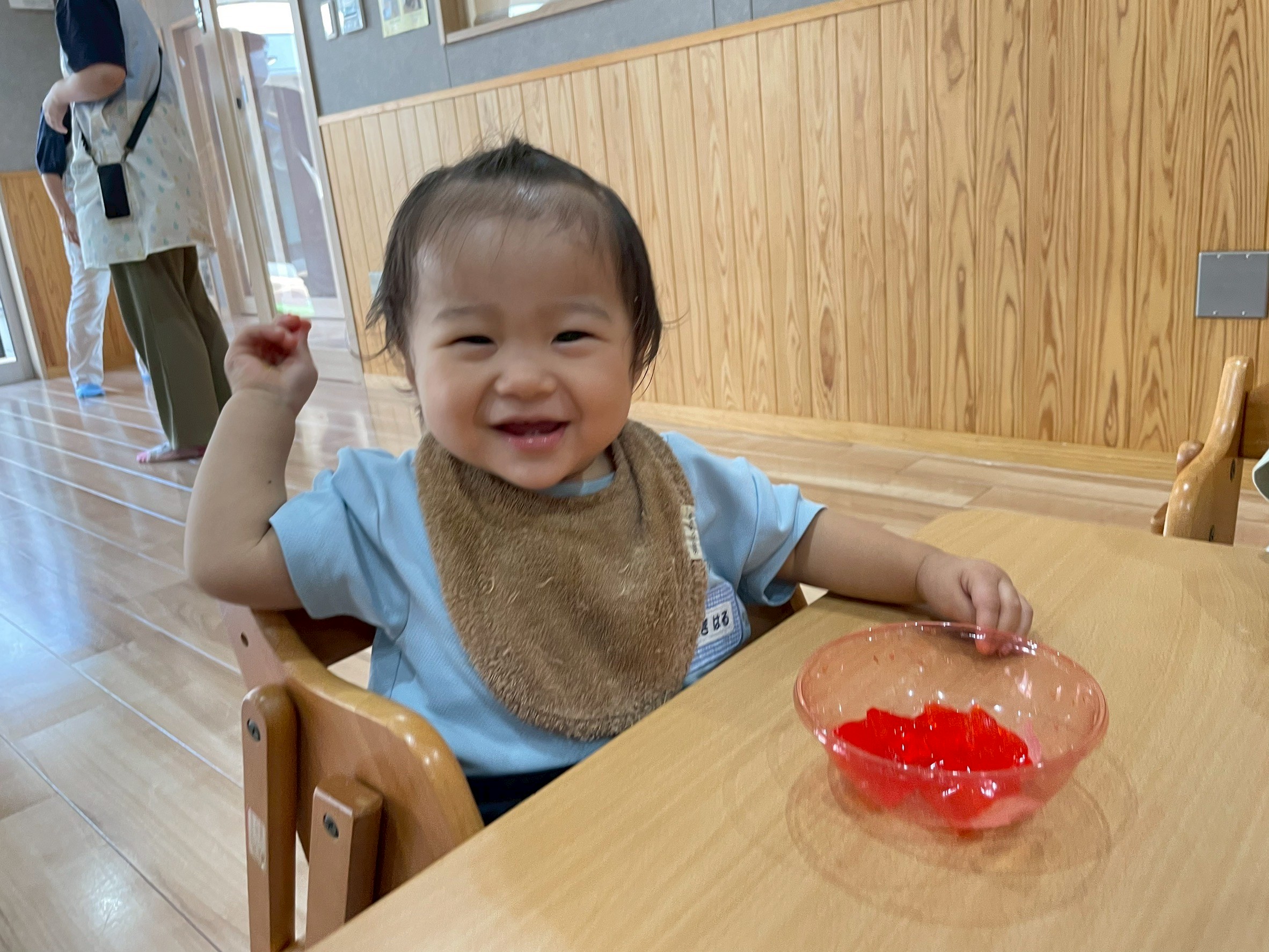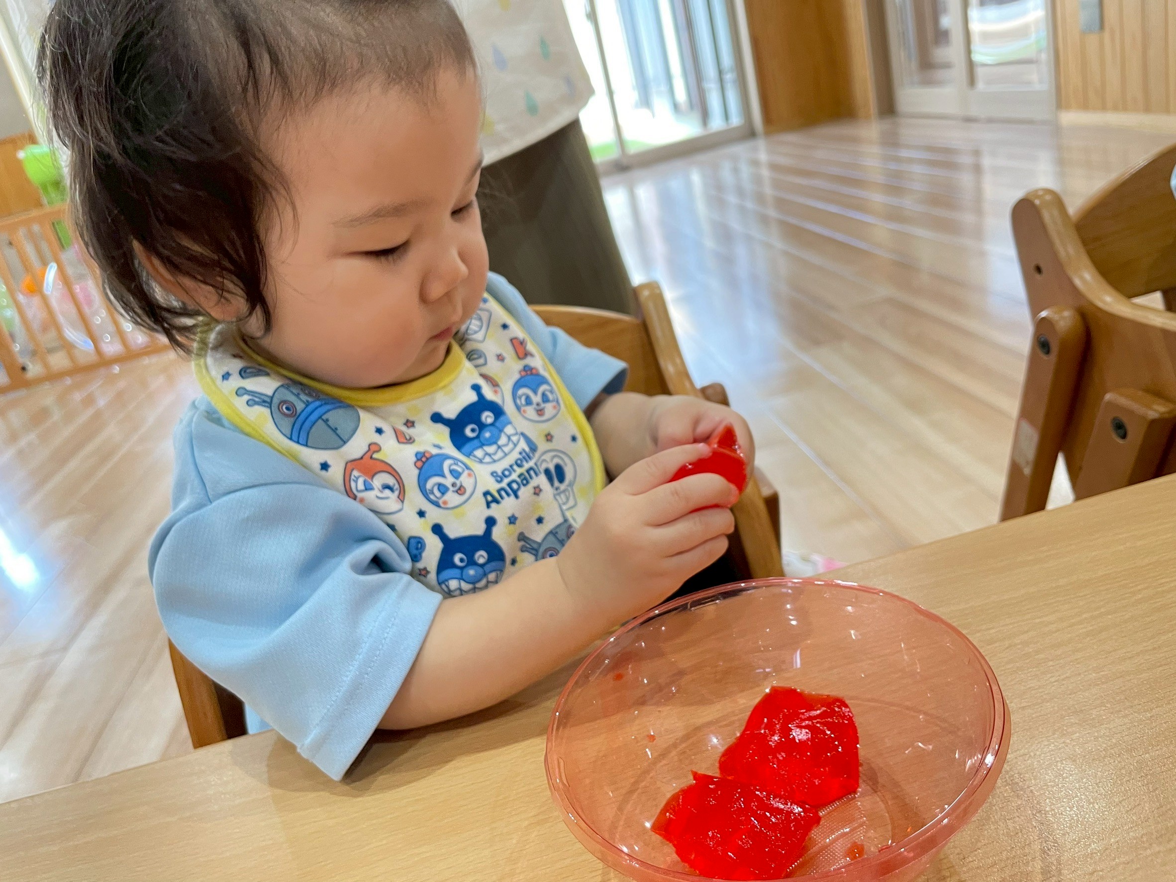 表面を触ったり、別のお友達は握って細かくなっていく寒天を別の容器に入れたりしていました💕