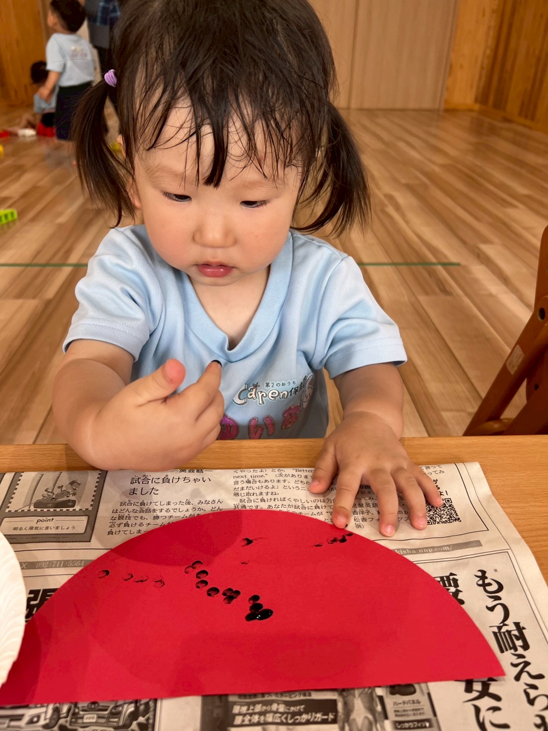 今日は月制作で、指先を使って絵の具をぽんぽん🎨人差し指で上手にスタンプしながら、スイカの種の模様を楽しみました🍉
