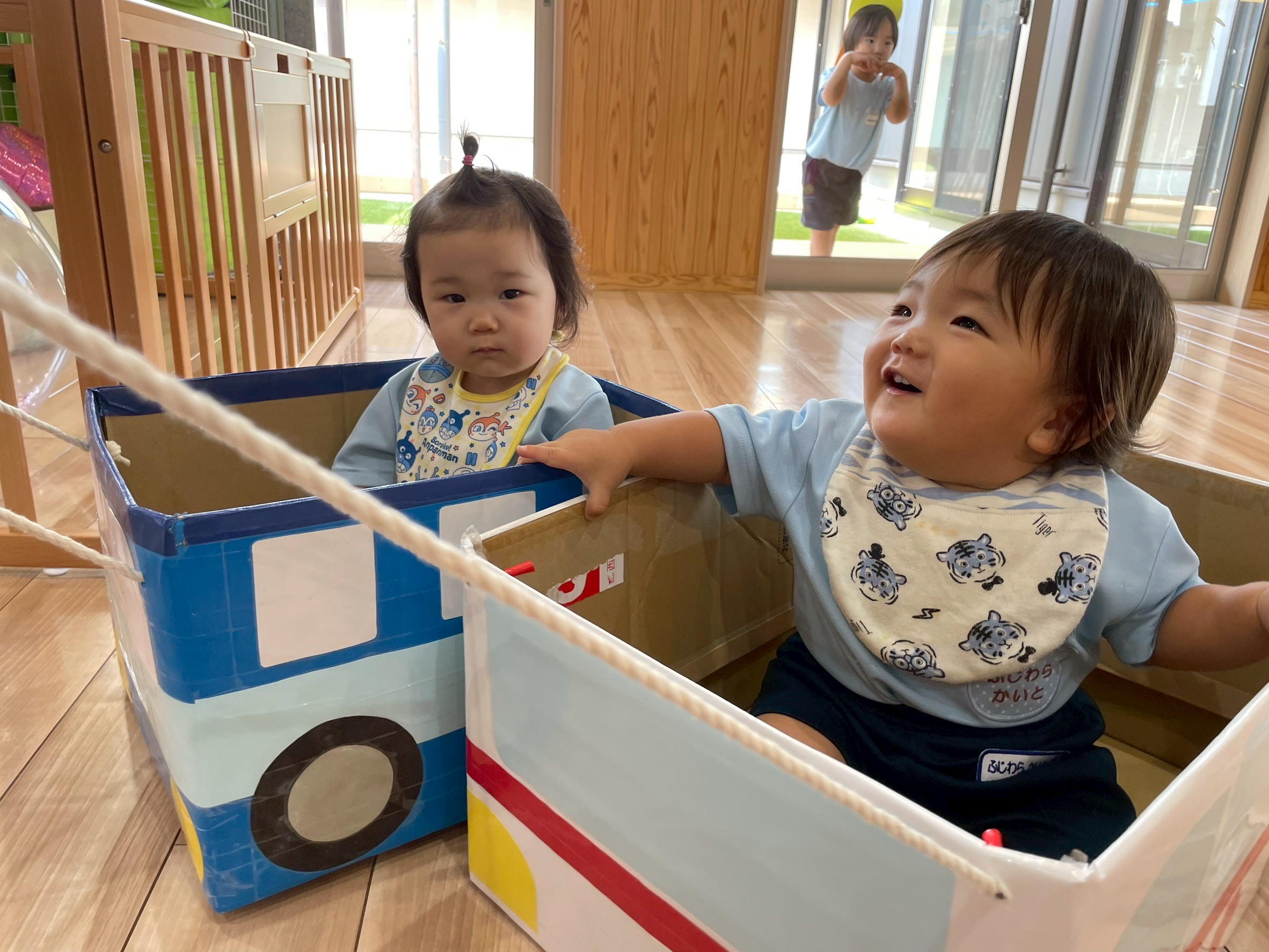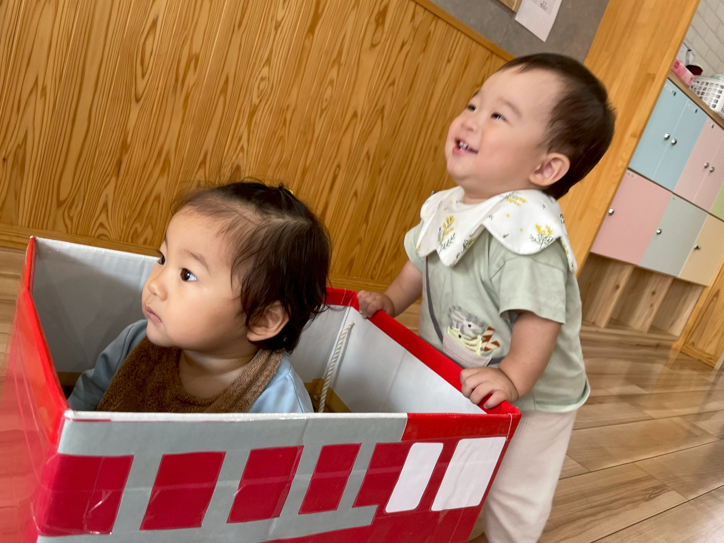 お友達が乗ってる段ボール電車を押してあげるのがとっても楽しかったようで、ずっと押してくれているお友達もいました🥰