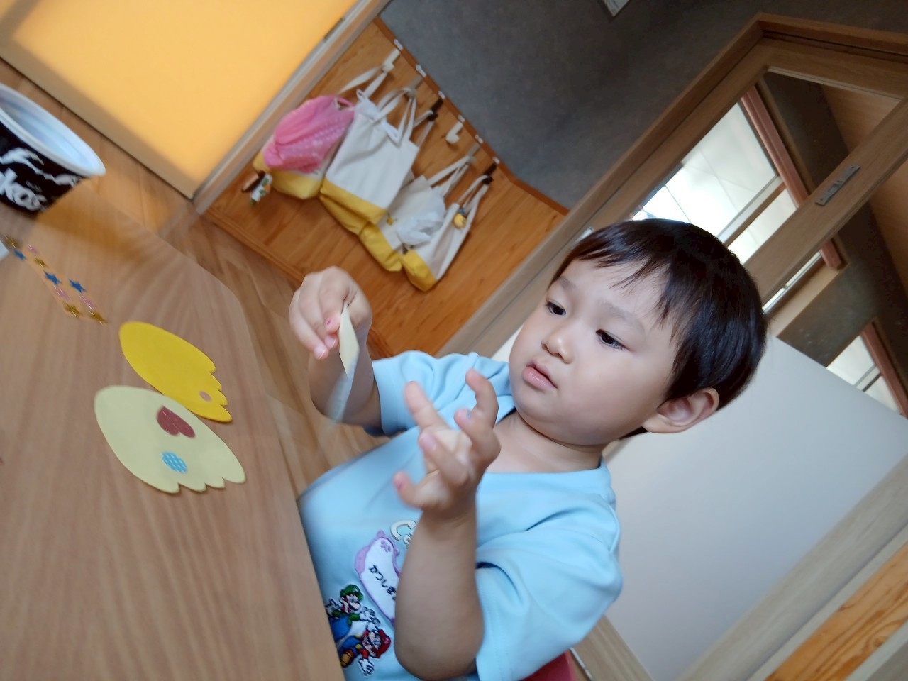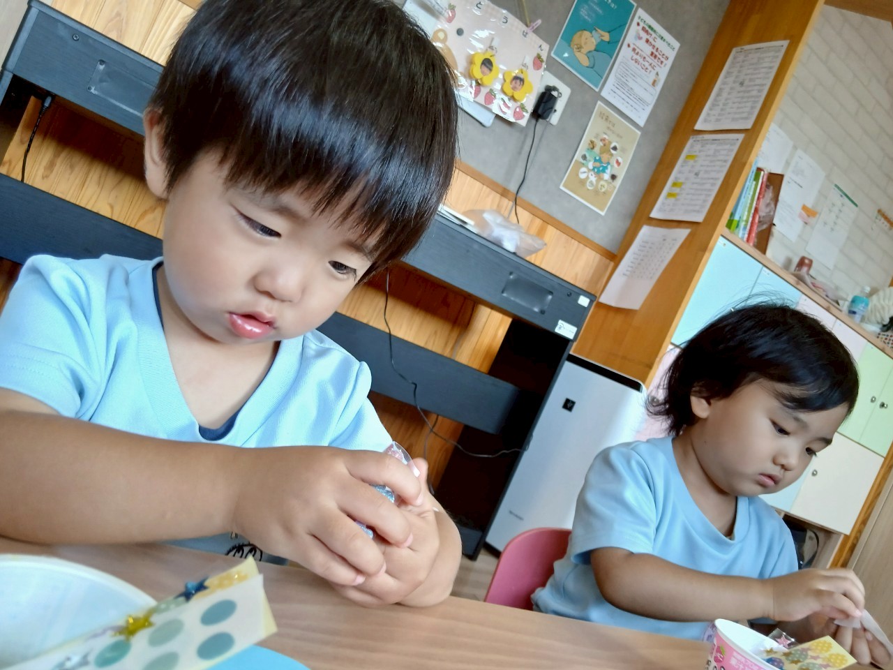 今日は最初にみんなが大好きなシール貼りをしてアイスクリーム🍨を作りました。好きなアイスの色を3枚選び、可愛いシールやキラキラシールを貼ってトッピングしました。なかなか剥がしにくいシールも頑張って剥がし、アイスクリームの歌🎶をみんなで口ずさみながら作りました。最後はコーンにもクレヨンで模様をかいて仕上げました👏。