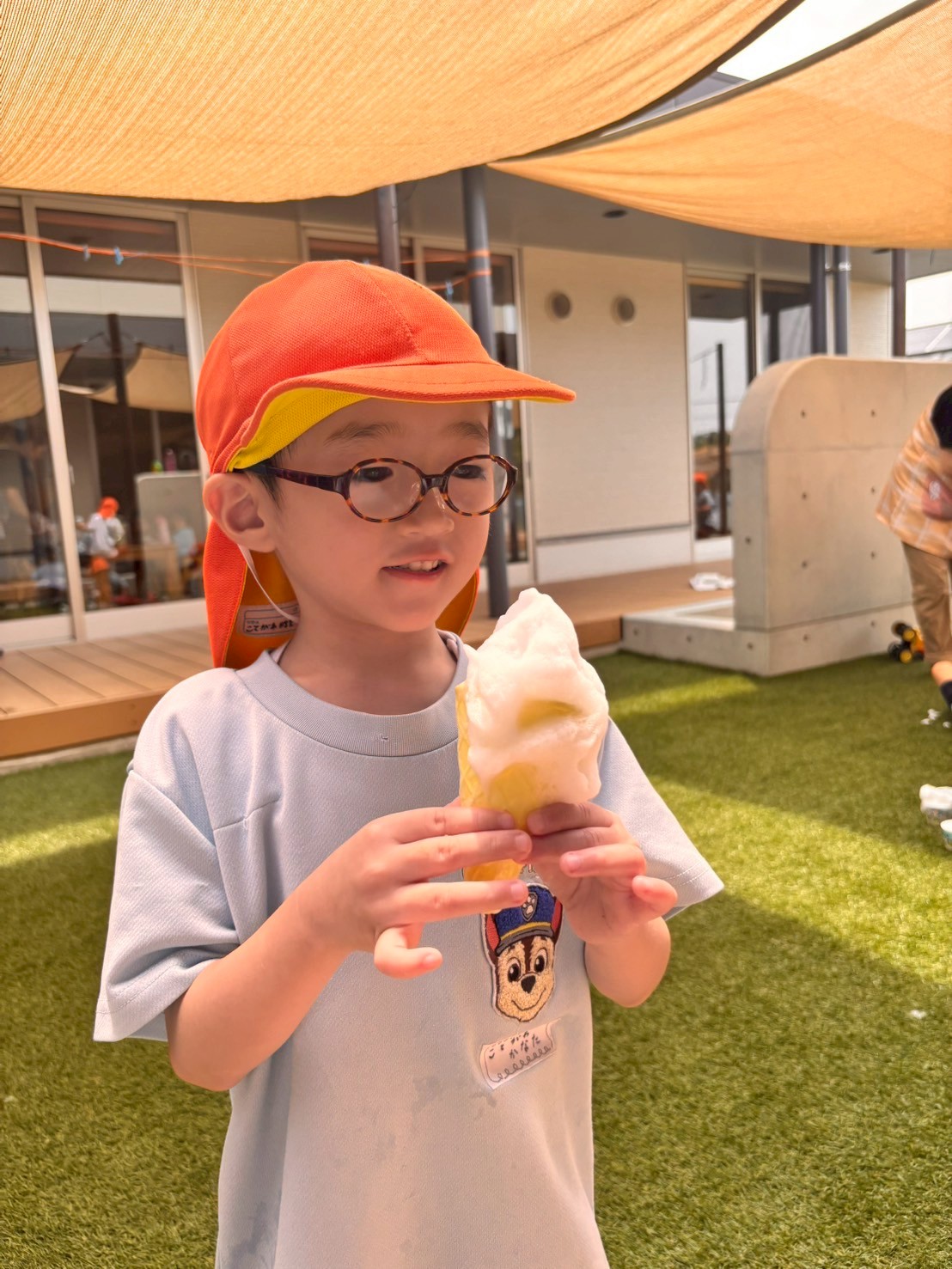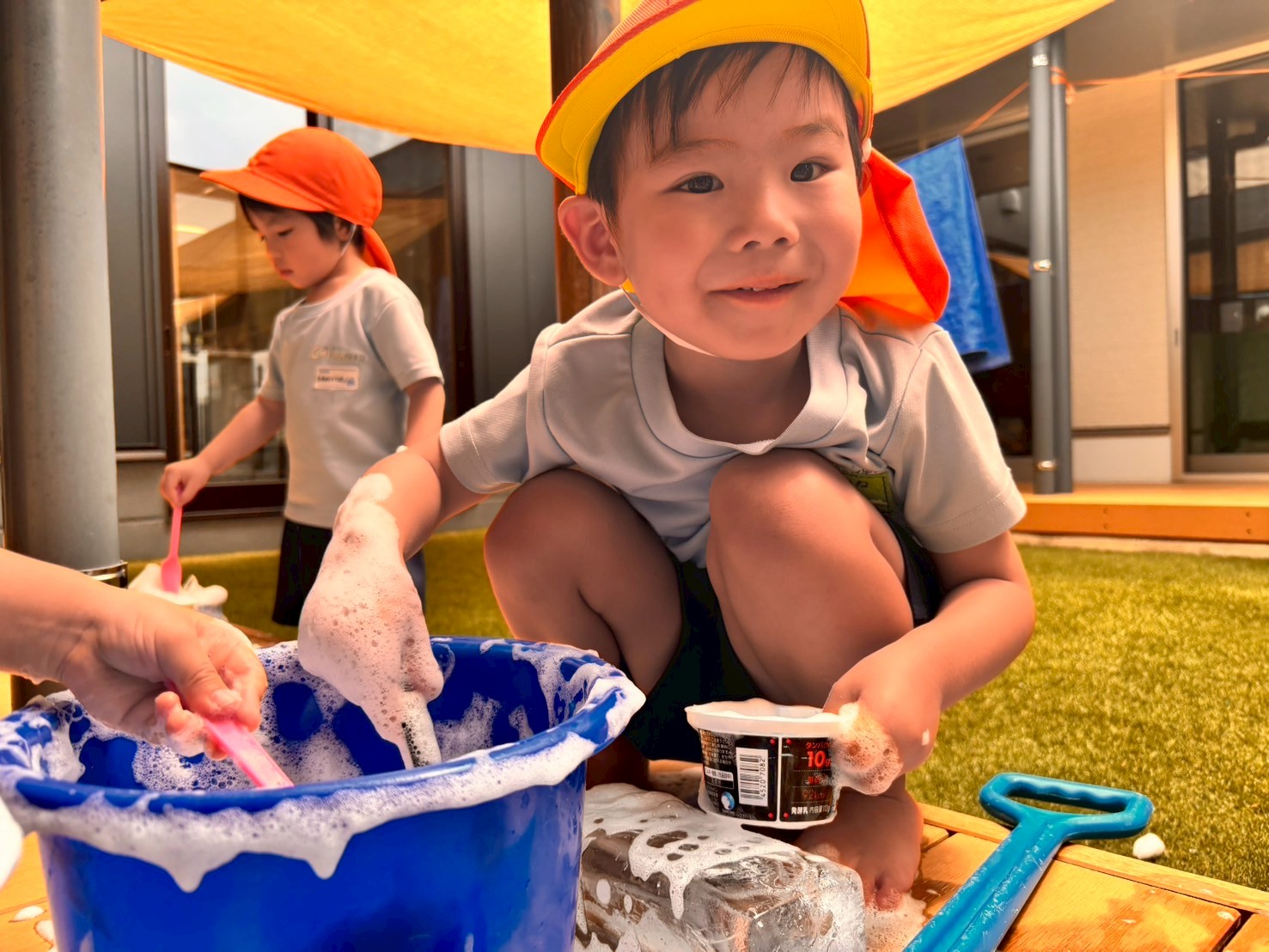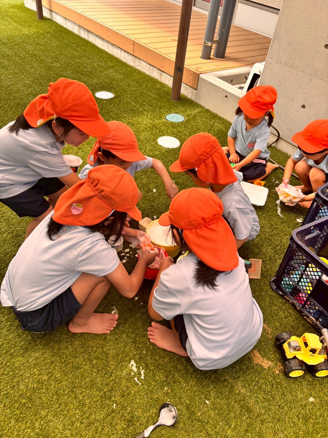 泡をアイスに見立ててお友だちとごっこ遊びを楽しんだり、みんなで一つのバケツに集まり、混ぜ混ぜして「冷たーい」とキャッキャいいながら盛り上がっていました😁🧡