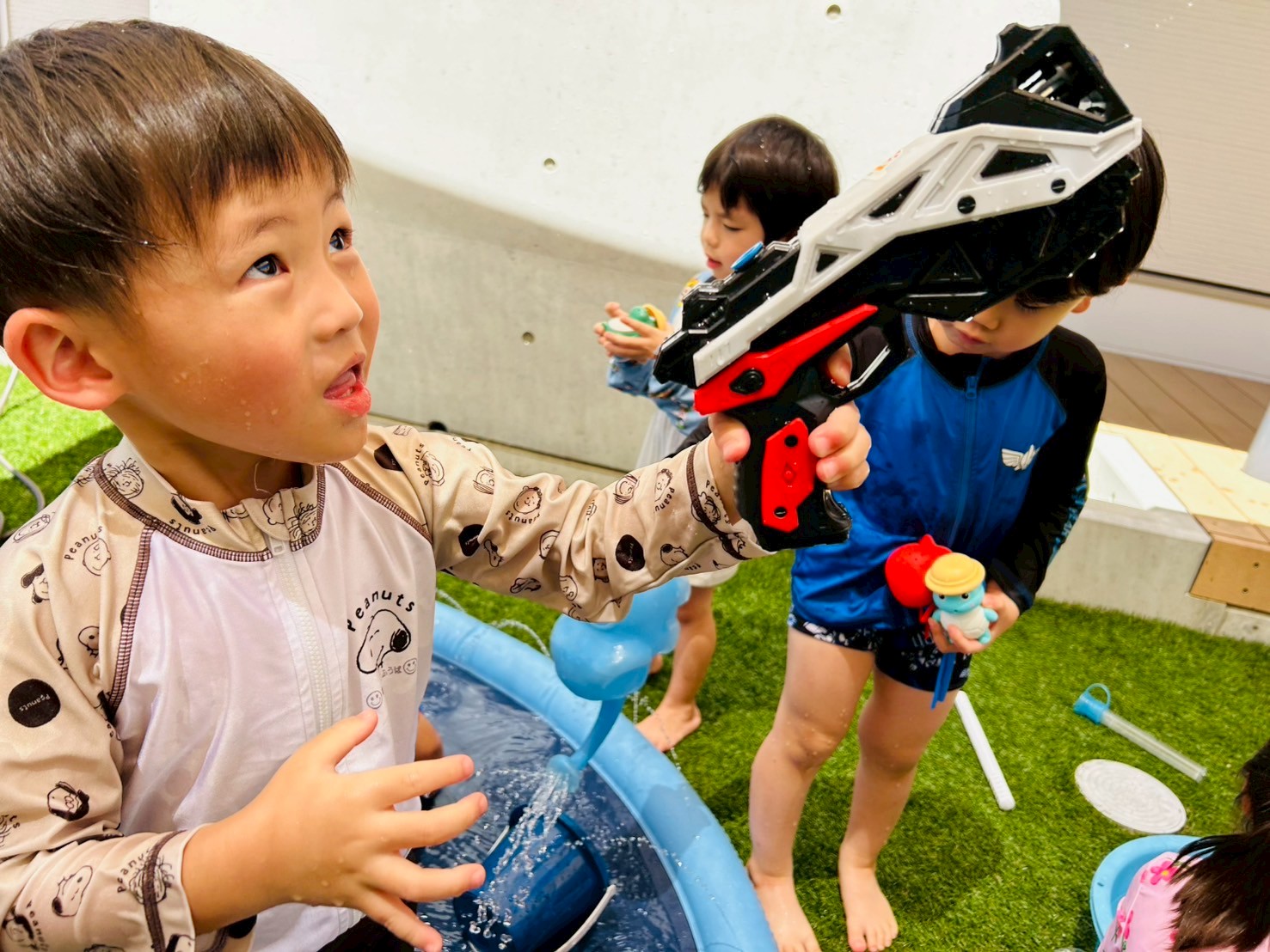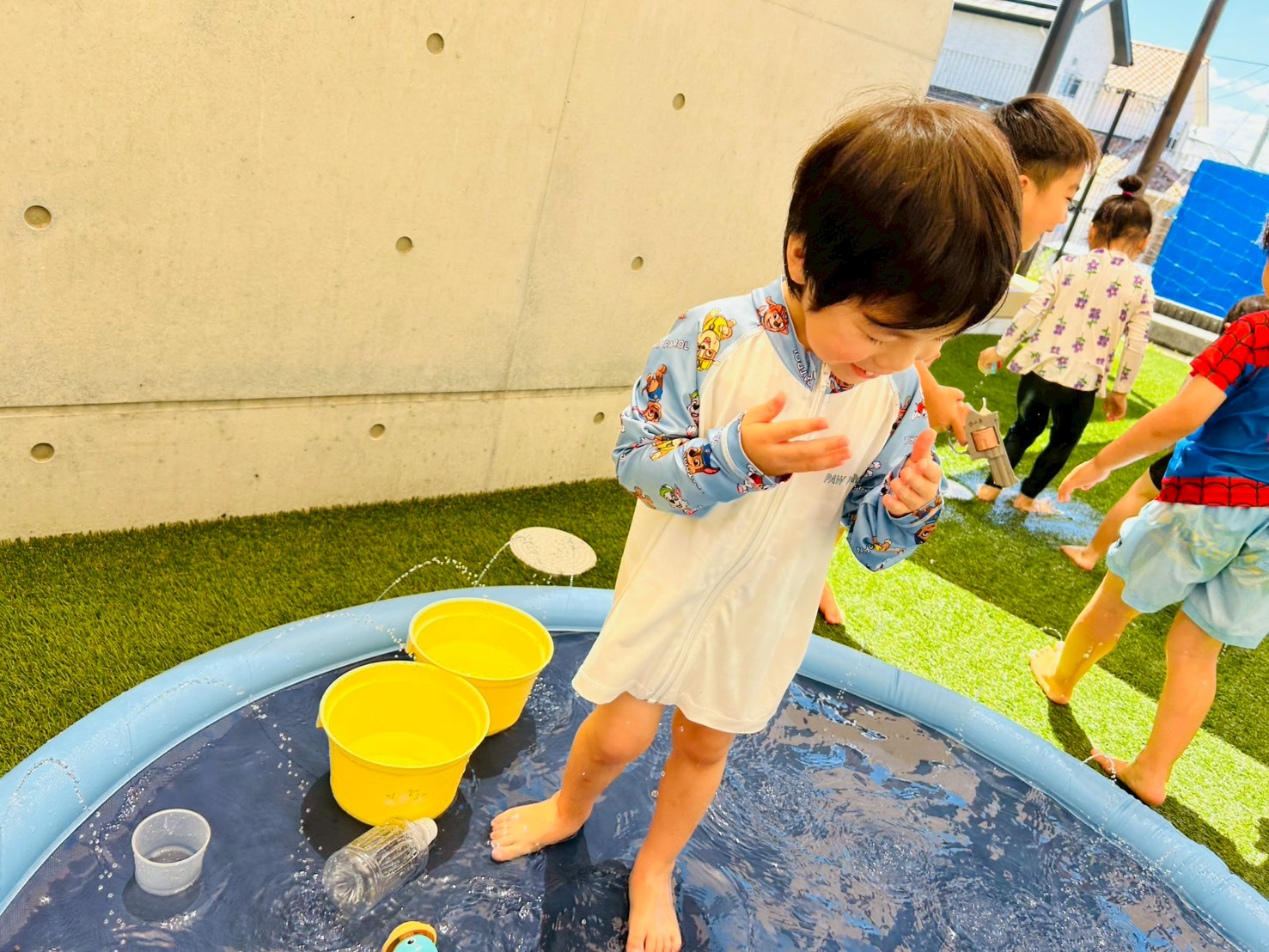 水着を着るのが楽しみで待っている間も「次は〜」とワクワクしていましたよ❤️ 水遊びではジョウロを使って容器に移し替えたり自分の頭にかけたりしている姿が見られましたよ😊とプールの中でダイナミックに水を浴びたり水が顔にかかっても「気持ちいい🎵」と嬉しそうでした🤗うさぎ🐰こあら🐨きりん🦒