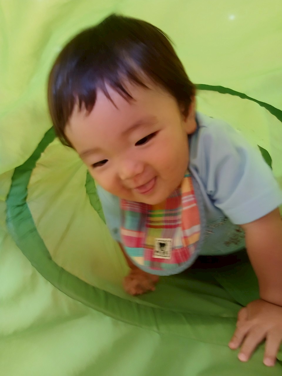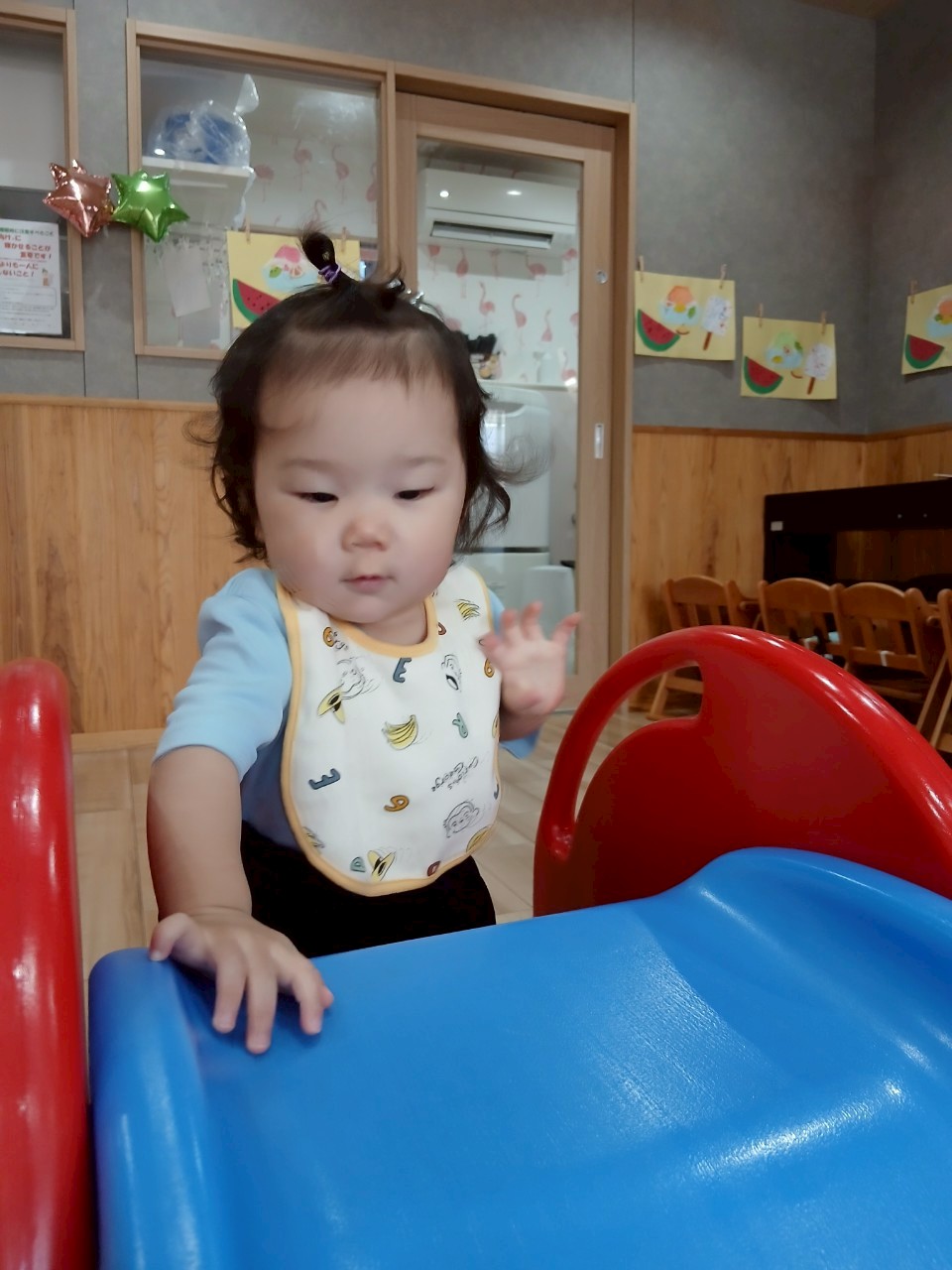 避難訓練の後はお部屋でサーキット遊びをしました。滑り台も得意気に登り、スルスルと滑ったりトンネルの入口から上手にいないいないばあ🤗をしたり全力で楽しんでいたお友だち、水遊びをしているぱんだぐみさんの様子を窓から羨ましそうに見つめていたひよこ🐤ぐみさんでした🤭りす🐿゙