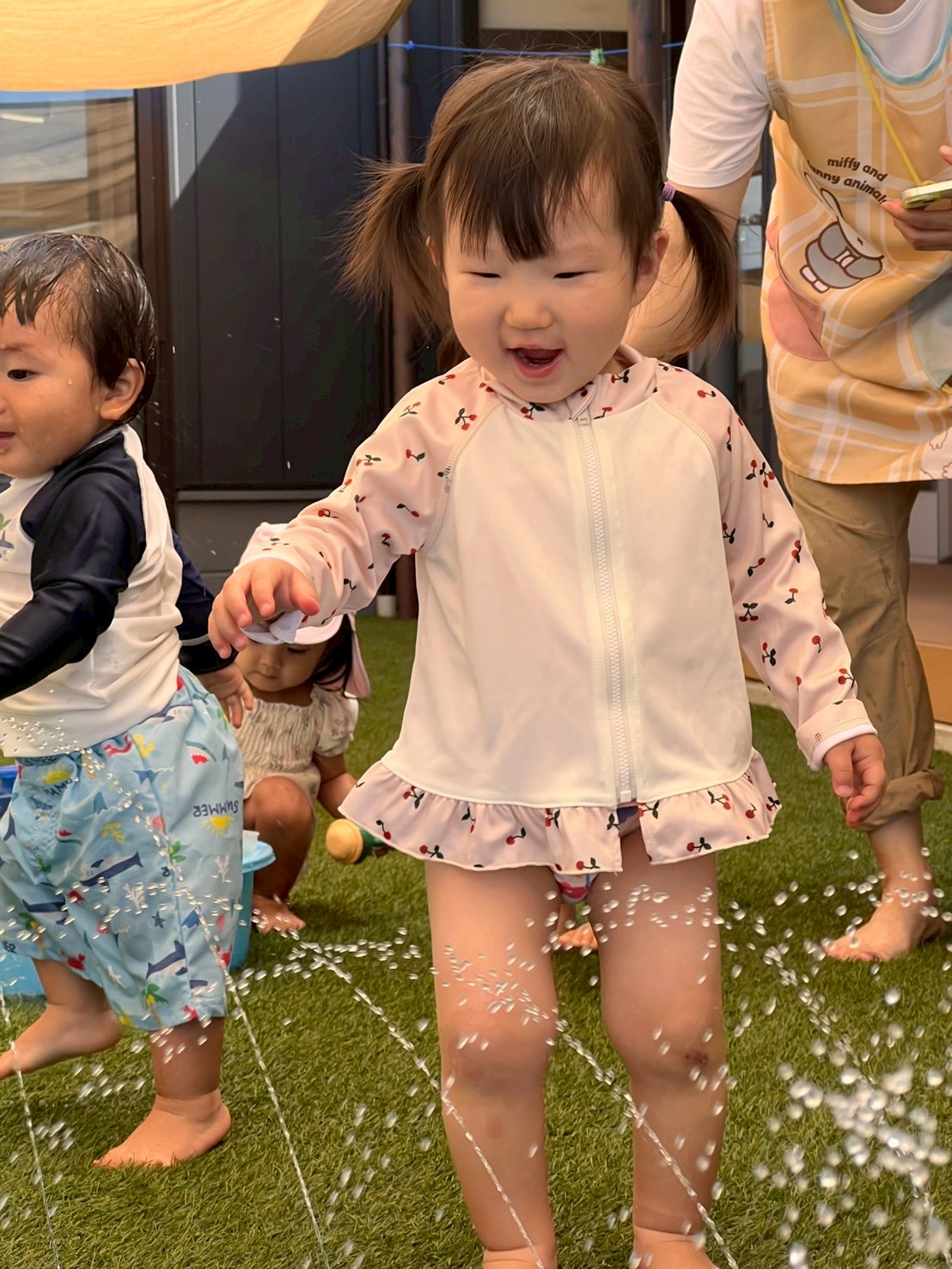 噴水マットやタライの水をスコップですくったり、水鉄砲やシャワーで水にたくさん触れて遊びました✨