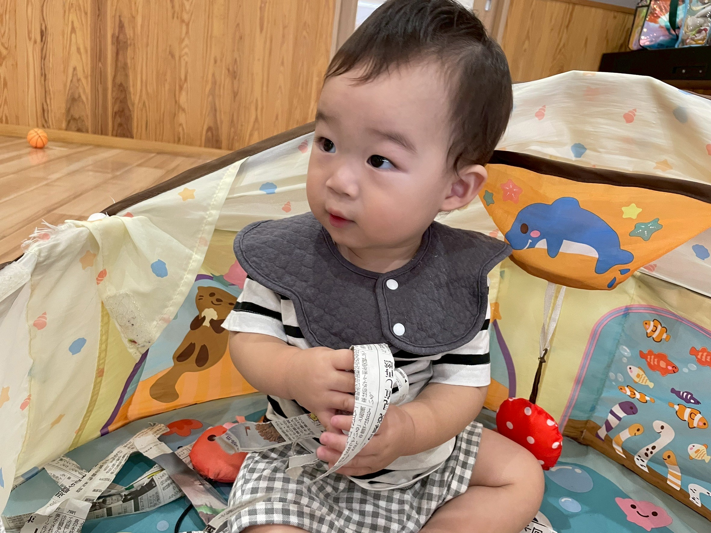 お部屋で遊んでいたお友達は、新聞紙をビリビリ上手に破って、新聞紙プールを作りました💕