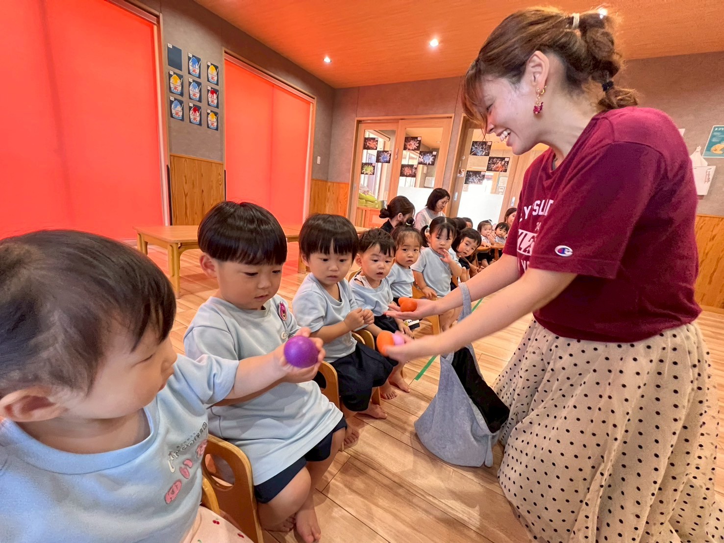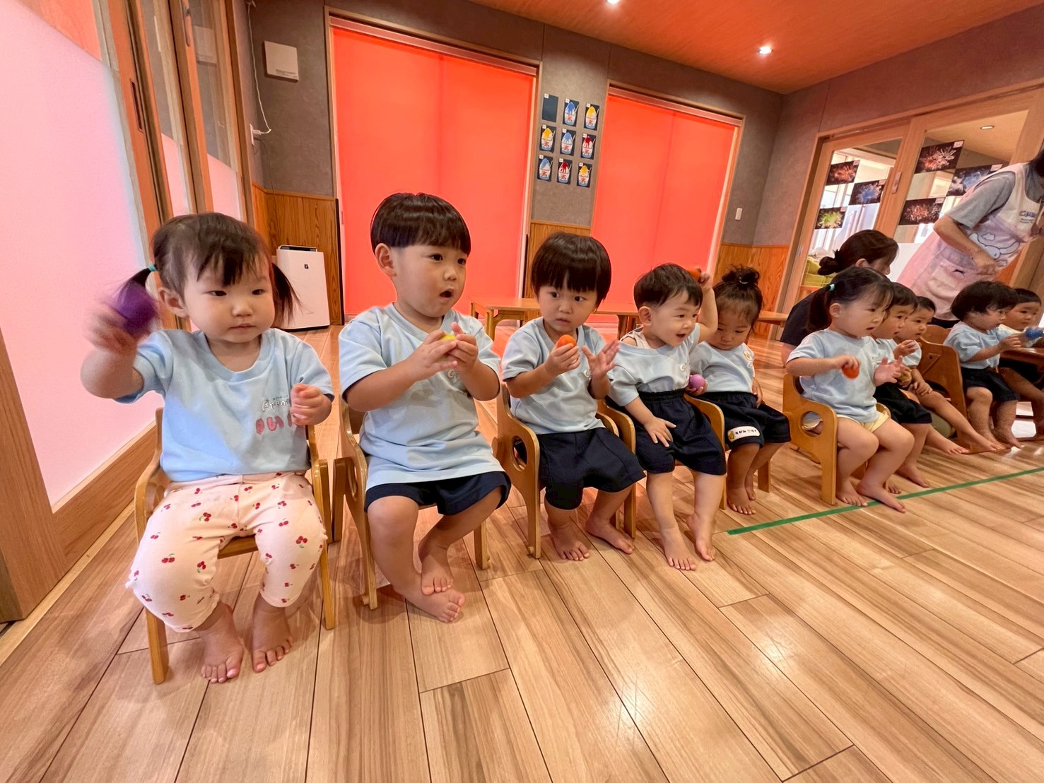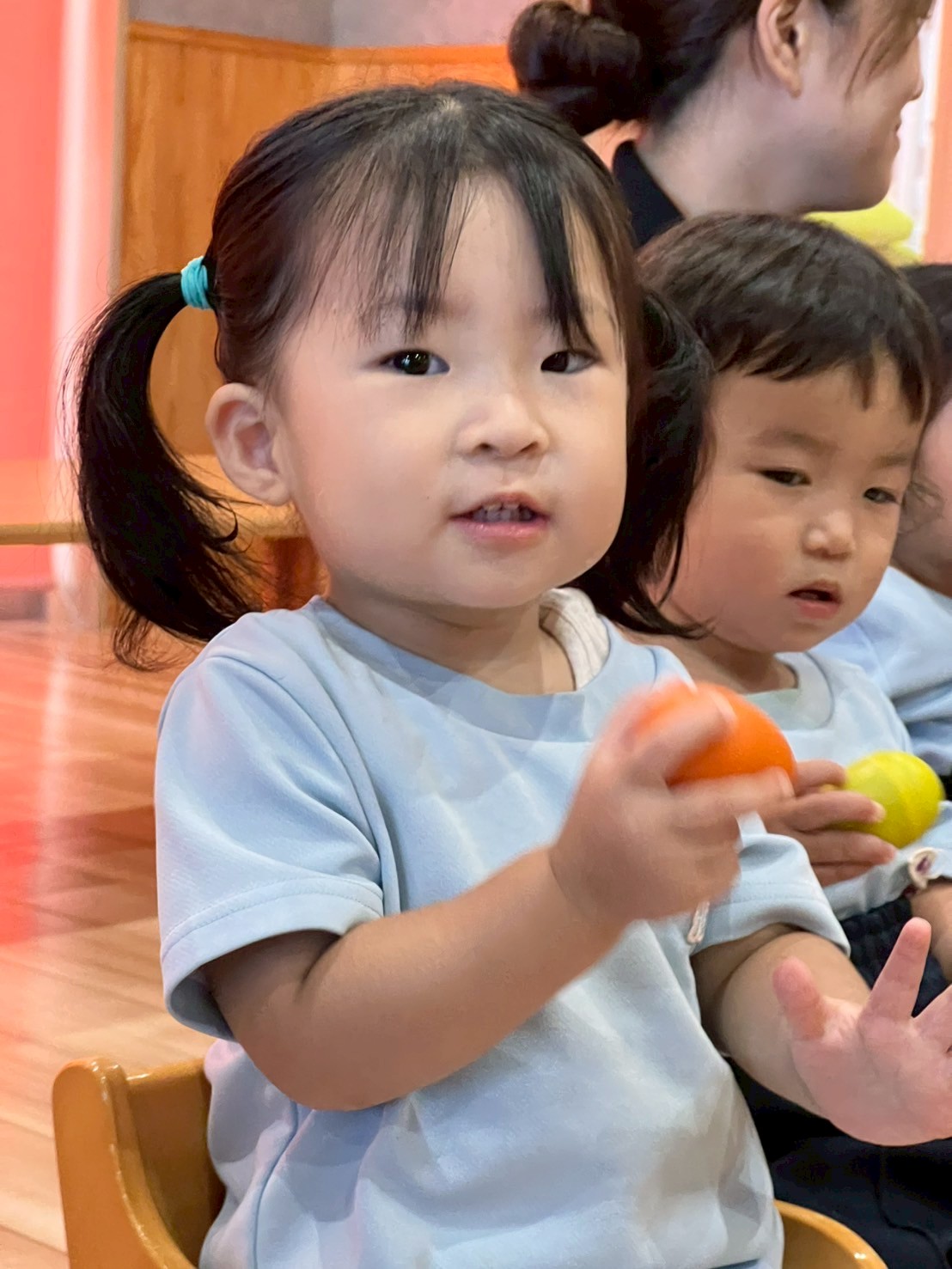 卵型のマラカスを一つずつ受け取り、「かたつむり」の歌に合わせて手に持ったマラカスをシャカシャカと鳴らして嬉しそうな笑顔を見せてくれましたよ❣️先生に返す時はイヤイヤをしてなかなか返すことができないお友だちもいましたが、次の「バスごっこ」のフープを見るとすぐに交換できていましたよ😄楽しいリトミックの時間でした💕