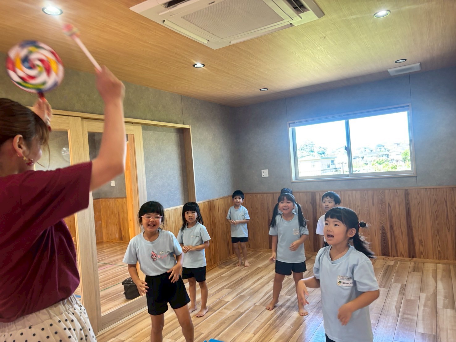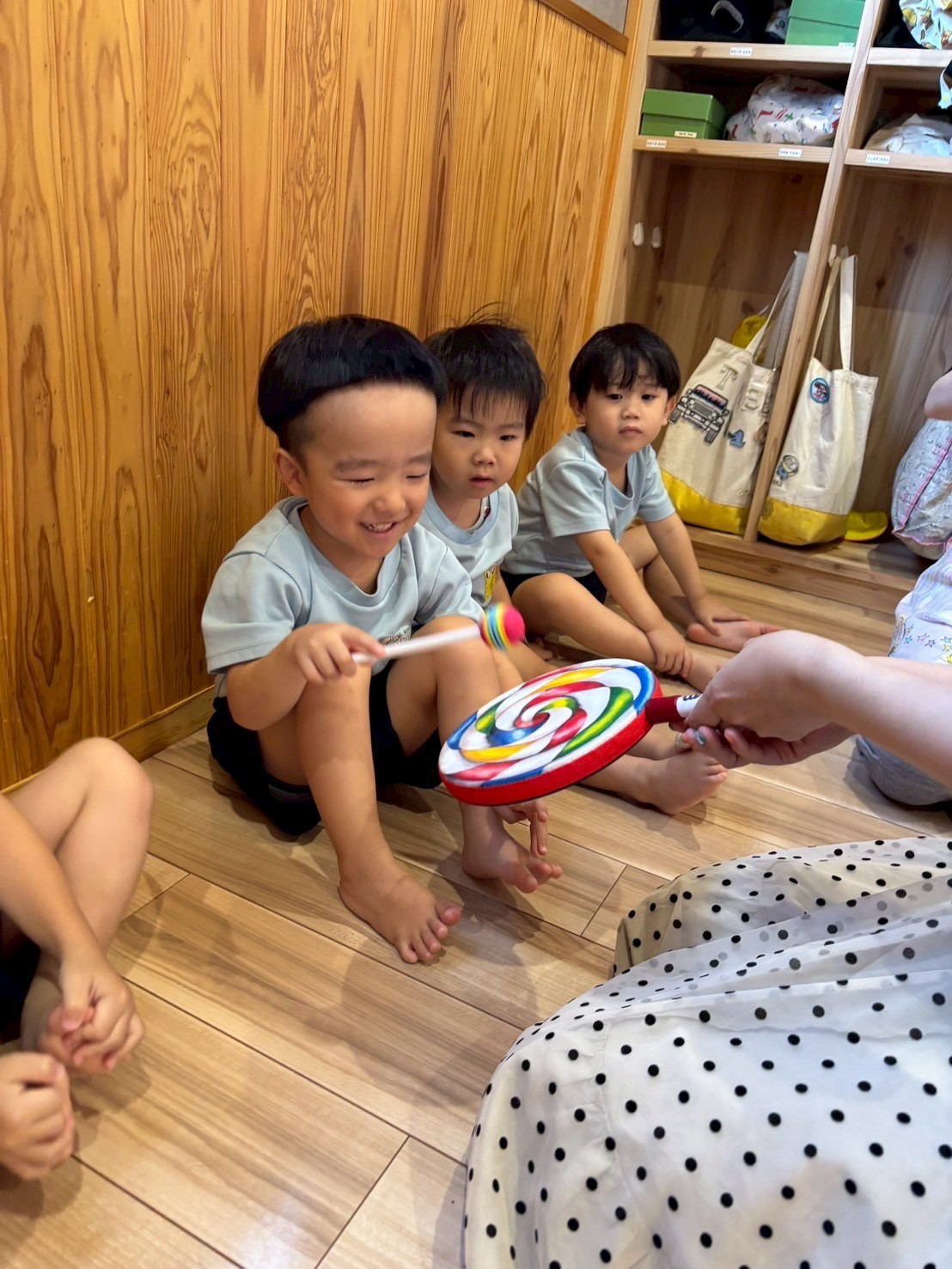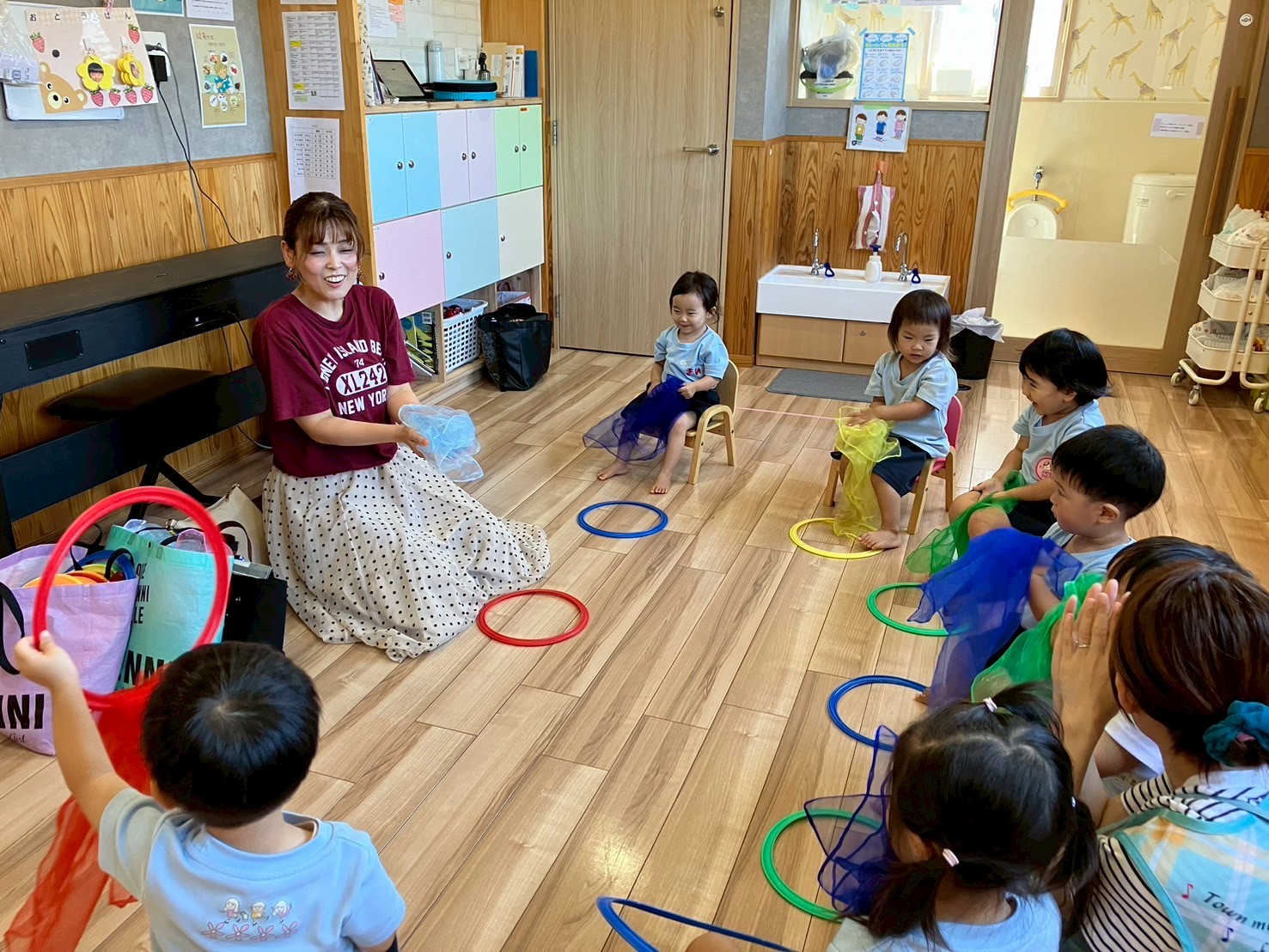その後はリトミックでスカーフとフープを使ってミックスジュース作り🍹 全員がフープと同じ色のスカーフを選び、先生が驚いていましたよ😁