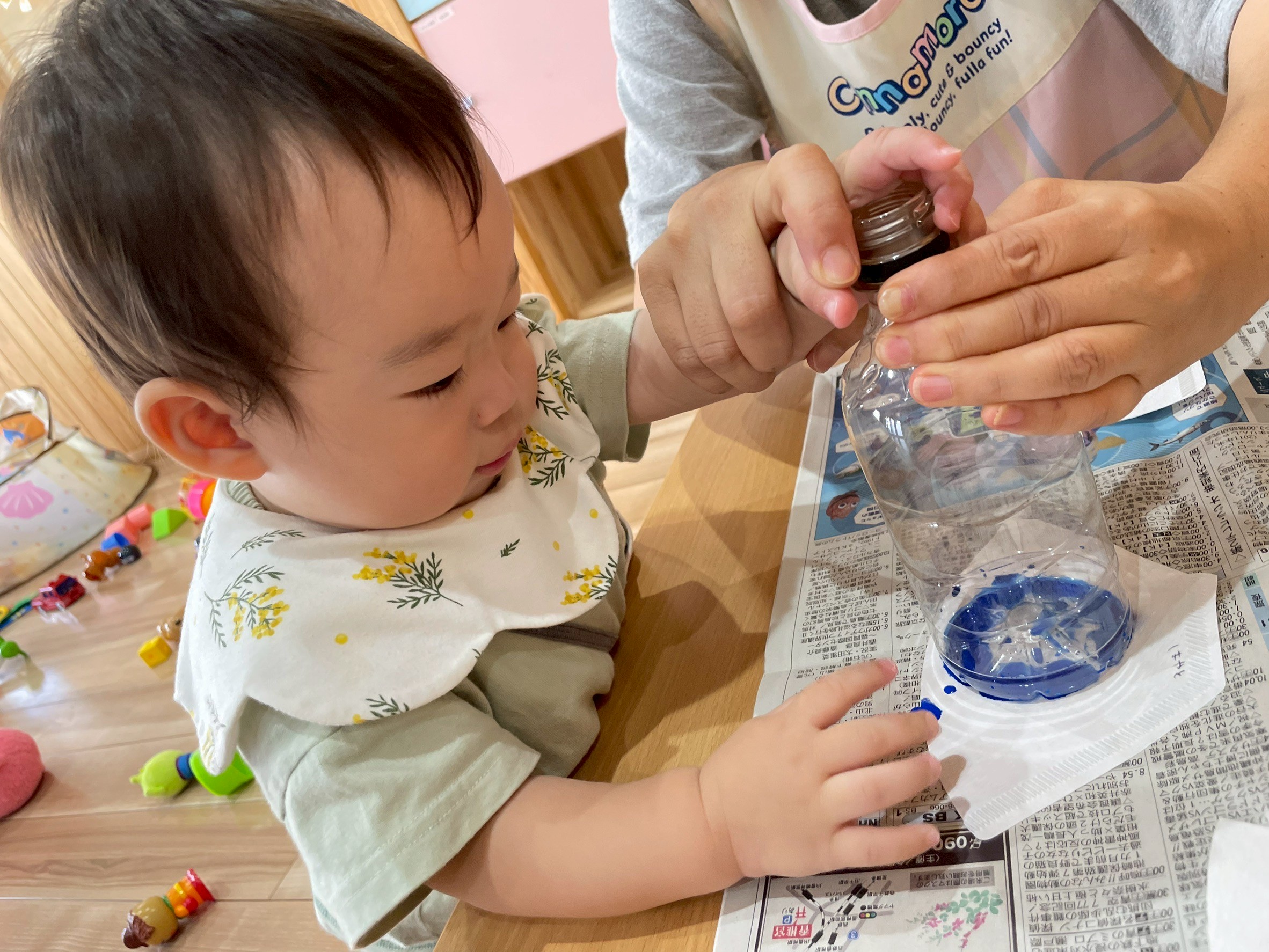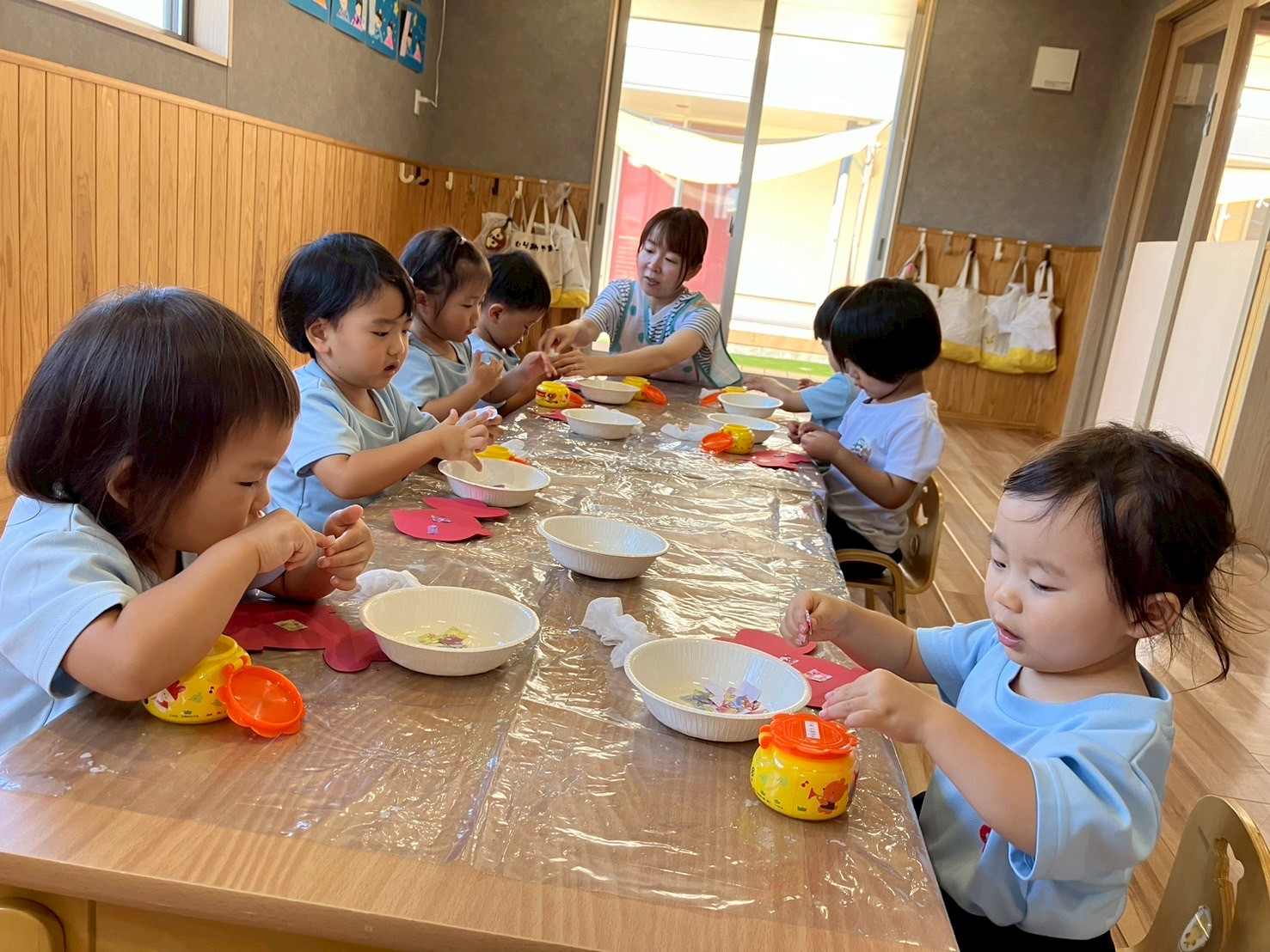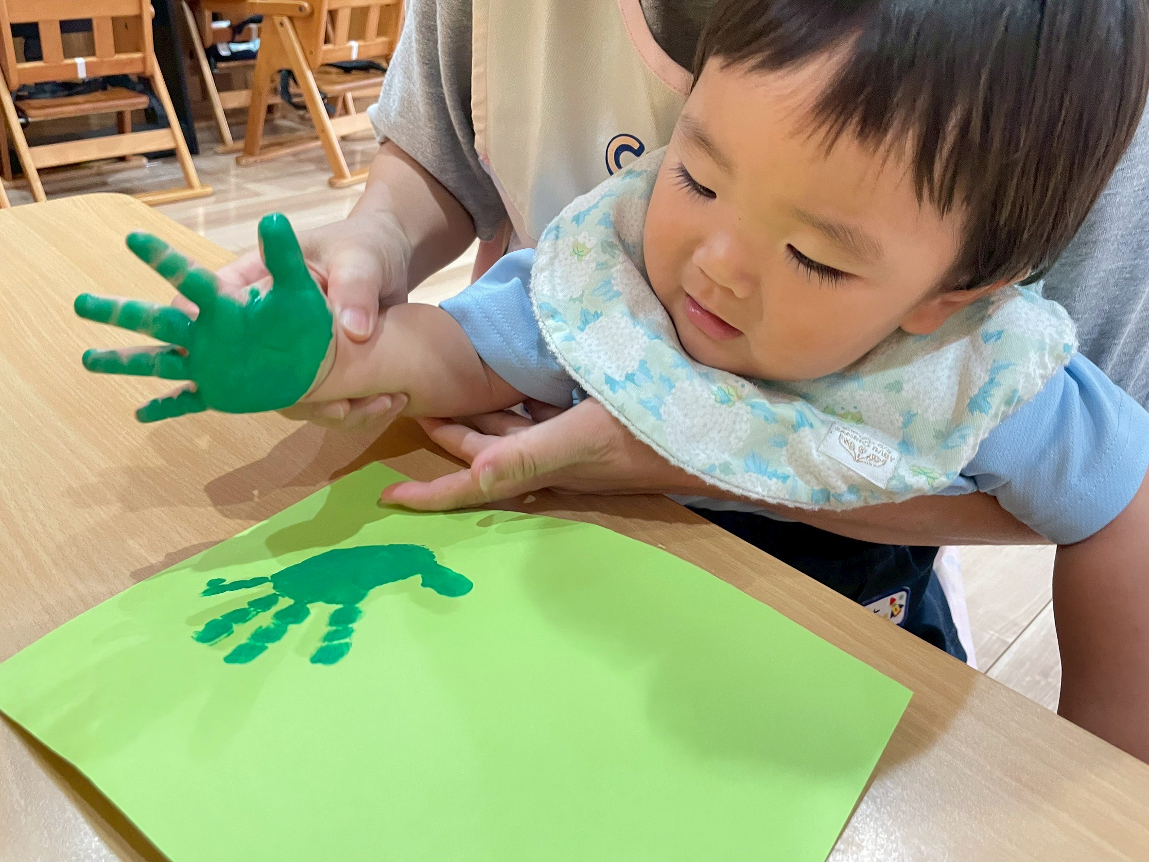 その後はペットボトルのスタンプをして朝顔を作りましたよ😊先生と一緒にペットボトルを持ってペッタン!不思議な模様を眺めていました😄その後は手型をとり、慣れてきたのか手に絵の具を塗るのを嫌がることなく、紙にも上手にペッタンとできていましたよ💓