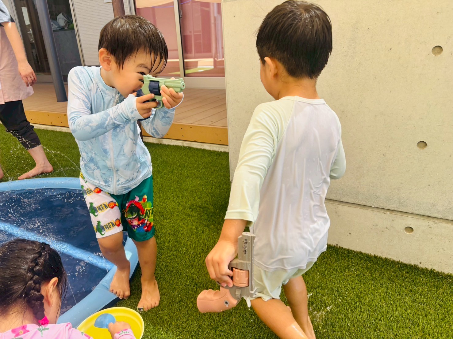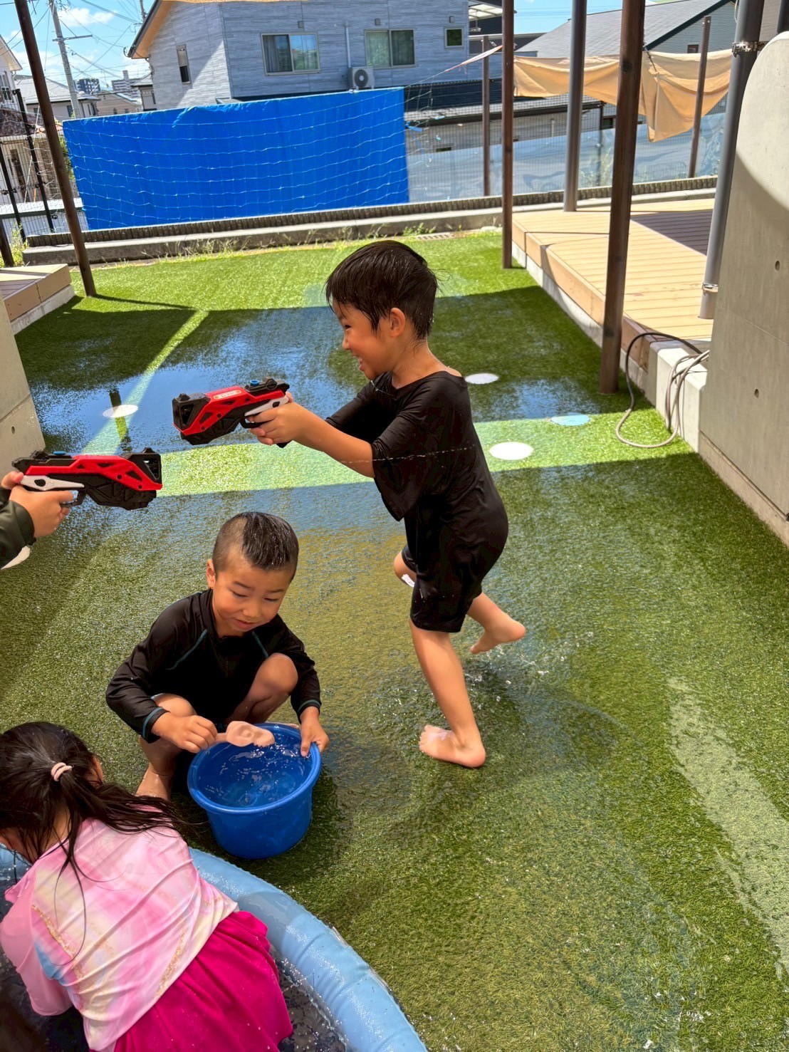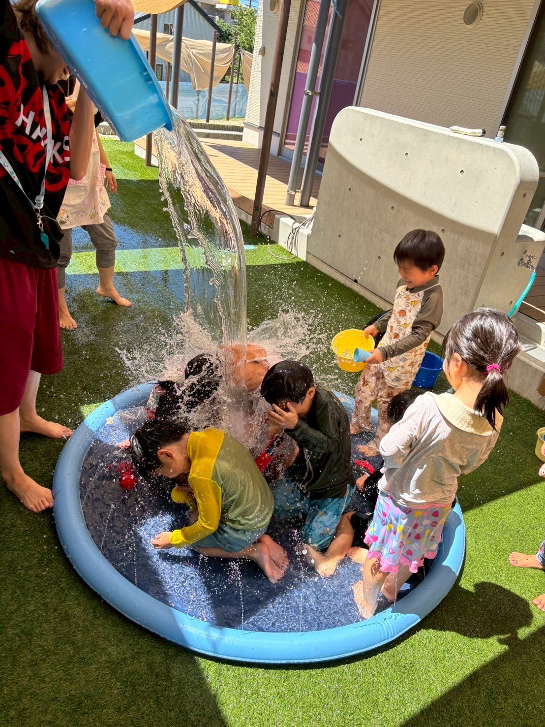 準備体操🤸♀️をして噴水マットで 水に触れたり、水鉄砲でかけあいをしたりとっても楽しんでいましたよ🧡🩵きりんさんやこあらさんは頭から被ったりダイナミックに遊びました☺️✨