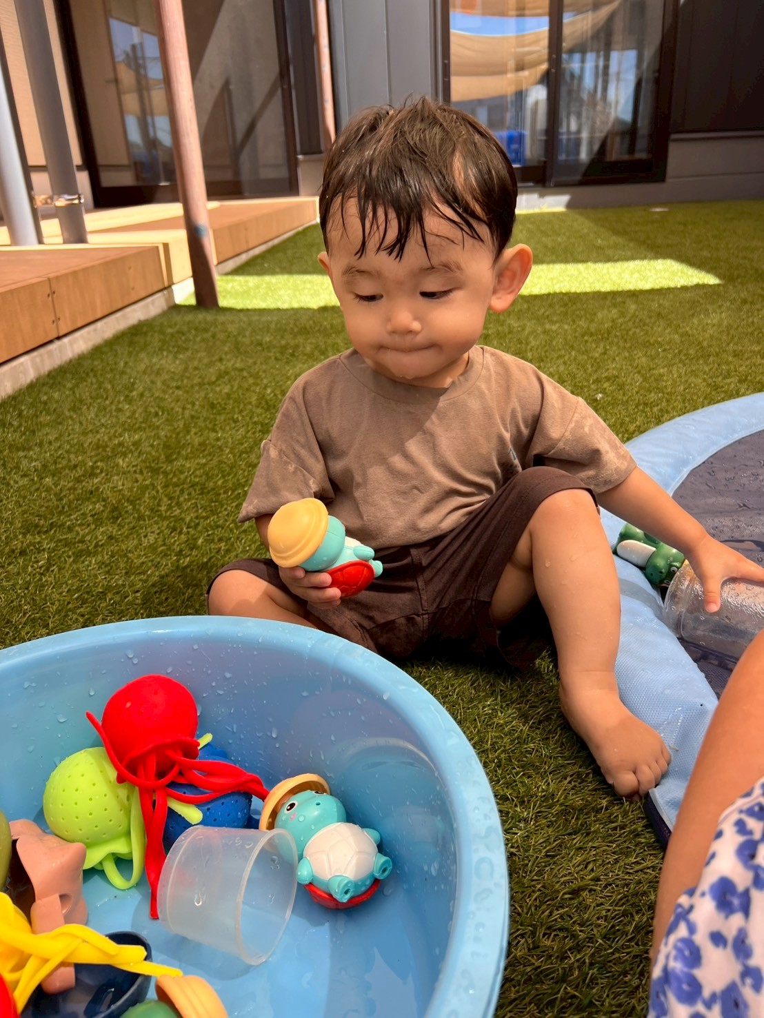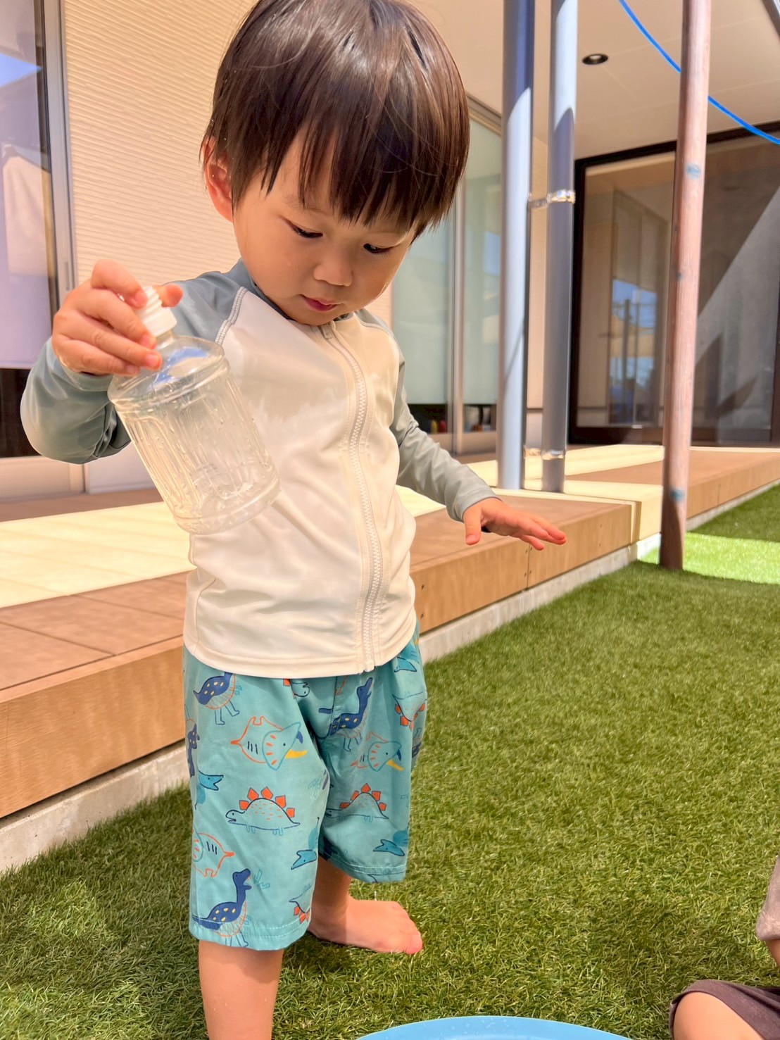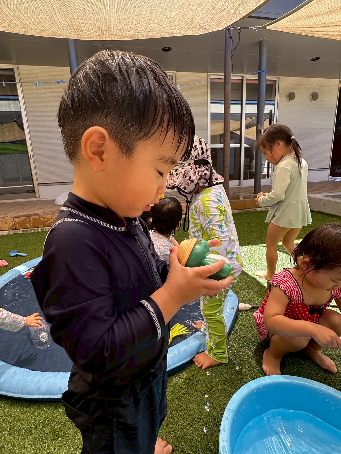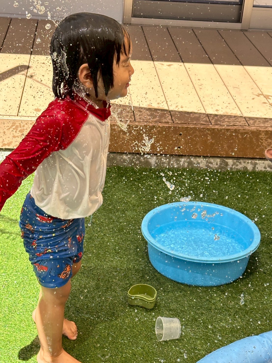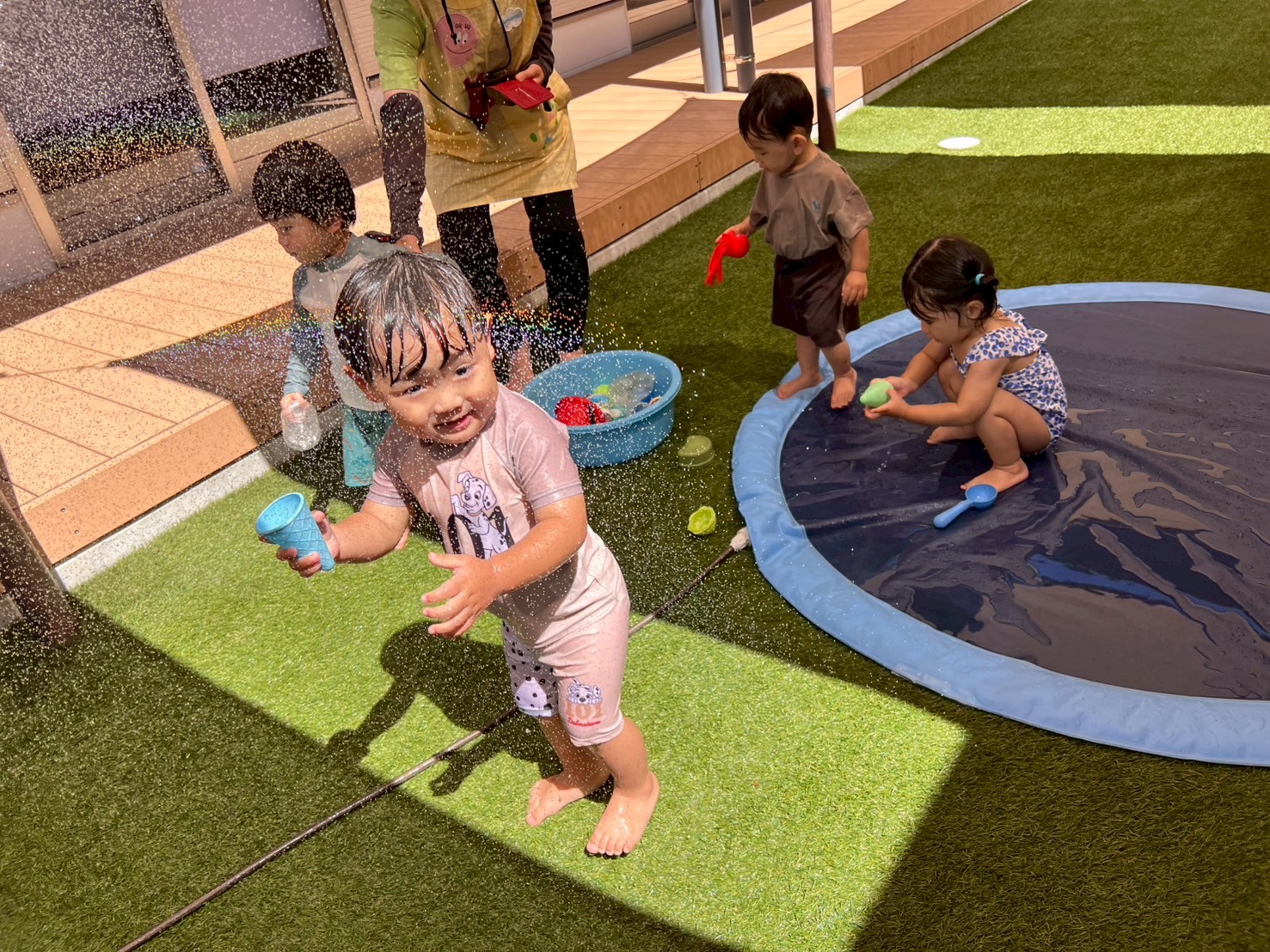 シャワーの下に走って行って浴びたり、たらいにおもちゃを浮かべてすくったりと、それぞれが心地よい水の感触を楽しんでいました🫧ウッドデッキでは、濡れた足で歩くと足あとが残ることに気づいて、お友だちと一緒に足あとを見ながら嬉しそうな様子も見られました👣✨