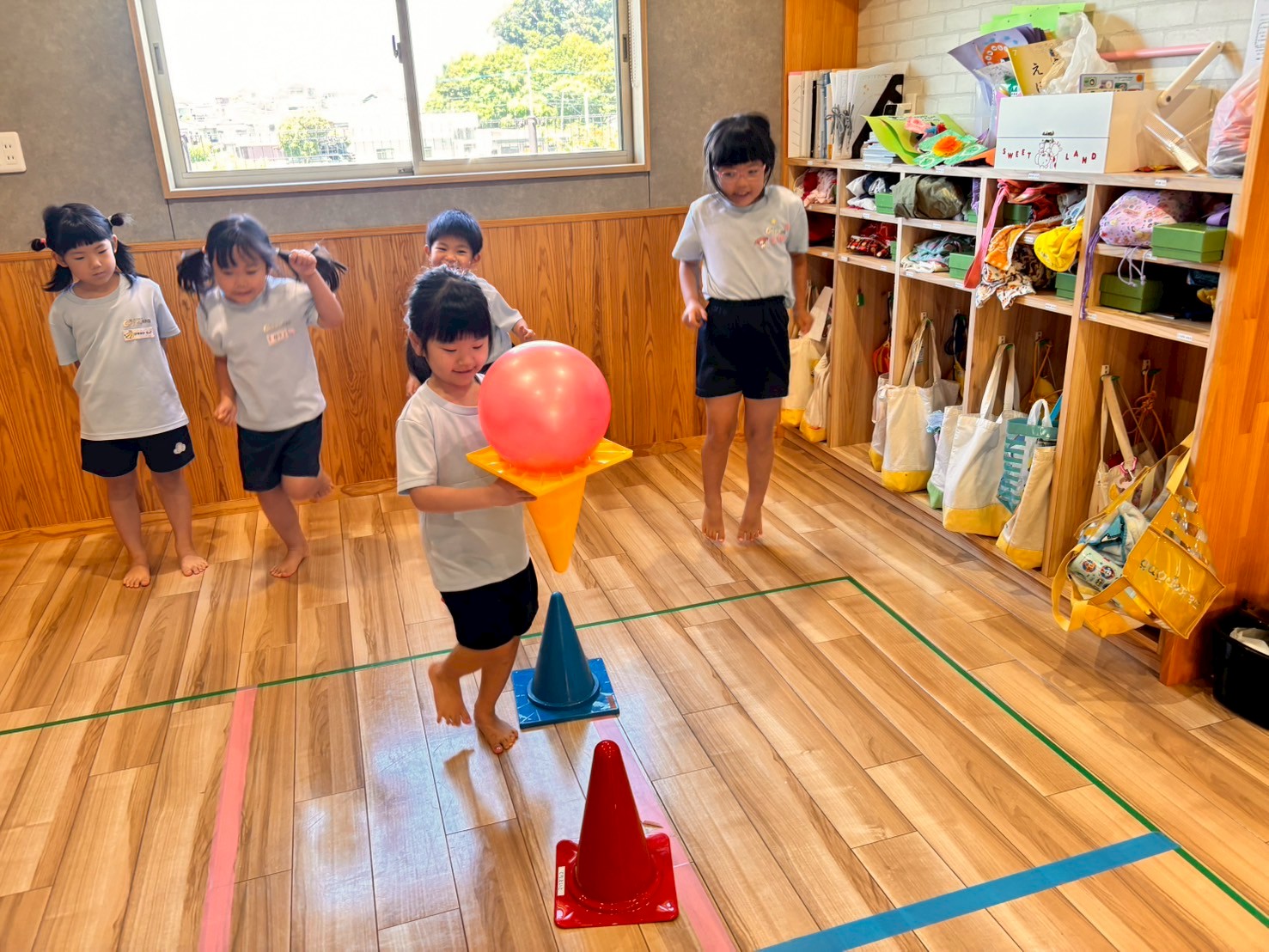 コーンとボールをアイスに見立ててくねくね道を落とさないようバランスをとりながら歩いたり、ペアになってボールキャッチをしたり、手は使わずにボールをお腹に挟んで協力して運んだりしました💕