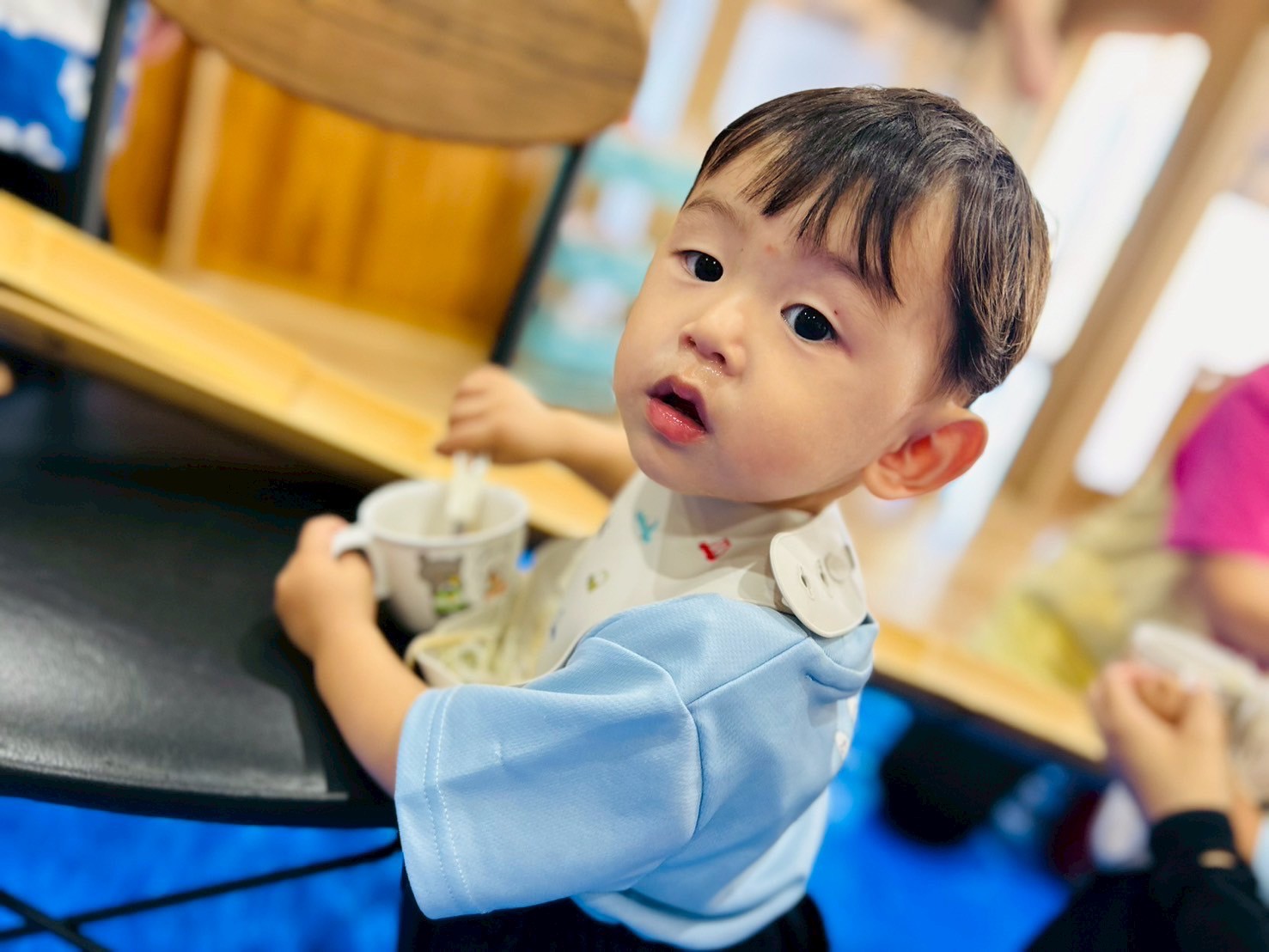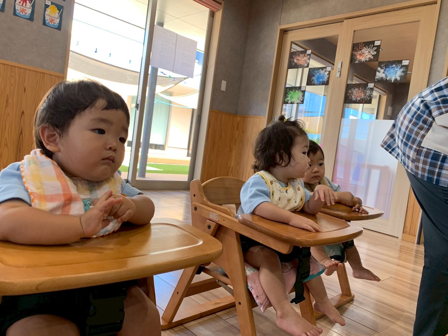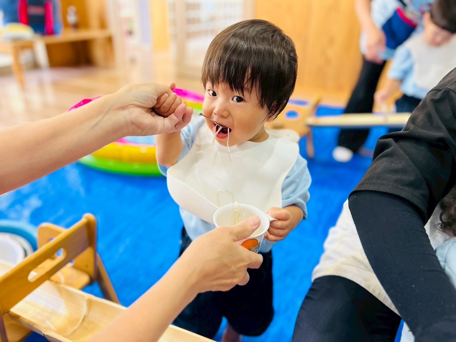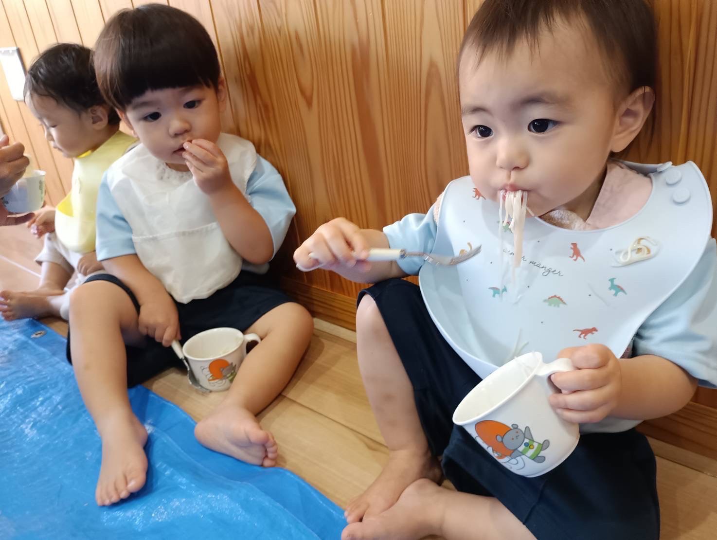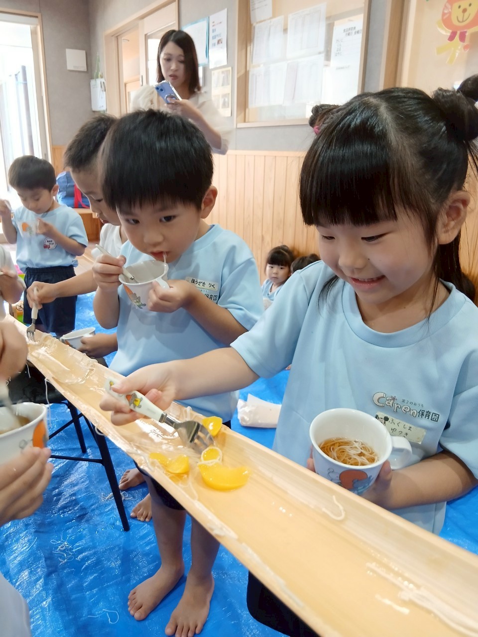 流れてくるそうめんに最初は不思議そうな表情を見せていましたが、保育者と一緒にやってみるとすぐにコツを掴み、自分で上手にすくって口に運ぶことができていました✨