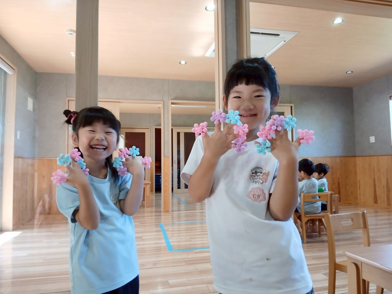 好きな色のシールでヨーヨーに貼って周りにハート🩷や星🌟を貼って完成👏「できた!」と見せてくれましたよ🍀みんなそれぞれの素敵な作品ができました!うさぎ🐰こあら🐨きりん🦒ぐみ