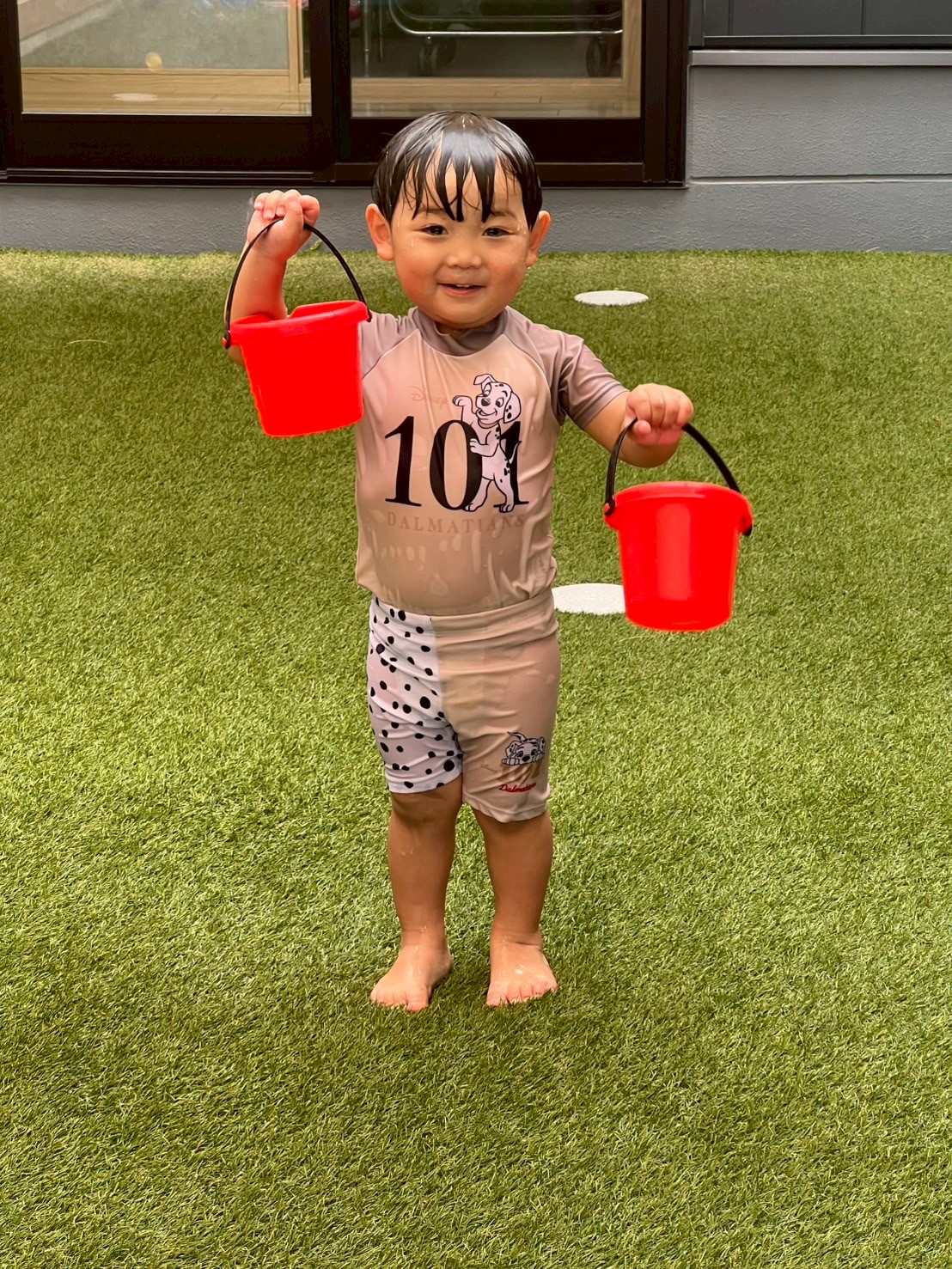 小さな水溜まりができた所にバケツと亀🐢やワニ🐊のお人形を浮かばせたり、噴水⛲プールに入ってシャワーの様に水浴びしたりと今日も水遊びを満喫したぱんだ🐼ぐみのお友達でした😊