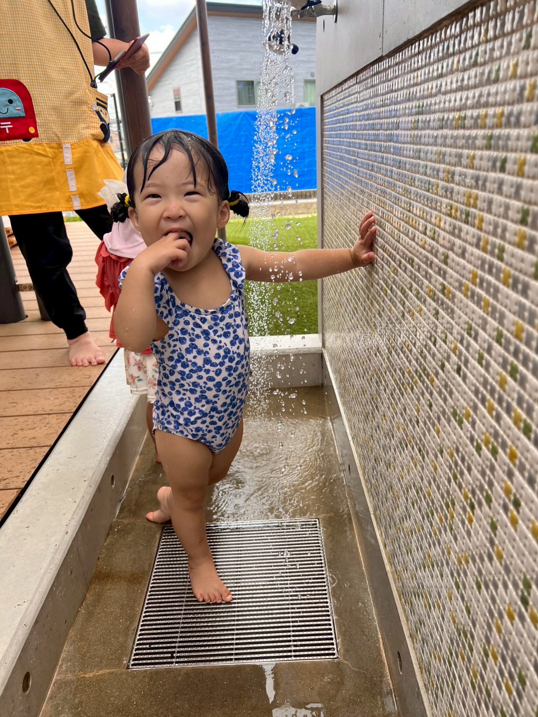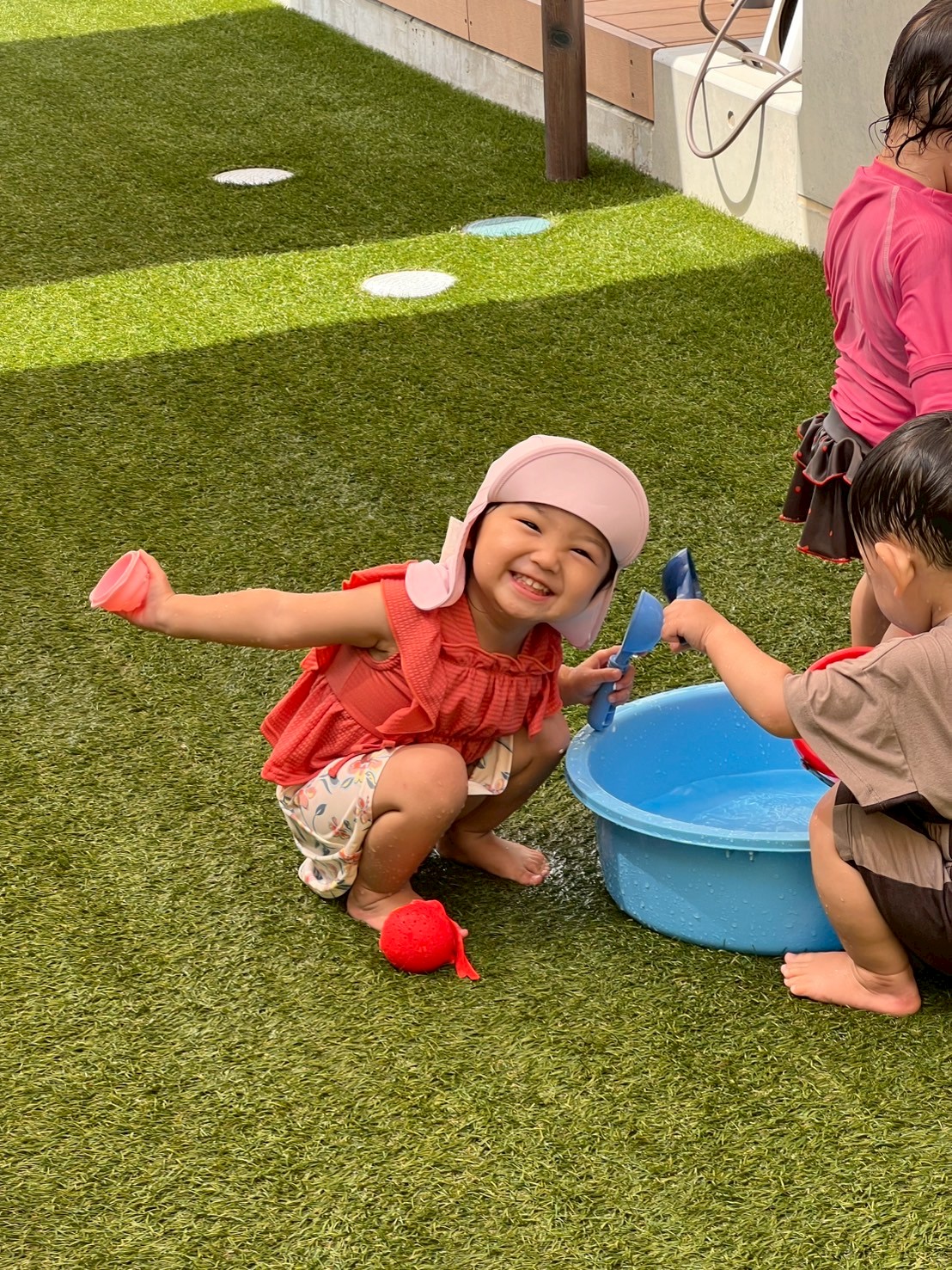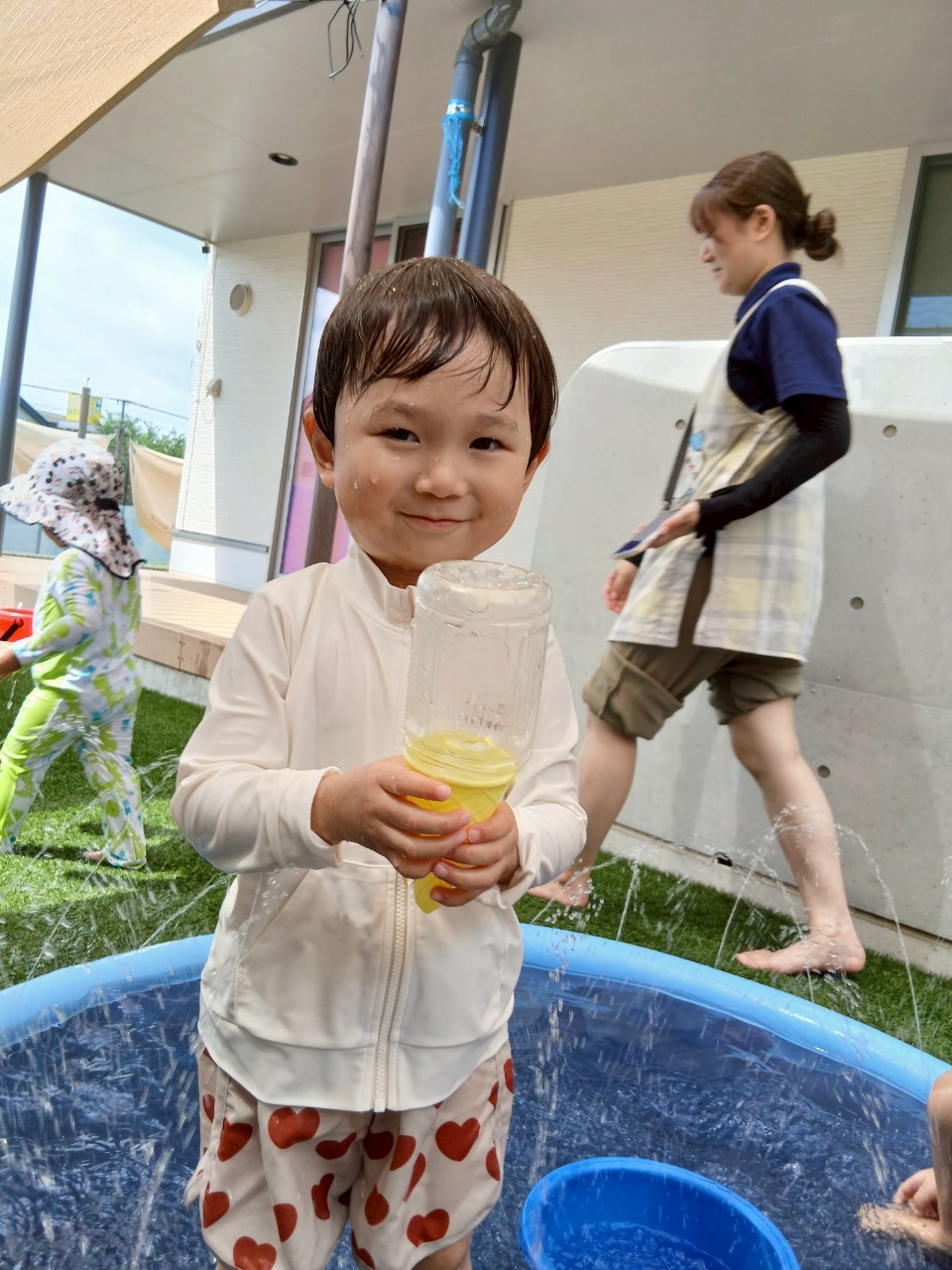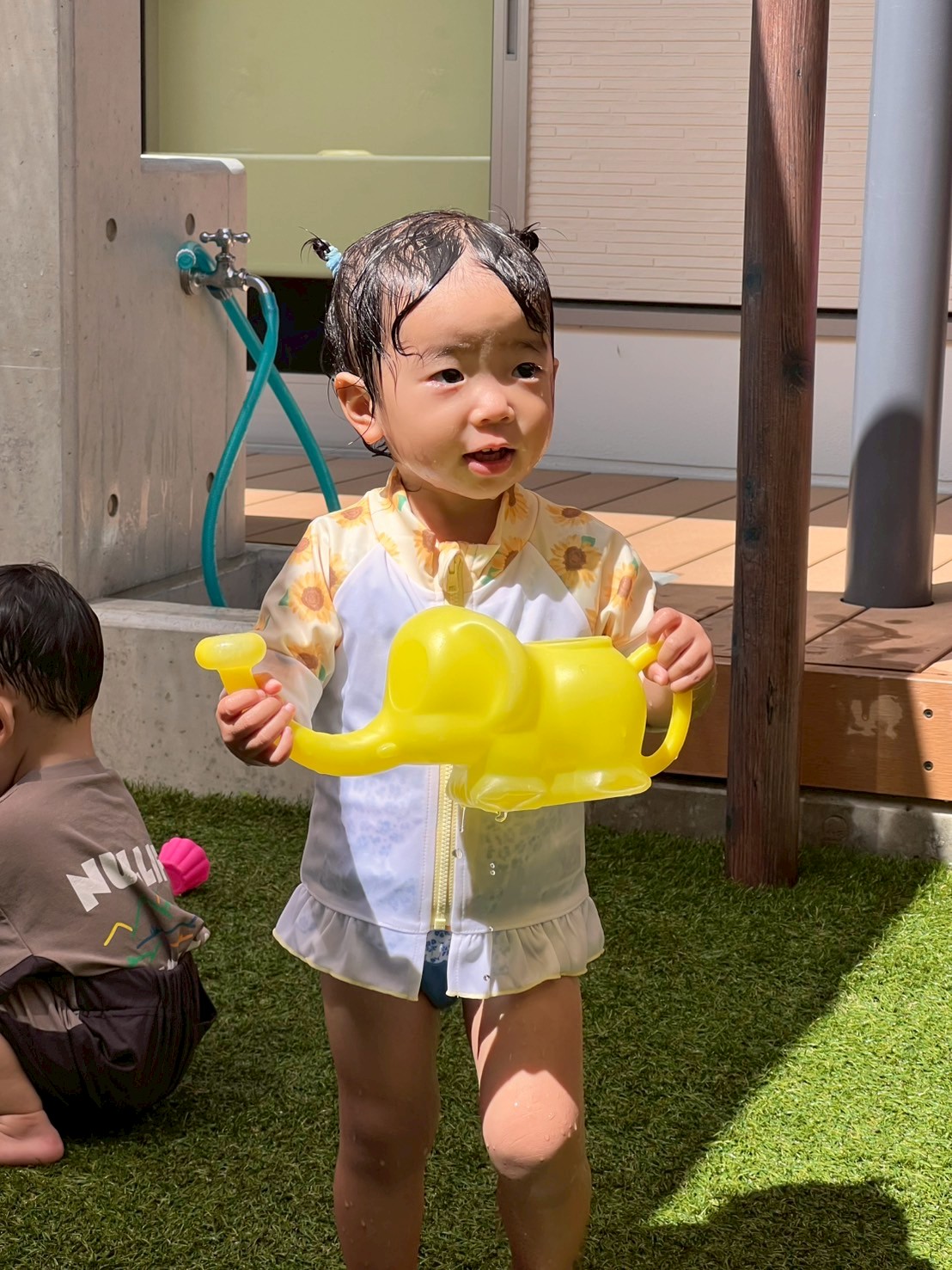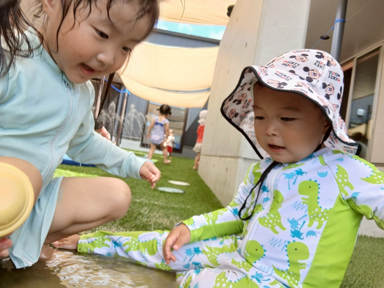 タライやバケツに水を貯めて、おもちゃを浮かべたり、先生と一緒にお水のかけ合いっこをしたりしながら楽しく過ごしました🩵「多めにくださーい!」と水をたっぷり入れてほしい気持ちを言葉で伝える姿も見られ、やりとりを楽しむ姿が可愛らしかったです😊