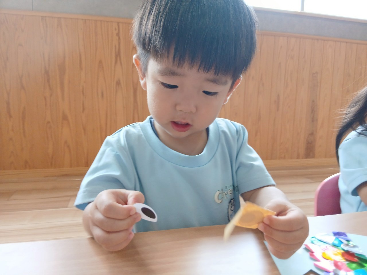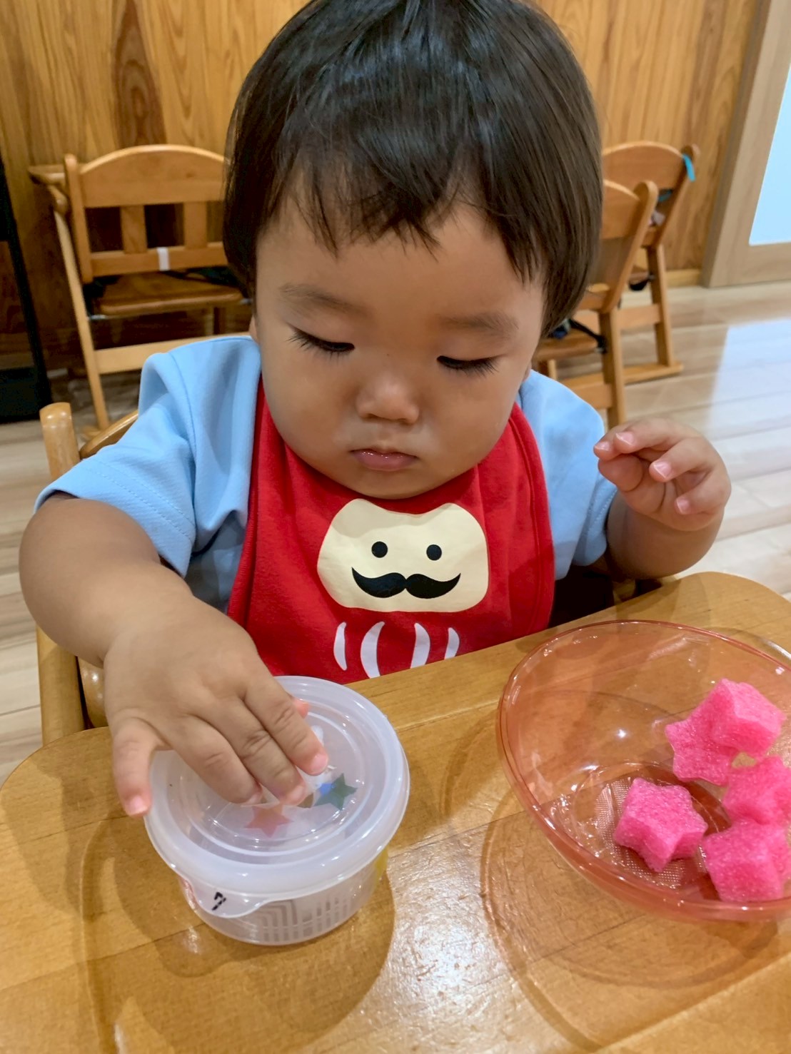 丸形の穴に丸いボールを星形の穴に星形のスポンジを丁寧に一つずつ指でつまんで落としていましたよ❣️りす組🐿️のお友だちも加わり、星形と丸形を交換したりして集中してぽっとん落としを楽しみました😄