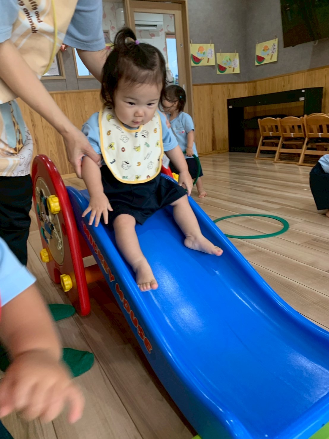 滑り台やボブルスのワニ型やゾウ型で楽しく遊びました😃りす組のお友だちの遊びを真似て遊ぶひよこ組のお友だちもいて、良い刺激になっていましたよ💕