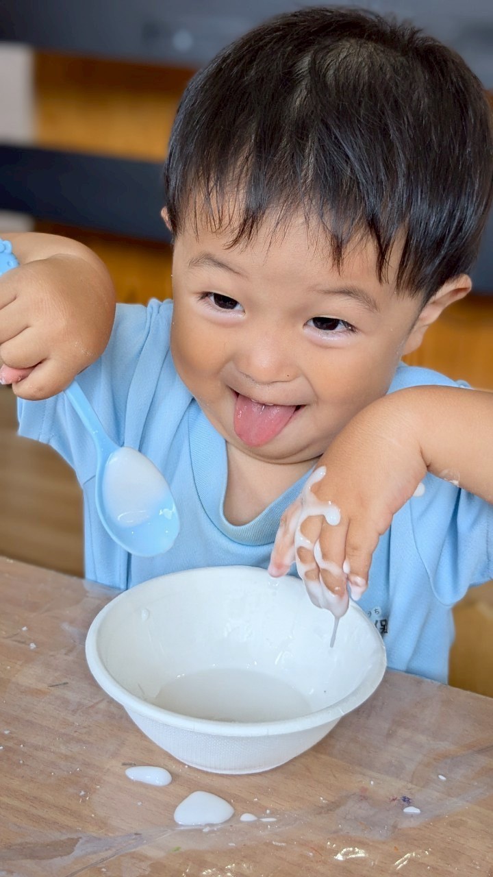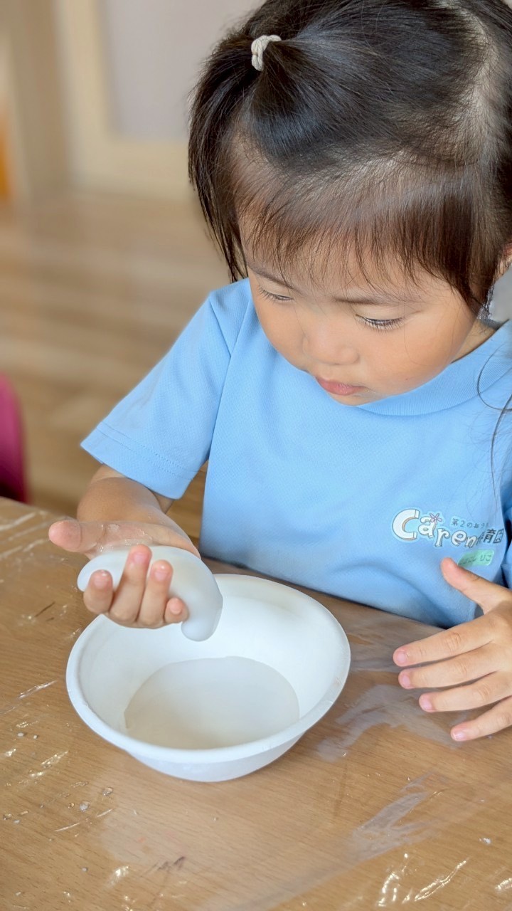 その後は片栗粉スライムを作って遊びました😆✨最初はサラサラの粉だった片栗粉に、水を入れるとトロトロになりみんな不思議そうに触っていました🥹