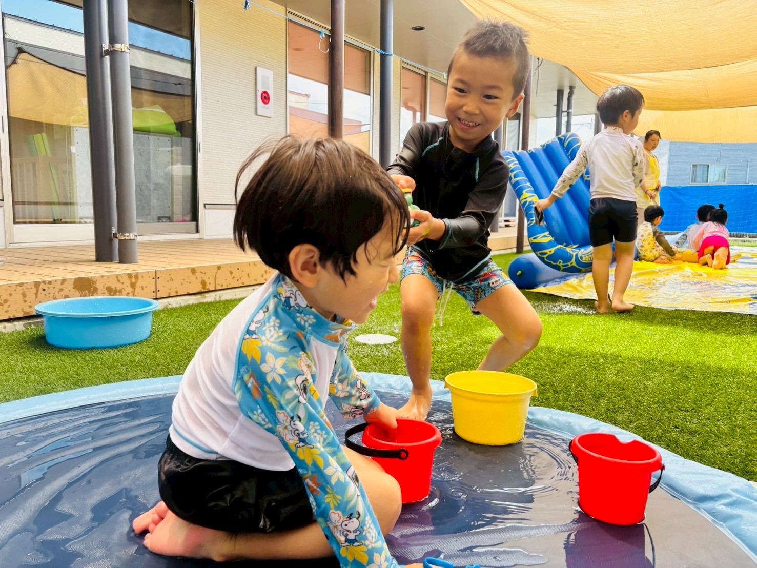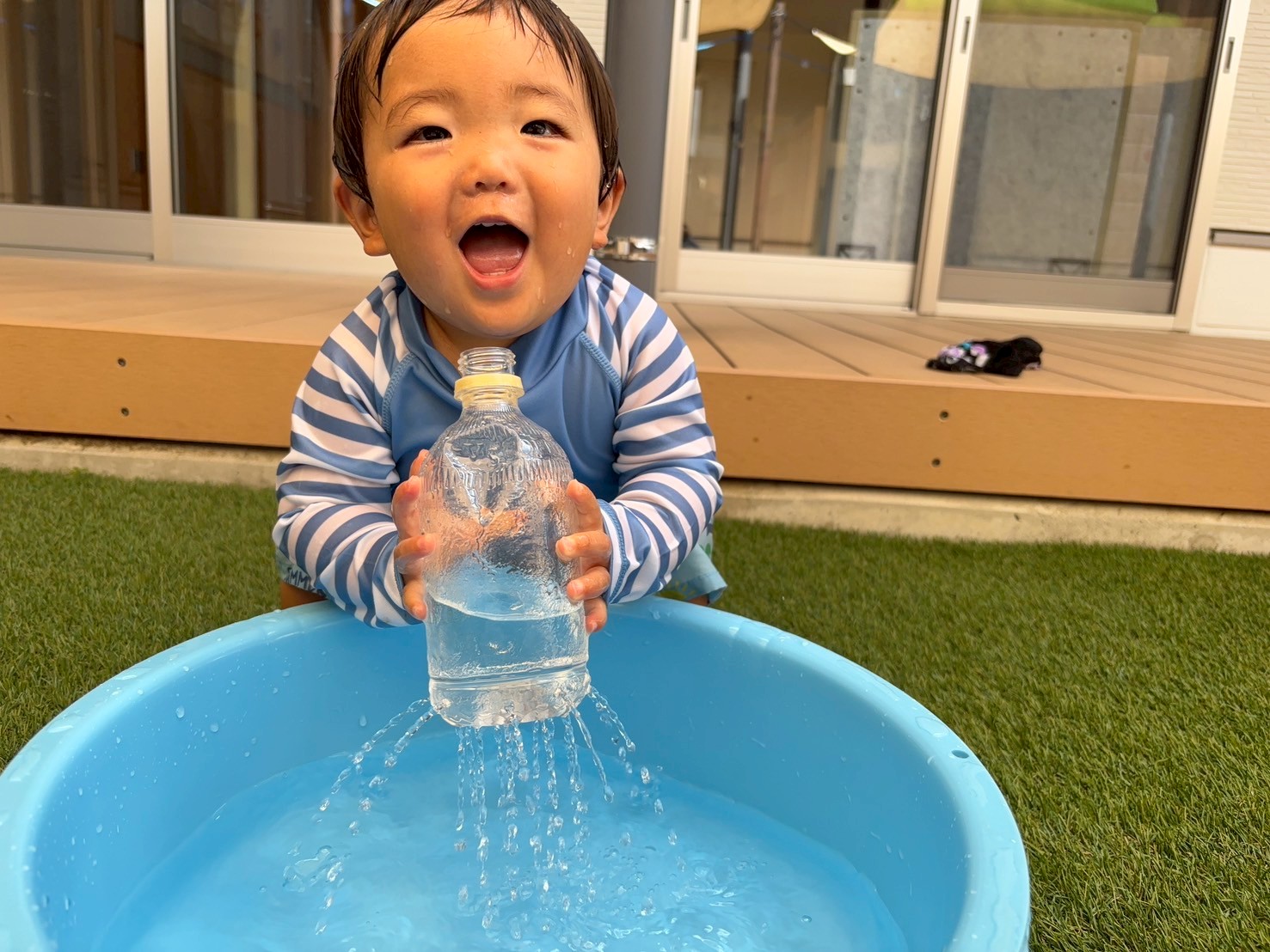 今日は水遊びの日でした❣️見学のお友だちがいて、一人で水遊びをしましたよ💕貸切状態の園庭で、シャワーを浴びたり、クラゲの玩具🪼で遊び、満喫していましたよ😆見学のお友だちはお部屋でボール遊びをしました😊