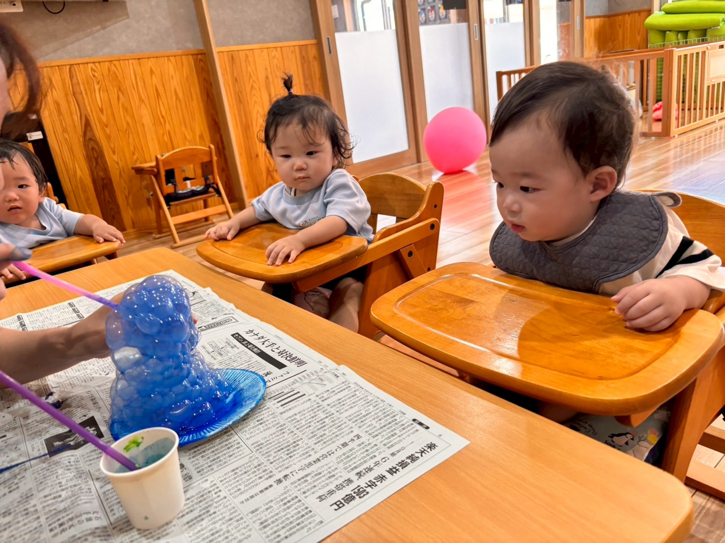 絵の具を溶いたシャボン玉液に先生がストローでぶくぶくと吹くとモコモコと泡立つ様子を目をキラキラ🤩させて見ていましたよ❣️