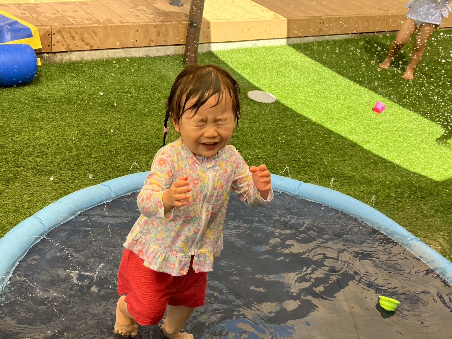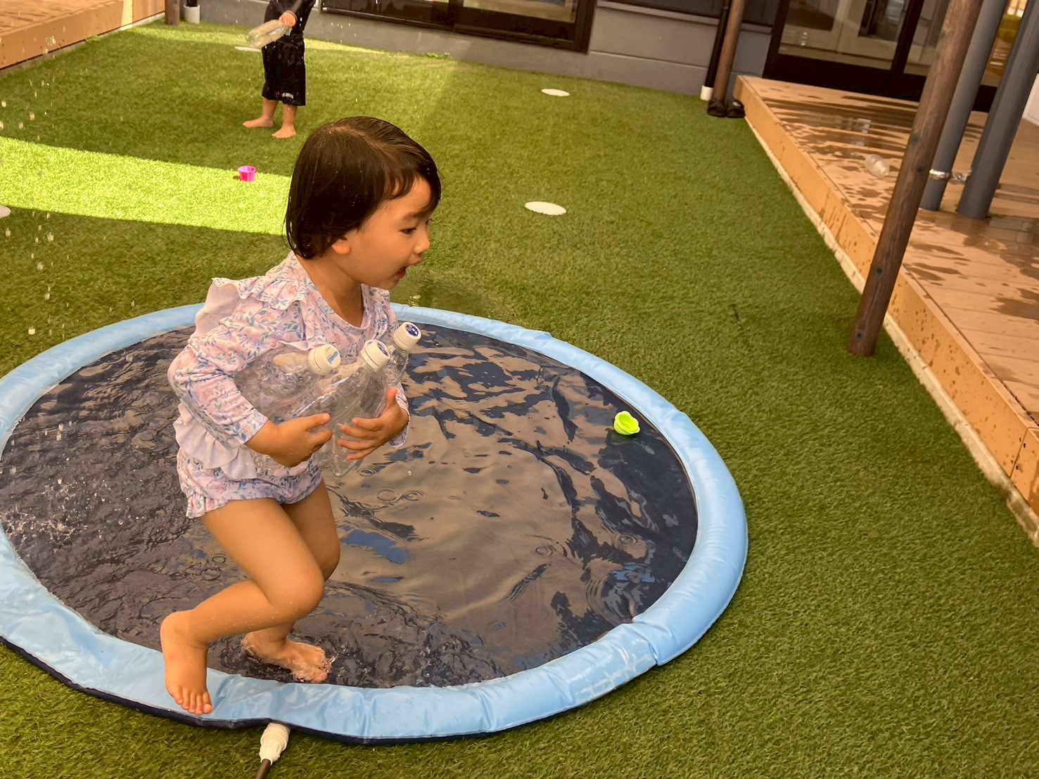 ペットボトルのシャワーを作ってきたので、みんなに渡すと穴から出てくる水に喜んで、何度も水を入れて遊んでくれていました😁❣️ジョウロの貸し借りや、おもちゃを一緒に共有して遊ぶなど水遊びを通してお友達との関わりも学ぶ子ども達でした🥰