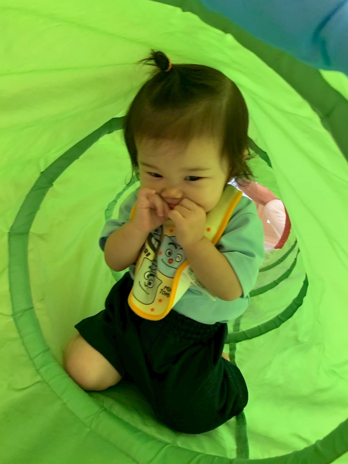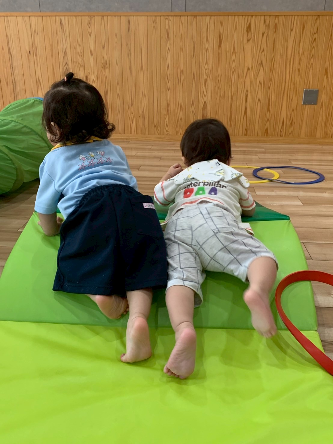 その後はお部屋でサーキット遊びをしました!トンネルを2つ繋げて長〜いトンネルを作ると、中を覗き込んで、ムリムリ!と首を振るお友だちやどんどんトンネルに入っていって一気にくぐり抜けたお友だち😄マットで作ったお山にもハイハイで登りハイハイのまま下りていくお友だち🐥とってもアクティブで元気いっぱい💕