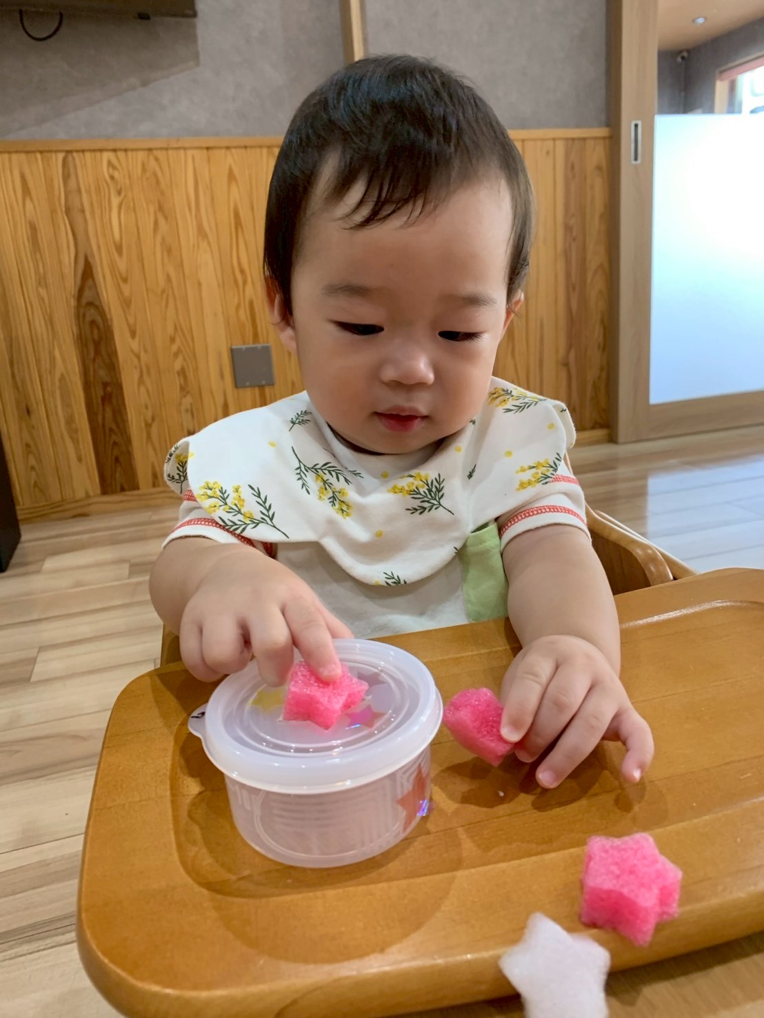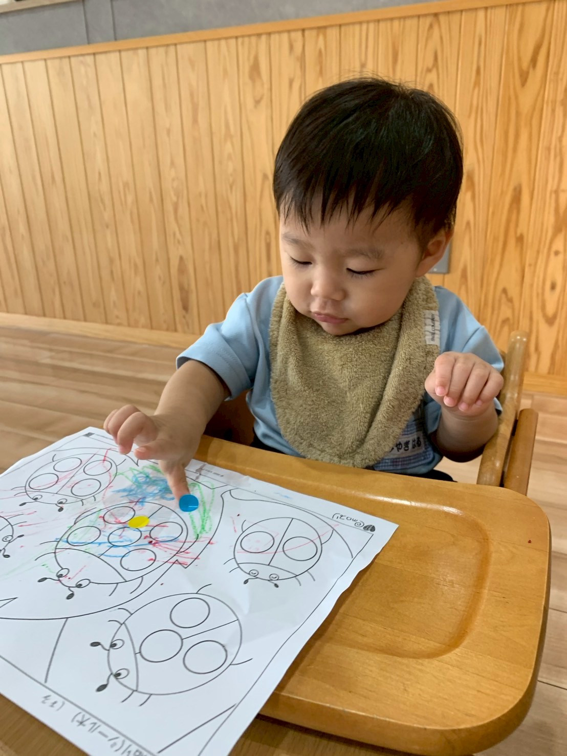 ミニぽっとん落としには慣れてきてポットンポットンと指でつまんで押し込んで、嬉しそうに拍手をしているひよこ🐥さん❣️シール貼りも上手になってきましたよ😊