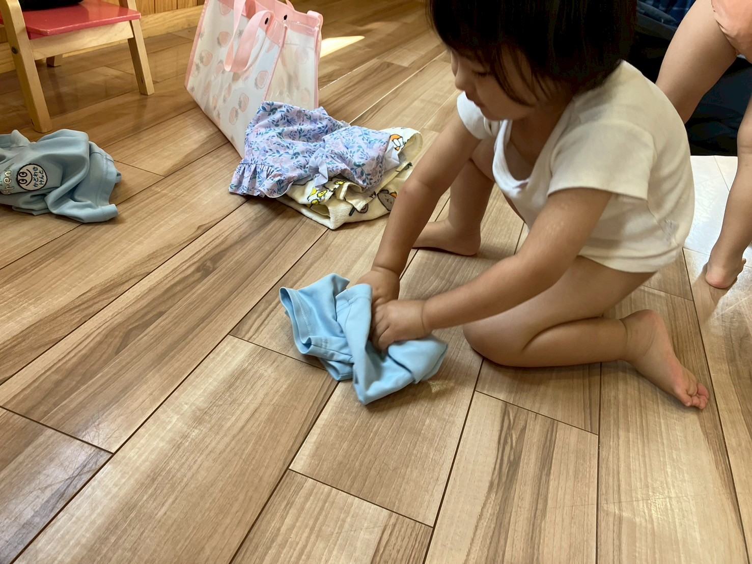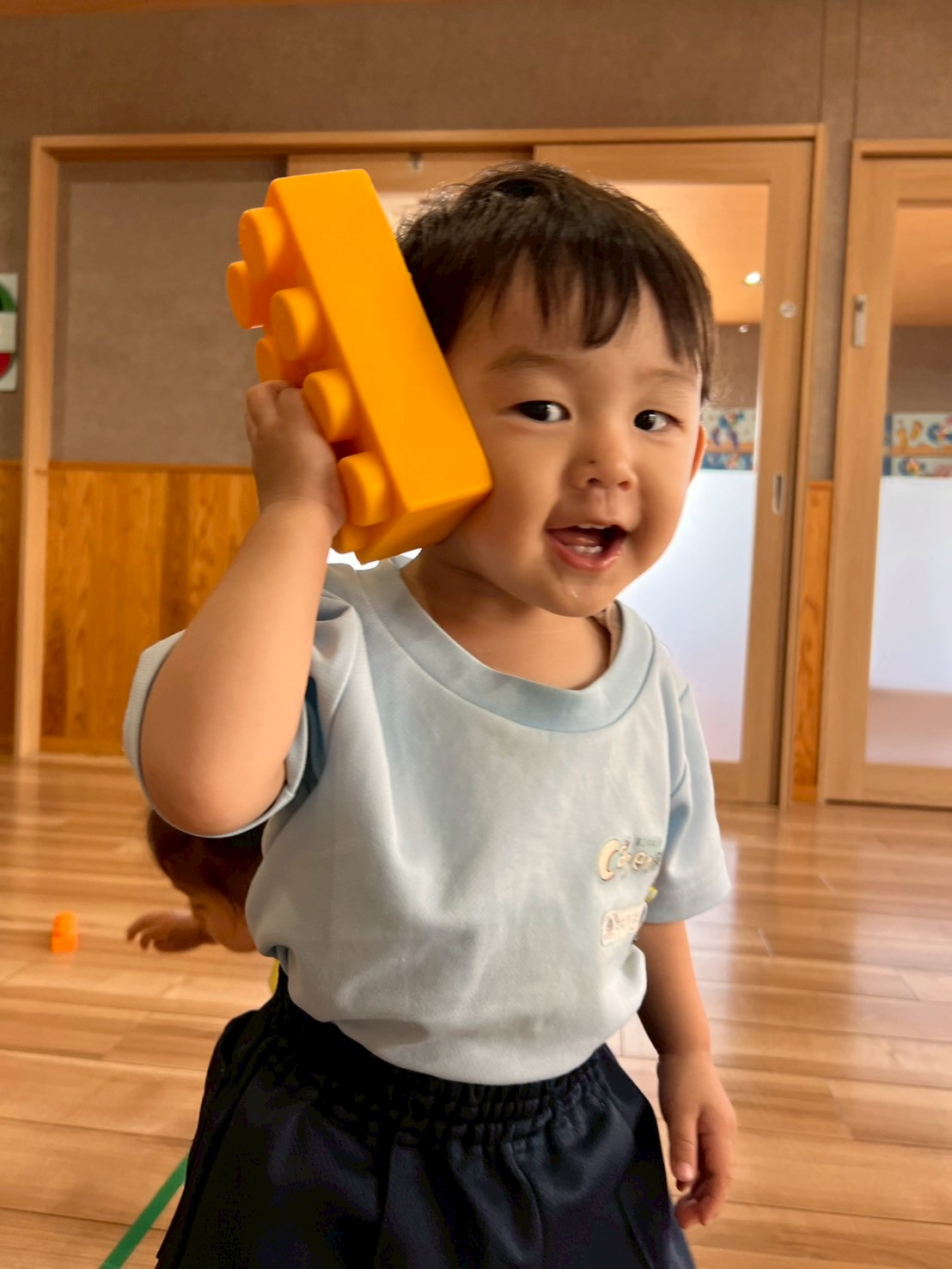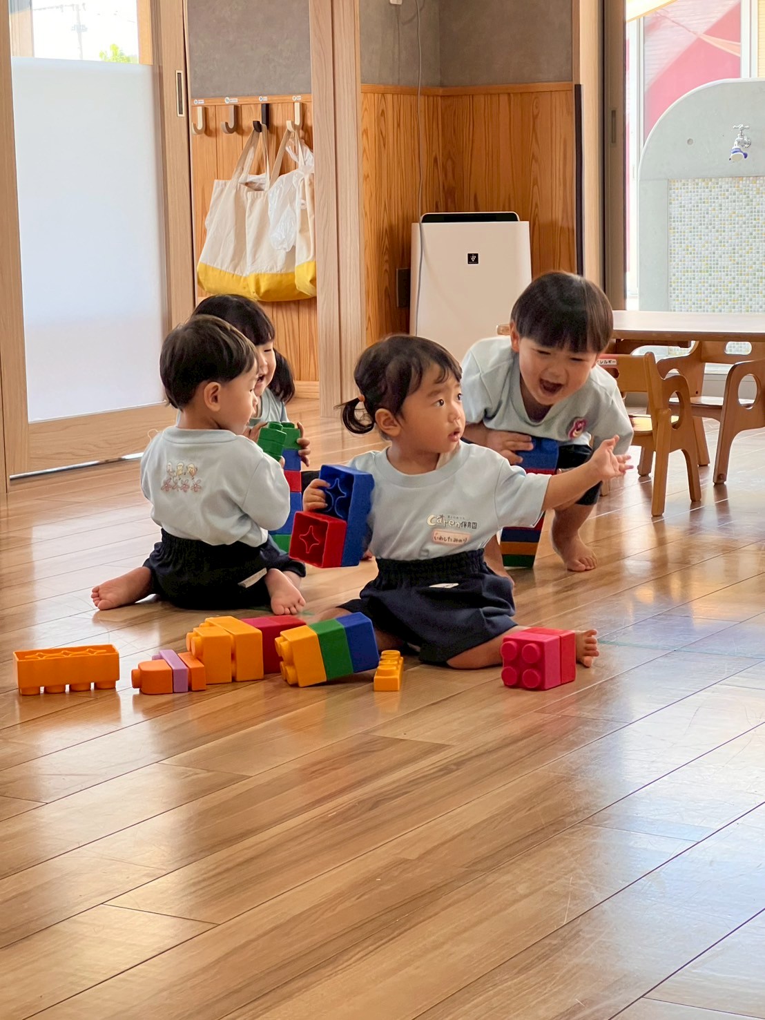 色や模様を見てピタッとはめられるようになった子は、少し難しい形だけのパズルにも挑戦!向きを変えながら「できた👏」とがんばっていましたよ!月齢が低い子はポットン落としで指先を使いながら「もう1回!」と楽しんでいました✨その後は ブロック遊びをし、思い思いに作ったりお友だちと一緒にブロックを積み上げたりと関わる姿がありました😊