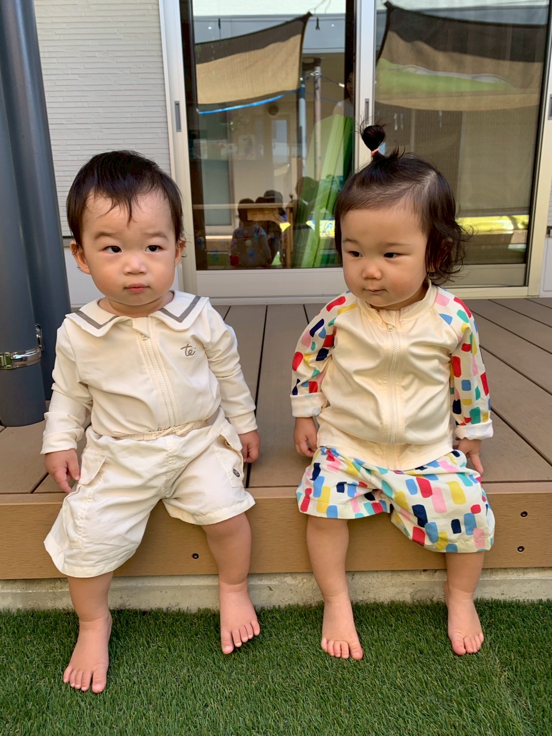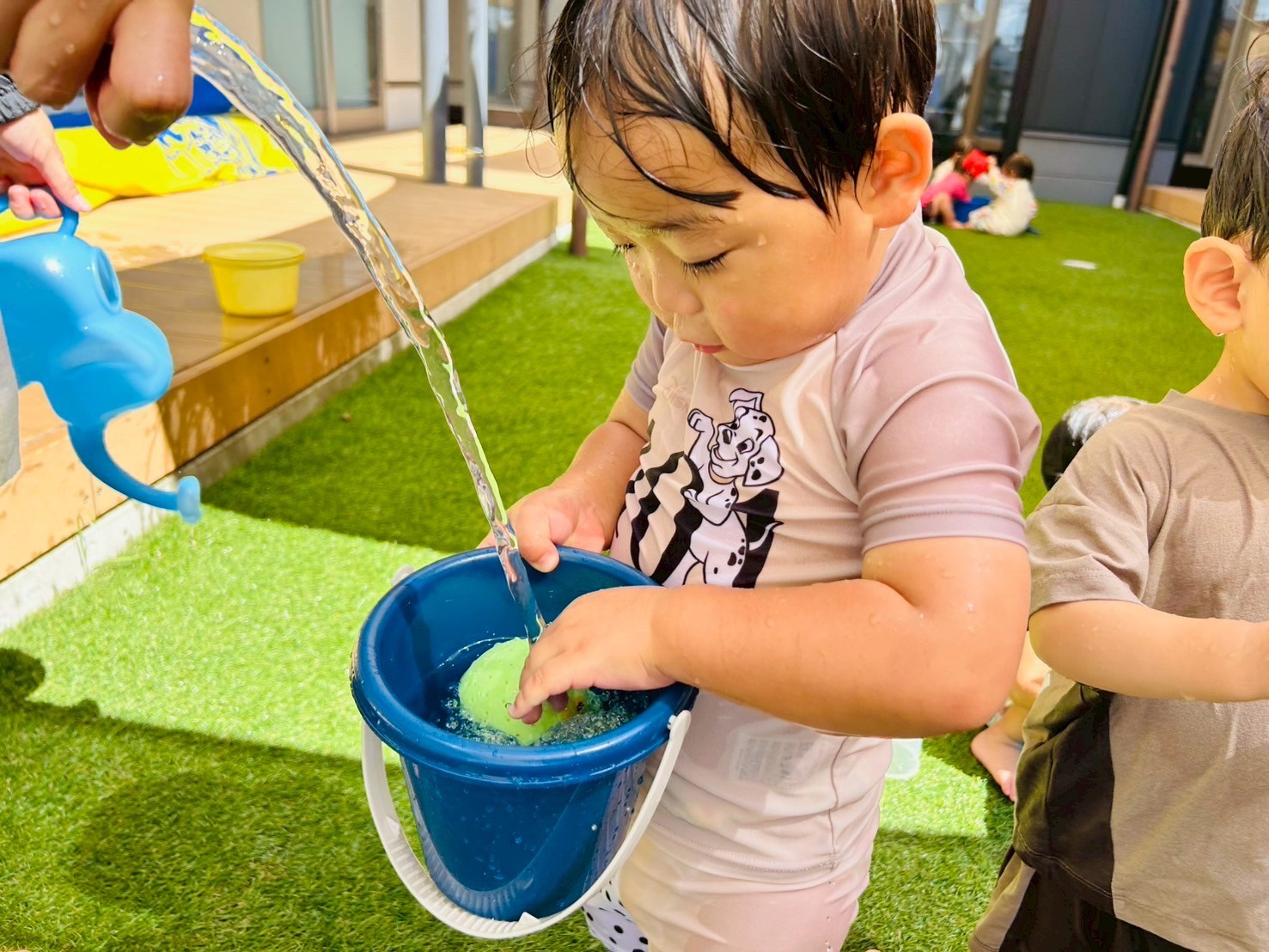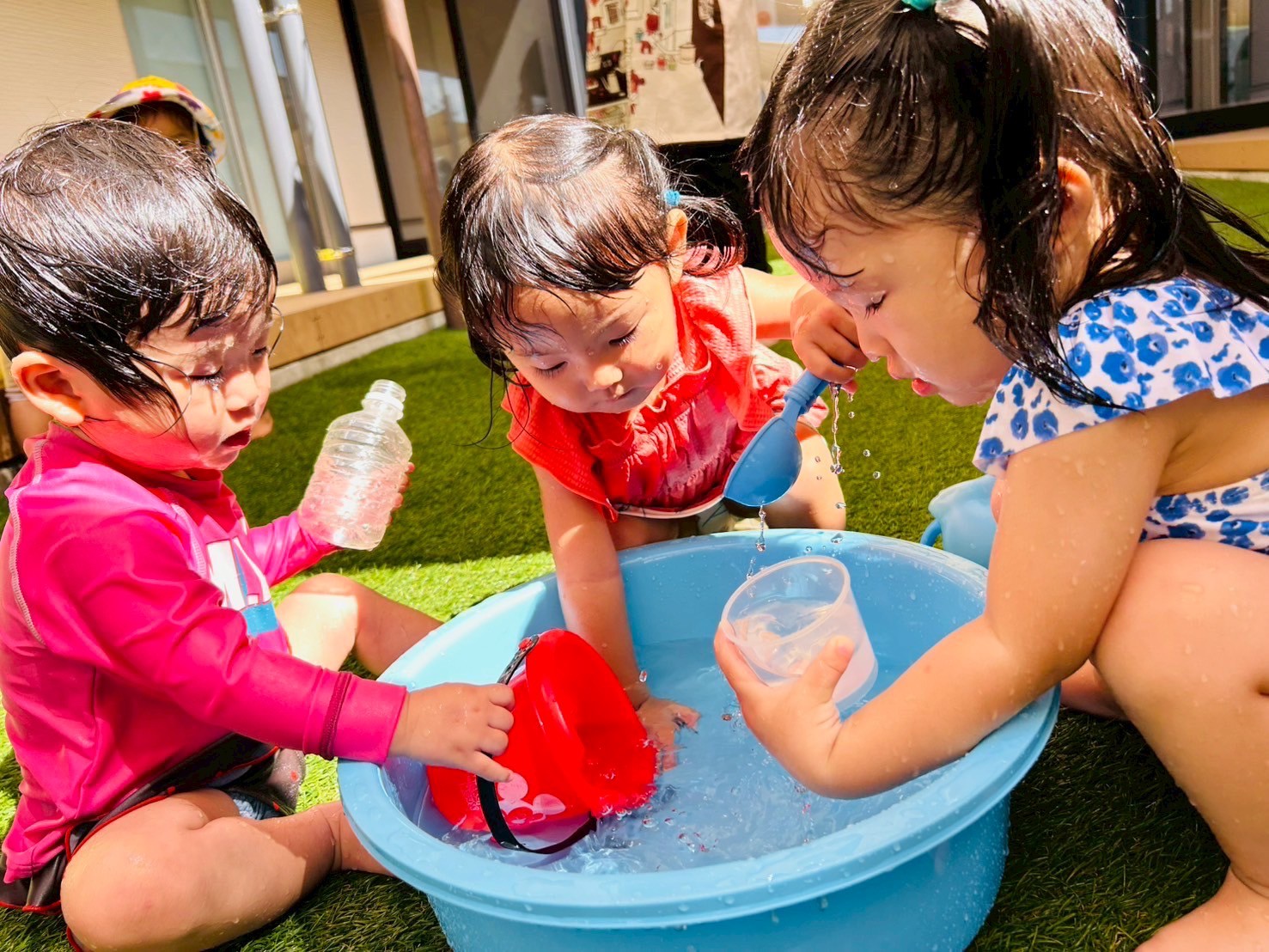 今日は🐿️組さんと一緒に水遊びの日でした😊水着に着替えてる時からウキウキが伝わってきましたよ✨準備運動をして、園庭に出ると、ホースのシャワー🚿を浴びたり、バケツ🪣の水をスコップでかき出したり、全身びっしょりになってニコニコ笑顔のひよこ🐥さんたち❣️りす🐿️組さんたちとタライを囲んでお水をピチャピチャさせて水の感触を楽しんでいました😄