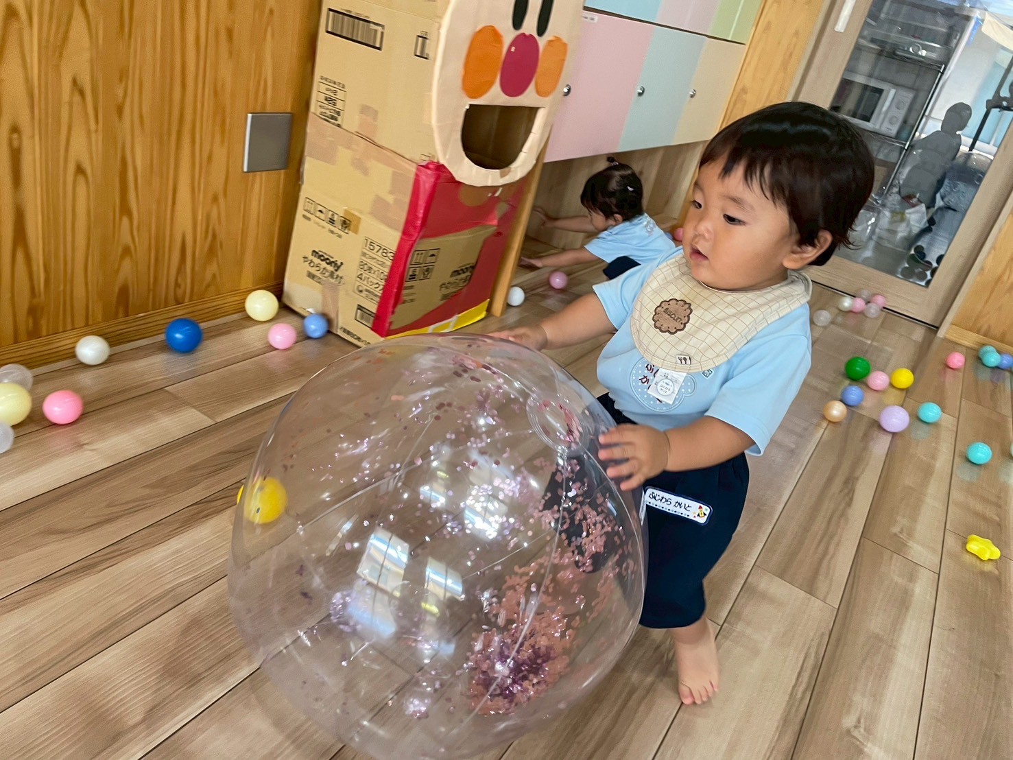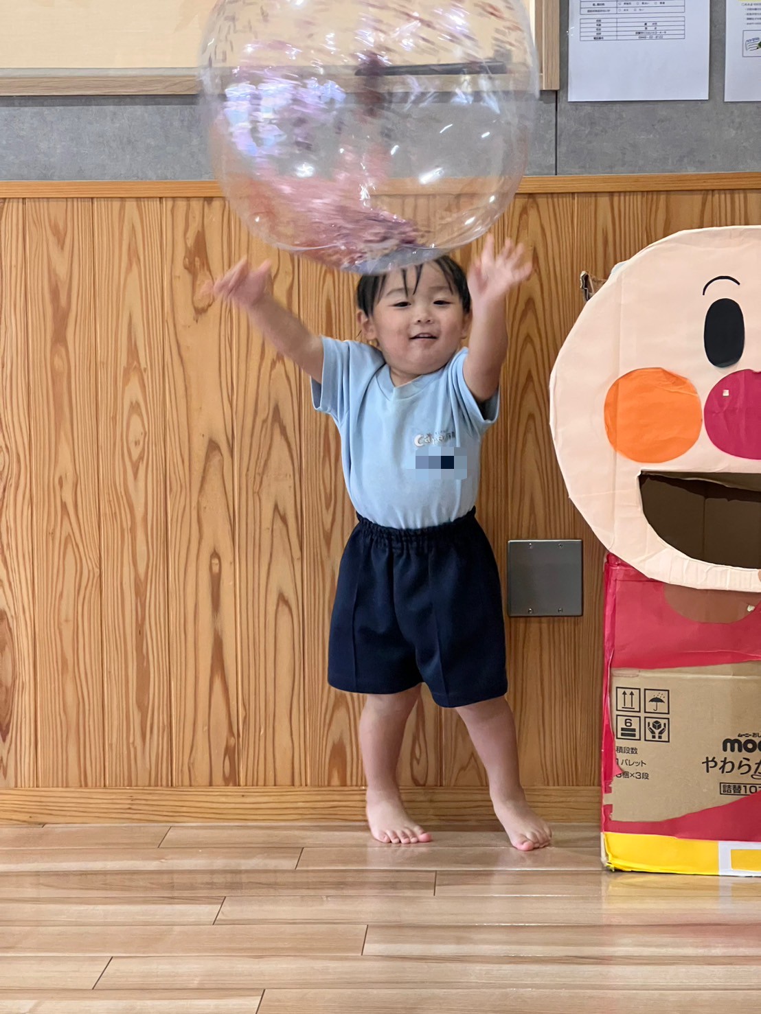 お部屋に入ってからボールで遊びました!ボールを持って「えい!」と投げたり、たくさん両手に持ってアンパンマンのお口に入れたりして楽しみました😊