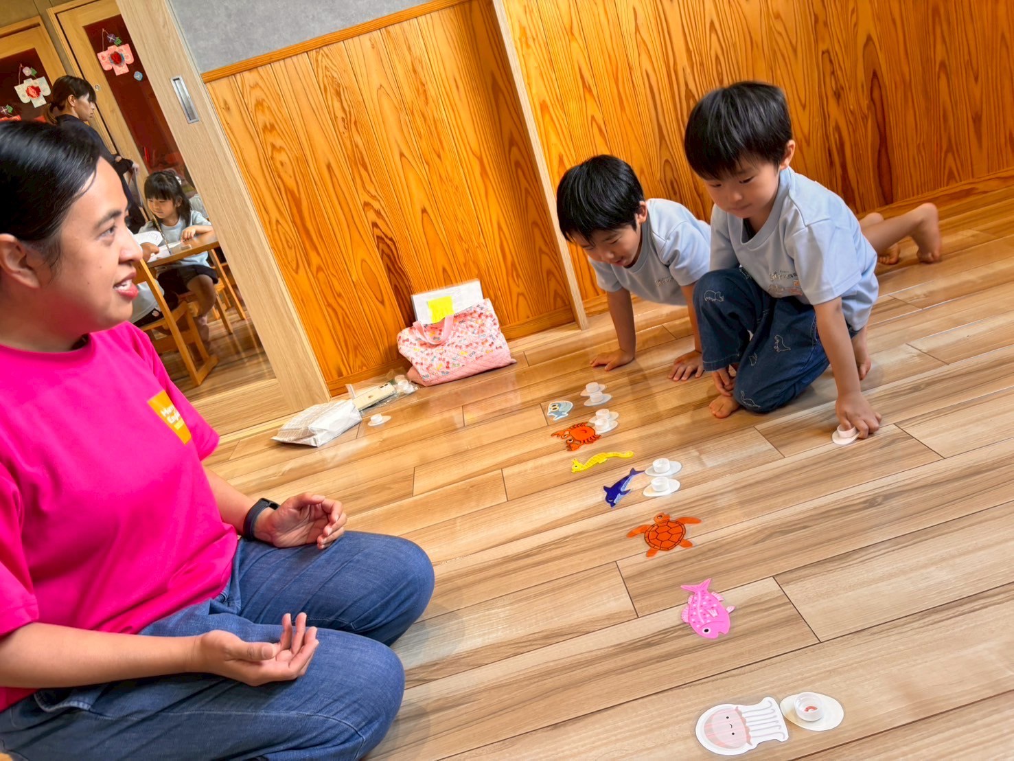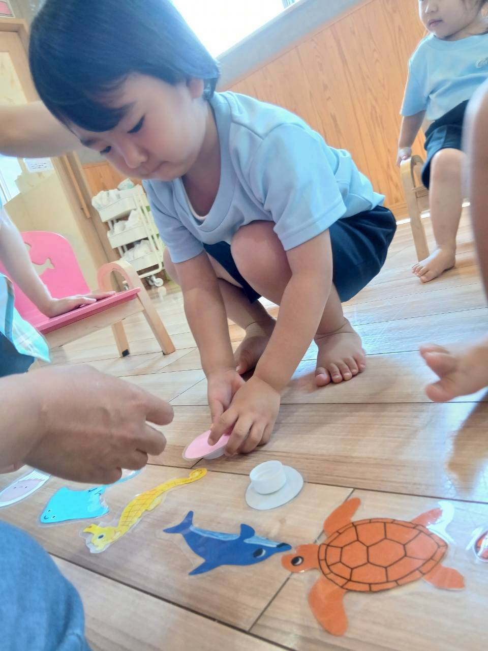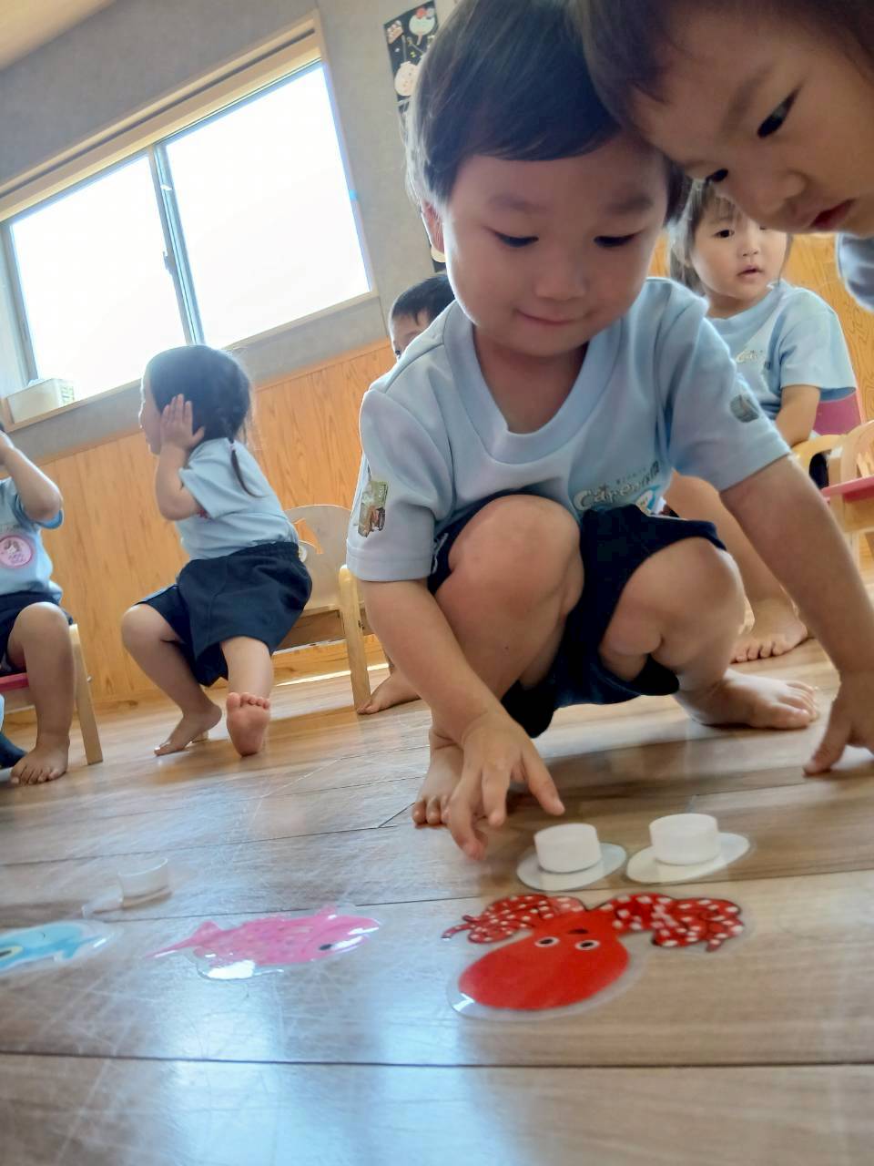 カラフルな卵をめくると海の生き物のシールが貼ってあるので、その生き物の名前を言って同じところに置く勉強をしましたよ🐳🐙