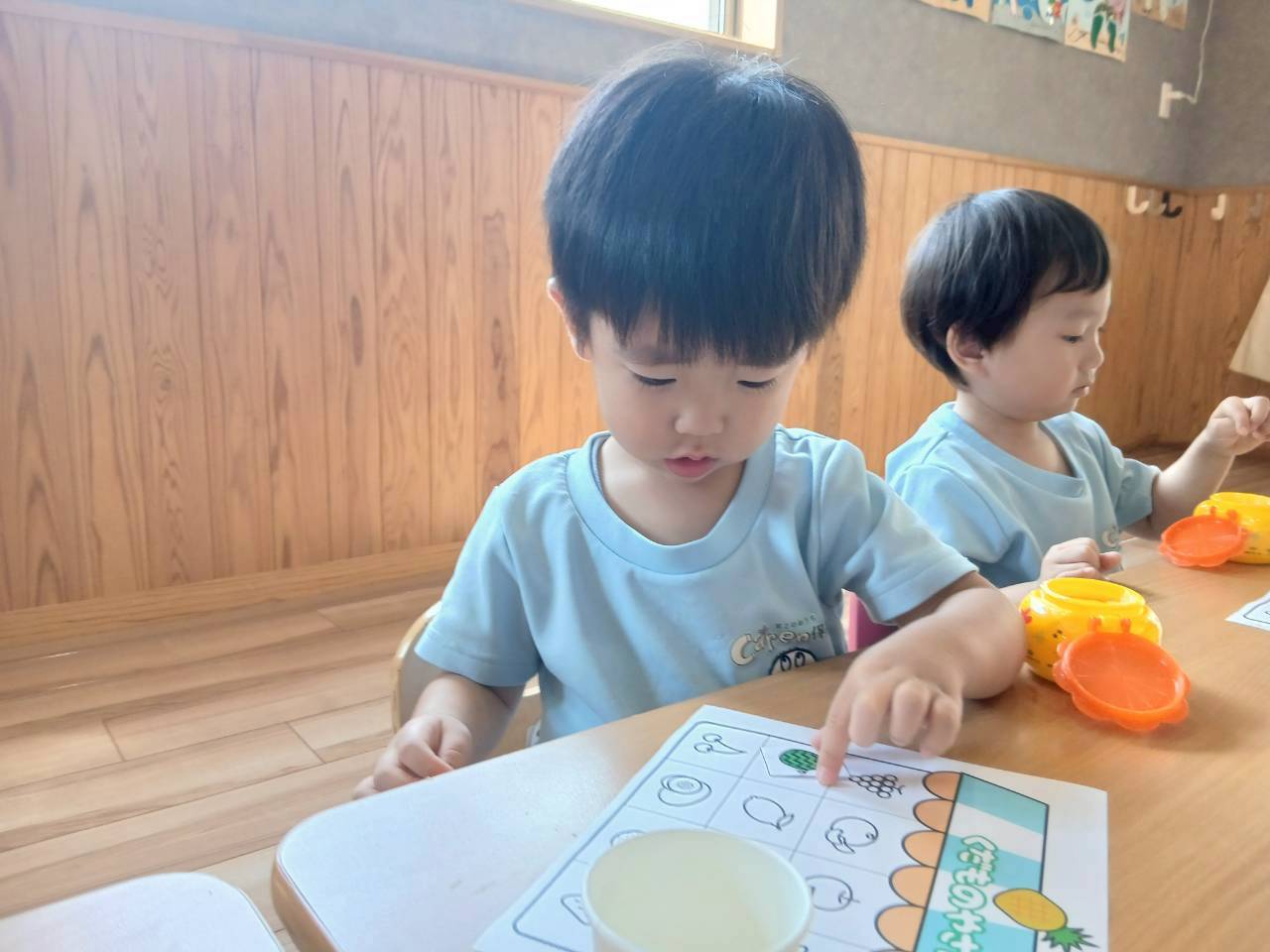 英語教室の後はのり貼りをして遊びました☝️。果物屋さん🍎🍊の台紙に同じ果物の絵にのりをつけていきました。のりの使い方も上手になり美味しそうな果物やさんができましたよ😆
