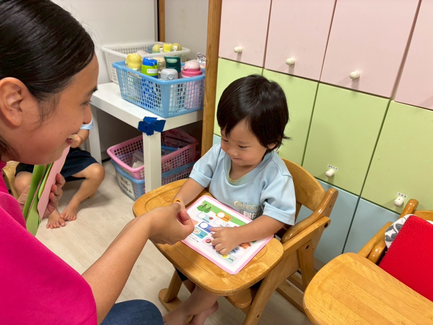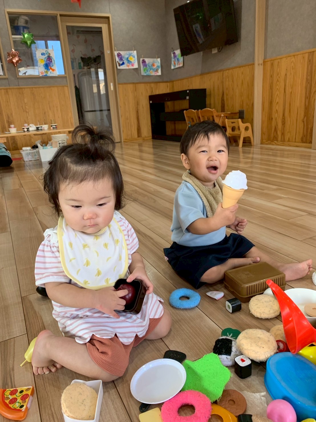 その後は、おままごとをしました🍳カップに果物を入れて先生に持って来てくれましたよ💕カップなどを机に並べたり、可愛いお店屋さんのようになっていました🥰