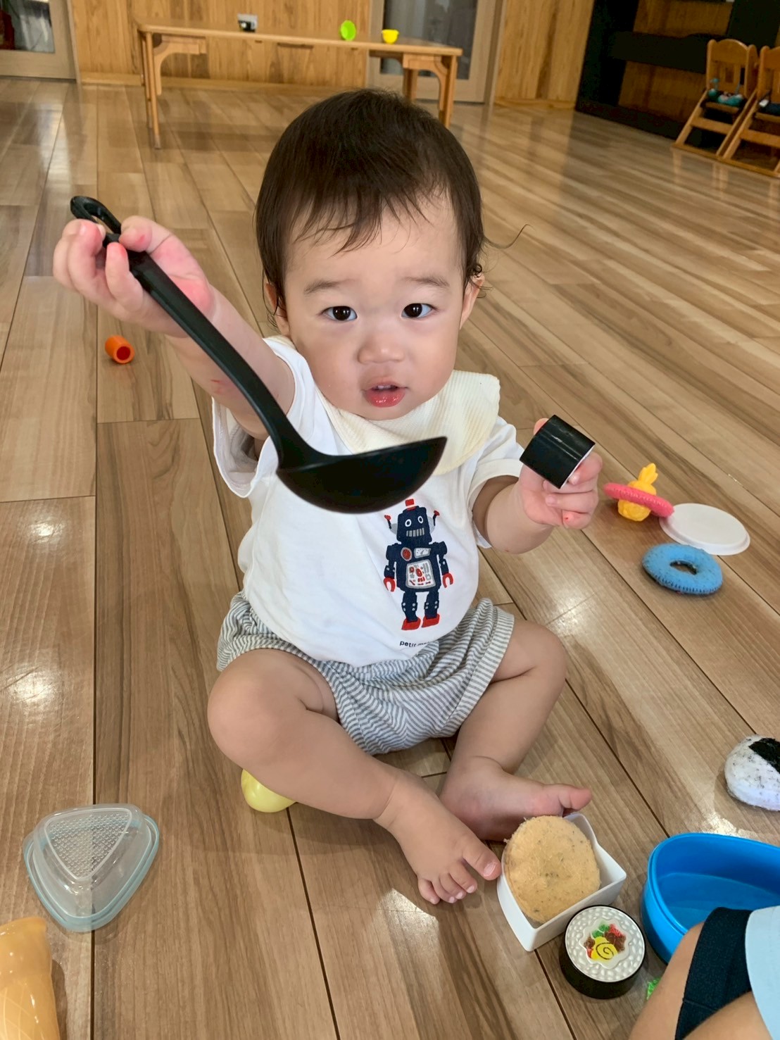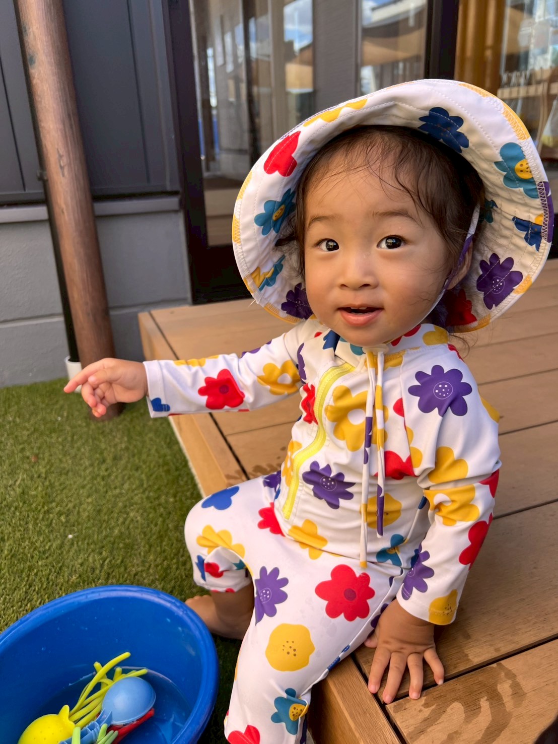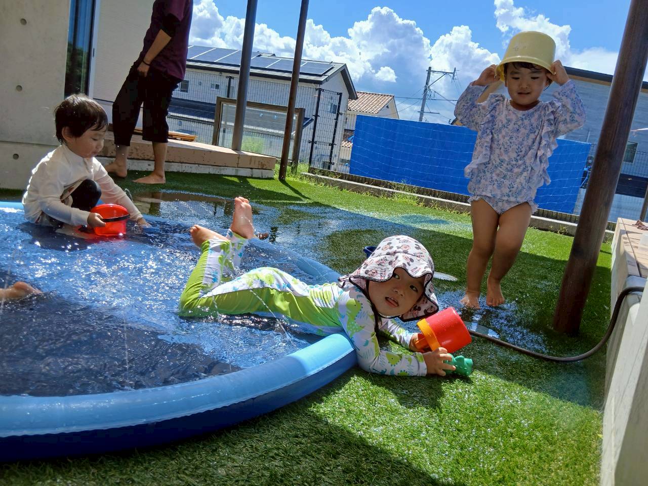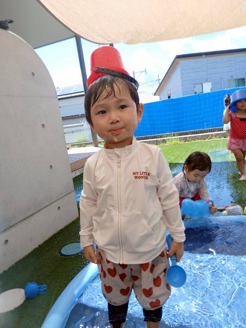 水遊びでは大きな噴水プールに座ってばた足したり、カッパや亀🐢の水鉄砲🔫で遊んだり、バケツをかぶって水しぶきを避けたりして存分に楽しんでいたぱんだぐみ🐼さんでした☺