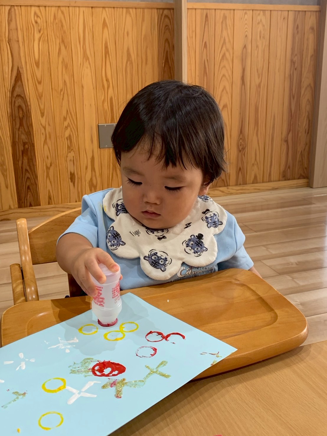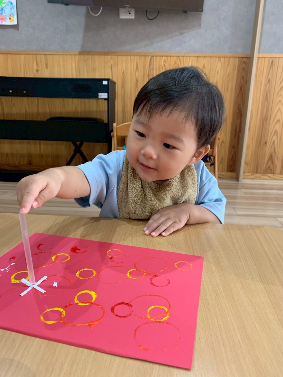 今日は空き容器やトイレットペーパーの芯やストローなどでスタンプをして楽しみました😃先生と一緒に持ってペタペタ!スタンプするたびに色々な色、形ににっこり😊嬉しそうな笑顔が見られました❣️順番が回ってくる間、ポットン落としをして待ちましたよ😄