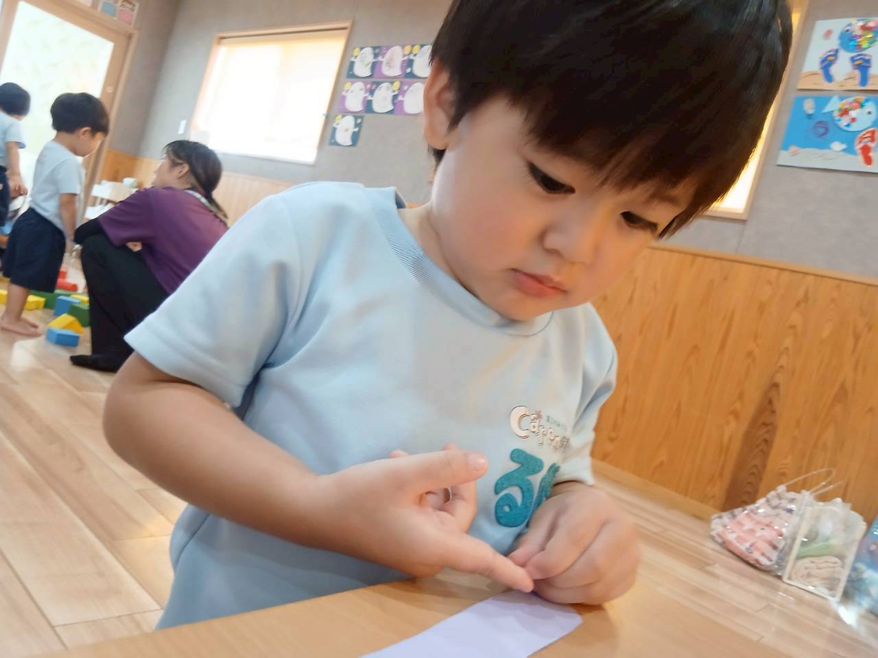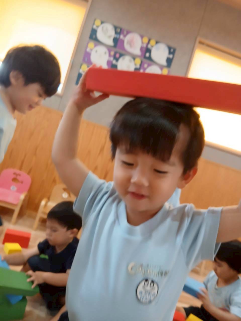 今日は水遊びの前にタンブリンでリズム遊びや働く車🚗のペープサートをしました。「おもちゃのチャチャチャ🎵」や「働く車🚗」の音楽に合わせてタンバリンを叩いたり働く車🚗のペープサートを動かしていましたよ👏。その後はすこしだけウレタンブロックで遊びました。いろいろな型のブロックを積み重ねたり並べたりして遊んでいました。
