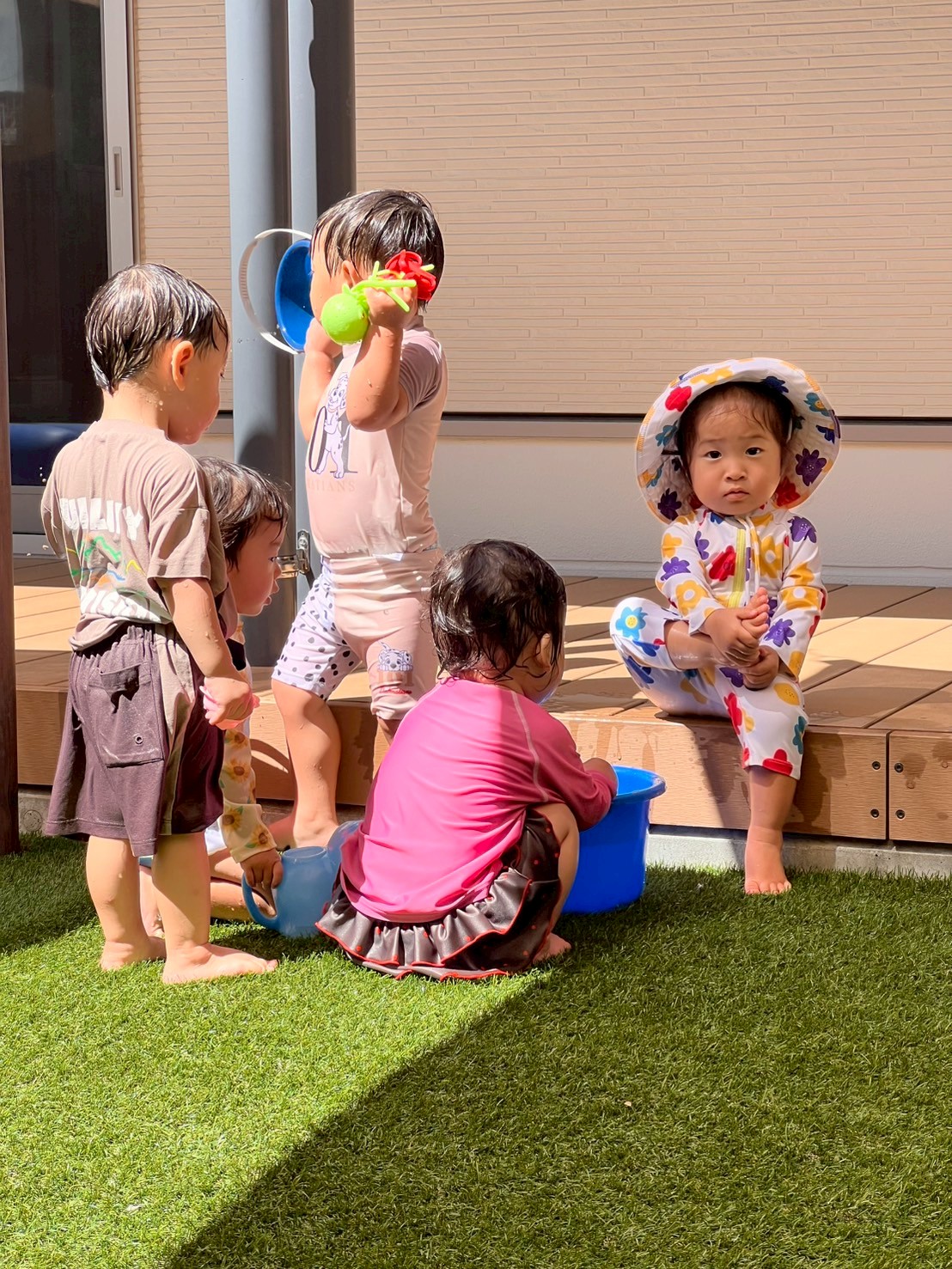 来ていたお友だち全員が参加できて、とてもにぎやかな時間になりました。水鉄砲で掛け合ったり、ぞうさんジョウロやバケツを使って先生の足にかけてくれる優しい姿も見られました🪣💦 シャワーの水しぶきも楽しみ、みんなで集まって遊ぶ姿もありました😊